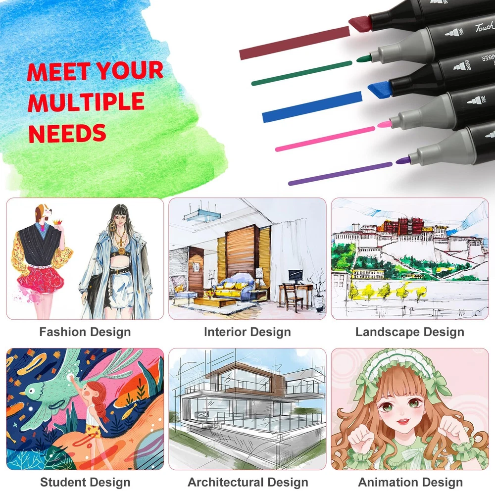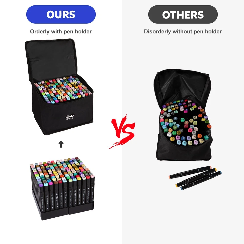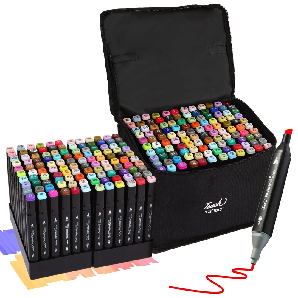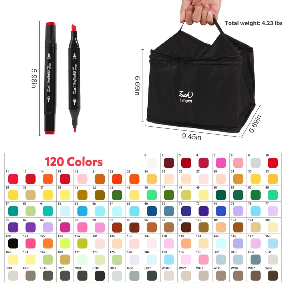 Dual Tip Design Markers: This 120 Colors markers adopted a double-tip design, Broad tip is perfect for quick coverage, fine tip is great for precise details, highlighting, and underlining. Allowing you to write in both thin and thick lines, providing great versatility. Great for use as art markers, sketch markers, permanent markers, alcohol based markers High Quality Alcohol Markers: High quality permanent markers ink, safe, non-toxic, colors to be laid down clean, smooth and evenly, that resists smudging, fading, and doesn’t smudge. This alcohol markers will last through many art projects with high ink volume, also the great cap design that prevents markers from drying out 120 Vibrant Colors: This professional superior artist quality double-ended permanent art markers. Includes all the primary and secondary color shade tones artists need for drawing, sketching,writing, illustrating, shading. Perfect for using on paper, ceramics, glass, wood, cloth and more Color-Coded Caps: The color-coded caps allow for easing in organization and to identify colors quickly. With its ergonomic square-type pen shape, smooth rounded body and comfortable grip, you can use the marker pens for a long time without feeling tired Portable and orderly: Comes with a zipper carrying bag for storing, Make it easy and convenient to portable carry for traveling or outdoor work. and also comes with extra pen holder for neatly arrange the markers