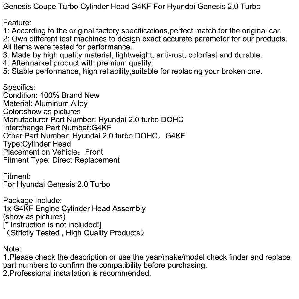 You may also like Cylinder Head CM5G6C032CB For FOCUS 2015-2018 1.0L (Turbo) CM5Z-6049-E US 489.85 USD Free shipping G4GC Cylinder Head Assembly For Hyundai Tucson 2.0 Kia Sportage 2.0 2008-2010 814.85 USD Free shipping Cylinder Head Assembly G4FJ For Hyundai Accent Kia Soul 1.6L 12-19 449.85 USD Free shipping 2.0T Engine Cylinder Head & Gaskets Kit 06H103064L Fit Audi A4 A5 Q5 A6 TT CAEB 999.85 USD Free shipping Bare Cylinder Head 403 / 117 For Jeep 2.5L 1989-2002 US 259.85 USD Free shipping Left+Right Cylinder Head For Toyota 4Runner Pickup 1988-1995 3.0L SOHC 3VZE US 649.85 USD Free shipping 18mm Cylinder Head Stud Kit&Head Gasket For Ford 6.0L V8 Diesel 2003-2007 US 185.85 USD Free shipping Cylinder Head Assembly Fit for Audi A4 A6 VW Jetta Golf Passat Seat Skoda 799.85 USD Free shipping Engine Cylinder Head Assembly G4FD For Hyundai Kona Kia Soul Seltos 1.6L 12-19 H 459.85 USD Free shipping Cylinder Head Assembly w/Head Gasket Bolts Kit G4KJ For Hyundai Kia 2.4L 11-20 H 485.85 USD Free shipping Engine Cylinder Head Gaskets Kit Fit Audi A4 Q5 TT 2.0 TFSI CAEA CAEB CDNB CDNC 62.85 USD Free shipping Cylinder Head Bolts Kit 134-3610 For Chevrolet Gen III IV LS Engines 2004+ 105.31 USD 110.85 USD Free shipping 5% off Complete Engine Cylinder Head Assembly Crankshaft +Gasket Kit For Audi A4 Q5 H0 999.85 USD Free shipping G4KE Engine Cylinder Head Assembly For Hyundai Azera Tucson Kia Forte 2.4L H10 499.85 USD Free shipping Cylinder Head Assembly Crankshaft For AUDI A4 A5 A6 Q5 2.0 DOHC TFSI (EA888) US 699.85 USD Free shipping 55573669 Cylinder Head Assembly For Chevrolet Cruze Sonic Encore Trax 1.4L Turbo 749.85 USD Free shipping NEW-00004 Cylinder Head G4KF For Hyundai Genesis 2.0 Turbo Cylinder Head G4KF For Hyundai Genesis 2.0 Turbo Feature: 1: According to the original factory specifications,perfect match for the original car. 2: Own different test machines to design exact accurate parameter for our products.All items were tested for performance. 3: Made by high quality material, lightweight, anti-rust, colorfast and durable. 4: Aftermarket product with premium quality. 5: Stable performance, high reliability,suitable for replacing your broken one. Specifics: Condition: 100% Brand New Material: Aluminum Alloy Color:show as pictures Manufacturer Part Number: Hyundai 2.0 turbo DOHC Interchange Part Number:G4KF Other Part Number: Hyundai 2.0 turbo DOHC,G4KF Type:Cylinder Head Placement on Vehicle:Front Fitment Type: Direct Replacement Fitment: For Hyundai Genesis 2.0 Turbo Package Include: 1x G4KF Engine Cylinder Head Assembly (show as pictures) [* Instruction is not included!] (Strictly Tested , High Quality Products) Note: 1.Please check the description or use the year/make/model check finder and replace part numbers to confirm the compatibility before purchasing. 2.Professional installation is recommended. ⭐ COMPATIBILITY CHECKLIST ✔ Check description and vehicle compatibility chart ✔ Compare OEM numbers ✔ Review connector photos ✅ Free verification: Message us first 1: Full VIN (17-digit) 2:OEM # from your original part 3:Old part photos 4:Vehicle Year/Make/Model/Engine Size Shipping Return Warranty Feedback ✔ Order Processing: Ships within 3 business day (Mon-Fri, excludes holidays). ✔ Delivery Time: 3-7 business days (continental U.S.). ✔ Tracking Info: Provided automatically via eBay. ✔ All orders will be shipped through USPS, UPS and Fed E x depends on the weight of the items. ✔ Shipping notification will be emailed to you once package has been shipped ✅Fast & Reliable Shipping – Your order is our priority! ✅We package all items with care to ensure safe arrival! ✅ International Shipping: Available to 50+ countries (calculated at checkout). Customs/duties may apply for international orders. We Want You to Love Your Purchase! 💙 Our 60-day return policy protects you: ⭐ STEP 1: Message Us First - we often solve issues without returns! ⭐ STEP 2: If the return is due to change of mind, select "Didn't like item" or "Ordered by mistake" . For tem not as described, provide details and photos to help us assist you promptly. Why Contacting Us First Helps You: • Faster solutions (often within 48 hours !) • Possible instant refund or replacement options • Personalized return instructions for your case For Your Protection: • We carefully inspect all returns • Please use tracking when shipping back • "Not as described" returns require photos/video for fastest resolution Help us serve you better by contacting us first! 😊 ⭐ HASSLE-FREE WARRANTY • 90-365 Day Coverage (varies by product - see listing details) ❌ Exclusions: 🔸Physical damage (drops/accidents) 🔸Installation errors (YouTube tutorial links provided) 🔸Modified/tuned vehicles ⚠️ Claim Process: 🔹Message us with video proof + order # 🔹Get prepaid return label (if approved) 🔹Choose: Replacement / Refund 📢 Our Feedback Promise ⭐ Your Satisfaction Matters Most! We work hard to earn your 5-star experience. Before leaving feedback, please: 1️⃣ Contact us first if there’s any issue – we’ll make it right! 2️⃣ Verify your item meets expectations (check sizing/compatibility if applicable) 3️⃣ Allow reasonable time for shipping/delivery 🛠 Problem Resolution Guarantee: • Message us within 3 days of delivery for: ✔Refunds/Replacements ✔Missing parts inquiries ✔Product guidance 🚫 Please Avoid: • Feedback related to shipping carriers (we can’t control delays) • Comments about pricing (set by market value) • Claims without prior contact attempts 📦 General Reminders: • Check your spam folder for tracking emails • Inspect packages before discarding outer boxes • Save receipts for warranty purposes About Us About Item All items sold by us are being described to the best of our abilities, as accurate as possible, and with utmost conscientiousness on our part. However, to avoid any potential oversights, I respectfully request your