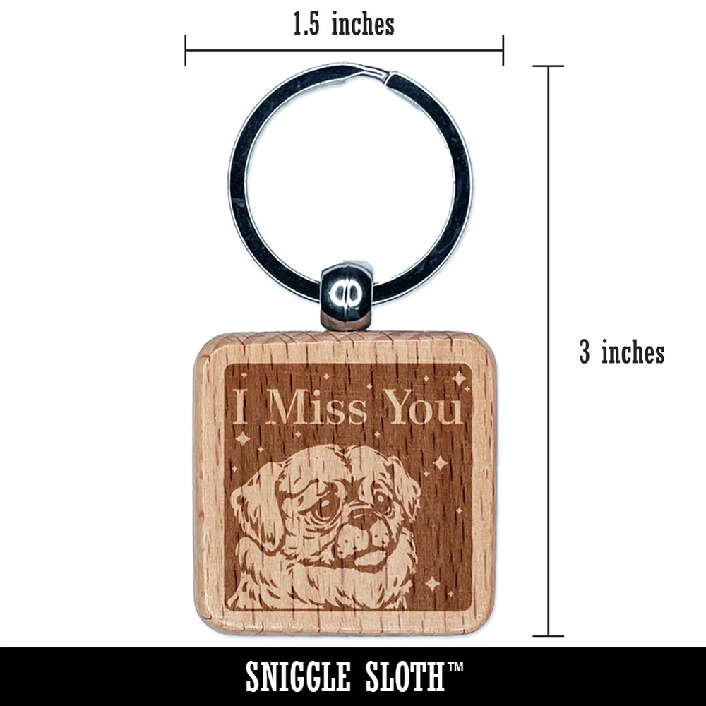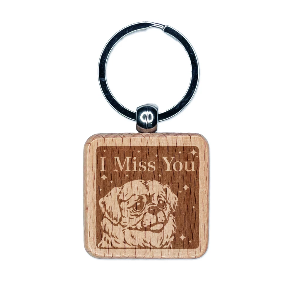 I Miss You Sad Dog Tibetan Spaniel Engraved Wood Square Keychain Tag Charm