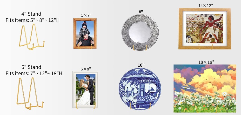 5 Pack 6 inches plate stands for display, plate holder, book stand, display stands set for frame photograph, art, collectibles, it is sturdy and thick, simple and elegance, which is a good choice for you. Suitable Size of 6 Inch: The 6-inch high display stand is suitable for items up to 18 inches height/ diameter (3 times the height of the stand). If the item to be displayed is heavier, the recommended maximum size is 12 inches height/ diameter (2 times the height of the stand), otherwise the stand is easy to fall backwards Thick and Sturdy: This plate stand for display uses iron metal as the raw material, designed with a thicker metal wire. It is thick and sturdy enough Simple and Elegance: The easels are designed with a matte black coating, with simple structure and color, it is a simple, elegance and practical stand for you 5 Pack Stands: The 5 pack plate holder set allows you to meet different needs with one purchase, and it is more cost-effective. You can use the display stand to place your photos, artwork, open books, mobile phones, tablets…and so on You Will Get: Gold display stand(height: 6") * 5