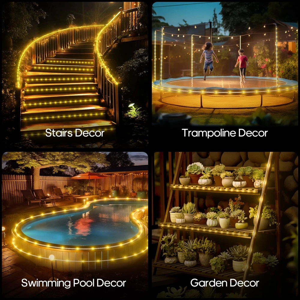 Upgrade Solar String Lights - Total 72ft / 200 led Outdoor string lights with 17 keys remote. it provide 8 light modes (1-7 are different flash modes, mode 8 is steady on), Adjust the brightness; Timer function. Total 72ft: 66ft string lights + 6.6ft traction line Energy Saving & Solar Power- High-quality solar power, effective energy saving. It built-in 1200mah rechargeable battery, absorb solar energy during the day, automatically turn on at dusk. The battery can be continuously illuminated for 8-12 hours when fully charged Memory Function & Timing Function: This solar light has memory function, you just need set one time, they stay set until you adjust them again. Timer function - 3H/5H/8H. Longer Life & More Safe - Our solar light is completely covered by a transparent PVC tube, it is durable and flexible, you could DIY the solar lights into any shape you want. It's also much safer for Kids and pets compared with ordinary copper wire string lights Christmas Decoration & IP67 Waterproof - This rope light is IP67 waterproof, you could use this it in sun/ wind /rain/snow/ fog and any weather. It's a good choice for Indoor & outdoor decorations, and fit special events like party, Xmas, Halloween, Thanksgiving, wedding, birthday, Valentine’s day, etc Package: 1* string light, 1* solar panel, 1* remote control, 1* user manual, 10* zip ties. Any questions please contact us.