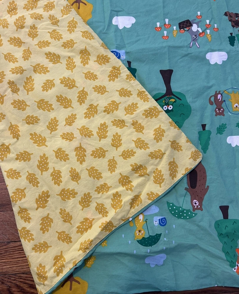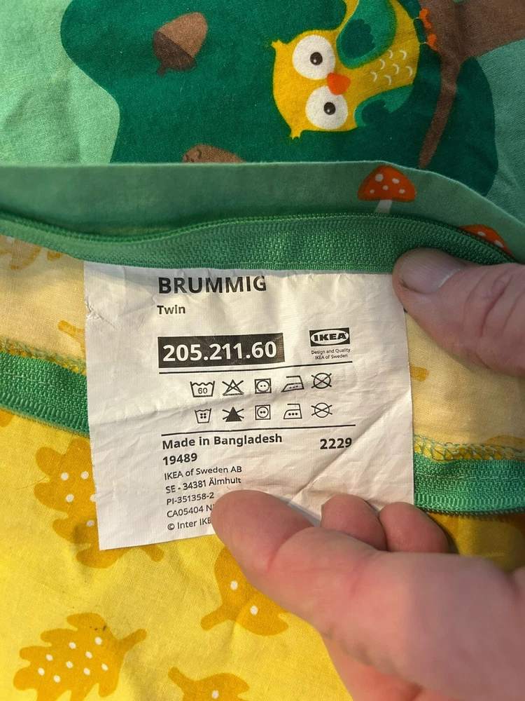 Add a touch of nature to your child's bedroom with this IKEA BRUMMIG duvet cover. The twin size cover features a colorful forest animal pattern that will surely delight your little one. Made of a comfortable blend of 80% cotton and 20% viscose/rayon, this duvet cover is easy to care for and can be machine washed. This includes one twin duvet cover. The rectangular shape and 190 square inch thread count make this duvet cover a perfect fit for any twin bed. The BRUMMIG product line is known for its high-quality and durable bedding products, so you can be sure that this duvet cover will last a long time.