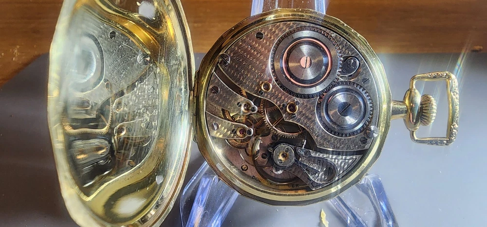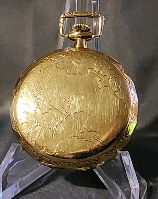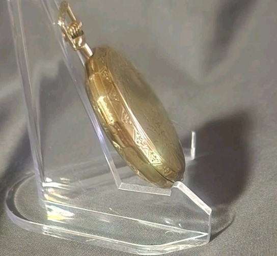 ILLINOIS STEWART GRADE 273 43mm MODEL #1. 12s, 17J, POCKET WATCH, RUNS, FANCY DIAL 14 KARAT GOLD FILLED. THIS IS A BEAUTIFUL WATCH, ANY COLLECTOR WOULD BE HAPPY TO HAVE IT IN THEIR COLLECTION. This watch shows fantastic with all the gold on the dial and fancy fish scale decorations on the movement. Hard to find an older Stewart that looks as good, especially this one. Everything operates real smooth the winding the setting just a really great watch. Got lucky with this one 4.5 years ago. All watches are sold as is and no returns ldo not guarantee the functionality of anything, I am not a watchmaker and Ido not fix watches I just sell them. If | say they're in new condition, that's because they are with no guarantees of functionality whatsoever at the time of delivery, just the fact that shipping is used can give rise to all kinds of unrelated damage problems. shipping is hard on watches Thank you for your understanding.