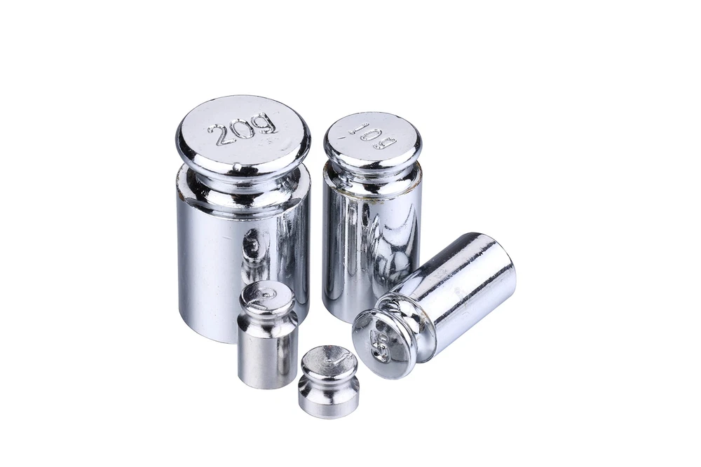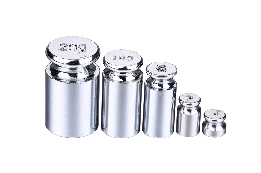 Material: steel chrome. Package comes with 5 pcs, Weight: 1g, 2g, 5g, 10g, 20g. Great scale test calibration weight. Perfect for digital kitchen scale, jewelry scale, diamond scale, precision balance test. Easy handing. Material: steel chrome. Package comes with 5 pcs, Weight: 1g, 2g, 5g, 10g, 20g Great scale test calibration weight Perfect for digital kitchen scale, jewelry scale, diamond scale, precision balance test Easy handing.