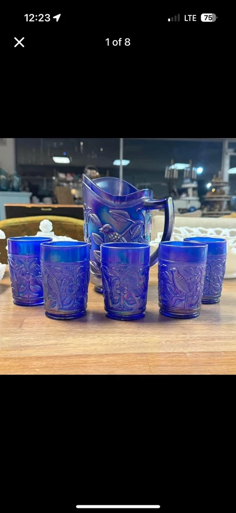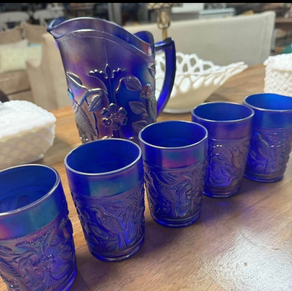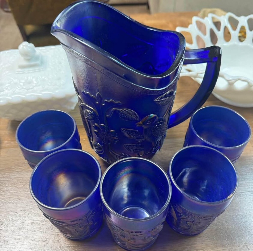 Imperial Glass Cobalt Blue Carnival Robins Water Set includes a pitcher and tumbler glasses. Made of vintage glass by Imperial Glass in the 1940s, this decorative set features a pattern of robins in a deep blue color. Suitable for all occasions, this tumbler glass set appeals to teens and unisex adults alike.