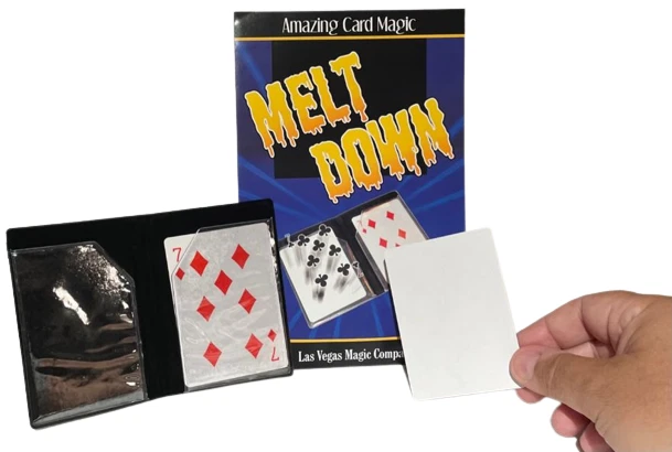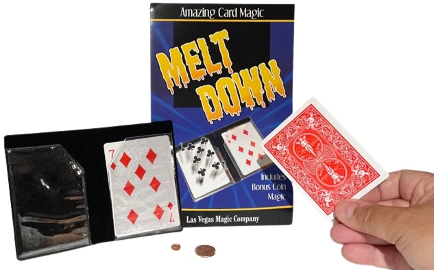 NEW Melt Down Improved ! By Las Vegas Magic Co. Two playing cards are displayed in a small plastic wallet. The cards are removed and placed between the spectators hands. When the spectator separates his hands, it is seen the cards have changed. The pips from one card have melted on to the back of the other, leaving one card completely blank! Bonus Coin Magic! Place a penny on the back of a spectator’s hand. Tap it with the wallet, and it becomes a dime (dime not included). The effect is repeated, but the penny shrinks! Perform an incredible transposition of a penny and dime! Easy to do! Includes special wallet, cards and coins (shim shell penny & mini penny) complete with instructions! Sale Includes: Black gimmicked wallet, 2 cards, shim penny, mini penny and instructions. Please Note: Cards have Bicycle design backs but are not made by Bicycle Card Co. Card suit may vary. WOW FREE SHIPPING! Trickmaster - blue tub Please check out my other great items including Geist Visual Comedian DVD's , Robbie Raccoons and much much more!