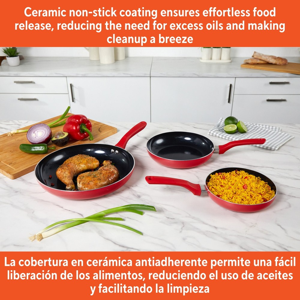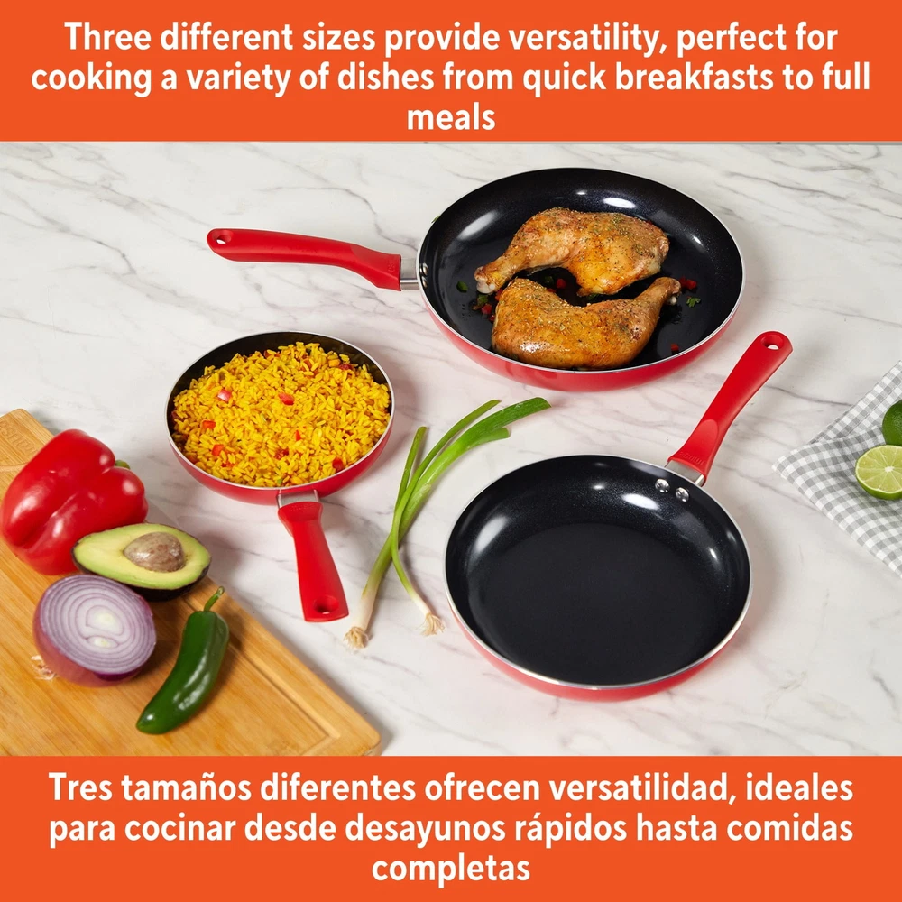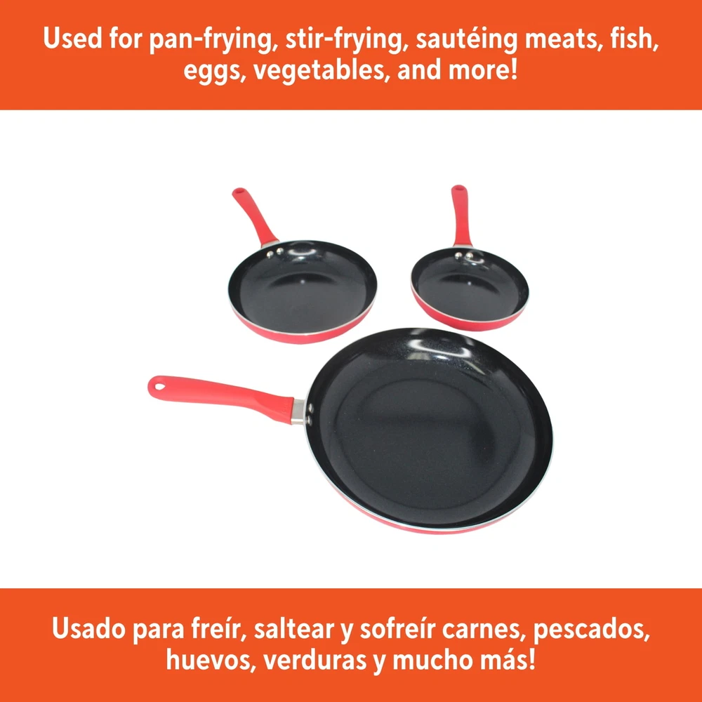 The IMUSA 3pc Aluminum Black Ceramic Fry Pan Set in Red is a versatile and practical addition to any kitchen, designed to meet a variety of cooking needs. Each pan in the set features a natural nonstick ceramic coating, promoting healthier cooking with minimal oil and ensuring effortless food release and easy cleanup. The set includes three different sizes: 7,9, and 11 inches. The IMUSA Aluminum Black Ceramic Fry Pan Set is perfect for everyday home use, making it ideal for a wide range of cooking techniques such as pan frying, stir-frying, and sautéing. These fry pans are excellent for cooking meats, fish, eggs, and more, allowing you to prepare a variety of dishes with ease. The durable aluminum construction of the IMUSA Aluminum Black Ceramic Fry Pan Set ensures even heat distribution, helping you achieve perfectly cooked meals every time. The sleek black exterior adds an elegant touch to your kitchen decor. Whether you are preparing a quick breakfast, a hearty lunch, or a delicious dinner, the IMUSA Aluminum Black Ceramic Fry Pan Set is designed to handle it all. With their natural nonstick surface and versatile sizes, these fry pans are indispensable tools for any home cook looking to enhance their culinary skills and create nutritious, flavorful meals with minimal effort. Trust the IMUSA 3pc Aluminum Black Ceramic Fry Pan Set for balanced, home-cooked meals. It will surely become your kitchen's beloved companion, uniting tradition, and innovation in every delectable creation and elevating your culinary experience. COOKING MADE EASY: The 7”, 9” and 11” fry pans in this 3-piece set offer versatility for different portion sizes, allowing you to easily prepare meals ranging from small bites to larger dishes, perfect for everyday cooking STYLISH & DURABLE: Crafted from aluminum with a black ceramic non-stick coating and a sleek red exterior, these fry pans combine modern style with long-lasting durability, providing both aesthetic appeal and practical use in your kitchen NON-STICK COATING: The ceramic non-stick coating allows for effortless food release and healthier cooking with less oil, making these fry pans perfect for preparing meals with ease, while the aluminum construction ensures quick and even heating COOKING VARIETY: Perfect for pan frying, stir frying, sautéing meat, fish, eggs, and more, these versatile fry pans allow you to create a wide range of dishes, making them an essential tool for various cooking techniques EVERYDAY KITCHEN HERO: Ideal for daily home use, these fry pans are perfect for dry heat cooking like pan frying, sautéing, and stir frying, offering both ease and reliability for all your everyday cooking tasks