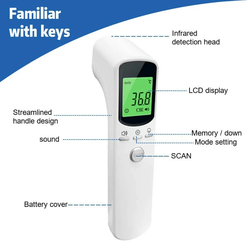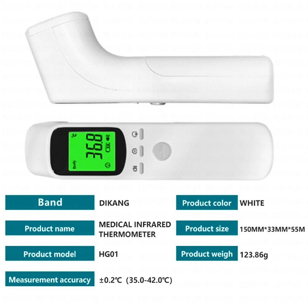 You are looking at a brand new, never used, infrared digital non touch forehead thermometer. This is a perfect tool to test body temperature without touching anyone and remaining safe. Practical In Use: The thermometer features the high-precision infrared sensors, which makes it feature the stable and reliable performance, and the thermometer features the strong adaptability to ambient temperature, which can still be used normally in complex environments. Wide Applicability: The digital thermometers are designed for all ages, adults, infants and the elderly. Not only does it support the forehead or ear function, but can also randomly obtain the surface temperature of any object and the temperature of pets. High Quality: In order to provide reliable results and ensure excellent performance, we apply updated high-precision sensor probes and the latest smart chips to the thermometer. So the thermometer is faster, more reliable, and more secure to use. Durable Design: The thermometer can be adjusted within the range of 3-5CM/1.18-1.97in(about) which requires no fixed measurement distance. And the thermometer features excellent durability. High-definition display: The thermometer has an LCD large-size orange liquid crystal display screen, with high brightness and clear and soft display with backlight, so that the reading is clear. 💎Specifications: Brand: DIKANG Model: HG01 Product name: Infrared thermometer Measurement method: non-contact Measuring distance: 3-5cm1.18-1.97in Measurement range: 32 ° C-42.5 ° C (89.6 ° F-108.5 ° F) Maximum allowable tolerance: 32 ℃ -42 ℃ ± 0.3 ℃ Display resolution: 0.1 ℃ Operating environment: 10 ° C-40 ° C (50 ° F-104 ° F) humidity ≤85% Battery: 2XAAA battery Backlight: High-intensity backlight Display unit: Celsius (° C) / Fahrenheit (° F) Automatic light machine: 15 seconds Size: 14.9 * 7.7 * 4.3cm/5.87*3.03*1.69in Weight: 135G