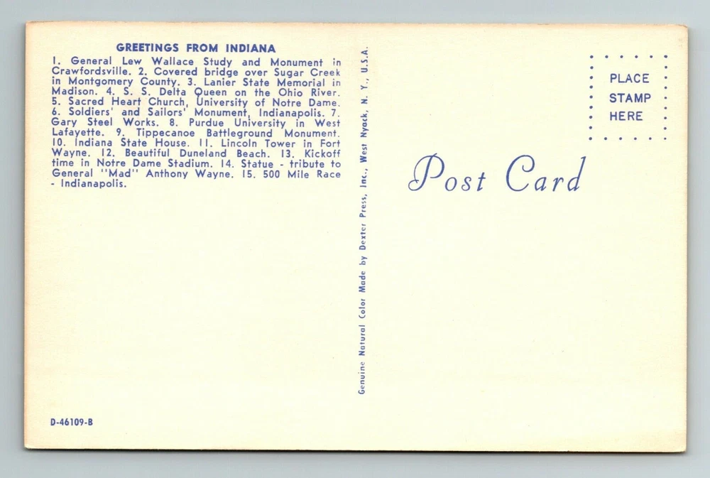 City: Indiana Theme: Cities & Towns Subject: Cities & Towns Era: Chrome Type: Printed (Lithograph) Original/Licensed Reprint: Original Country/Region of Manufacture: United States Continent: North America Unit of Sale: Single Unit Region: Indiana Country: USA Postage Condition: Unposted