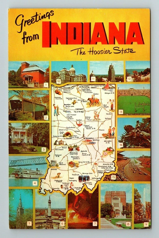 IN-Indiana, General Greetings, Map And Landmarks, Vintage Postcard