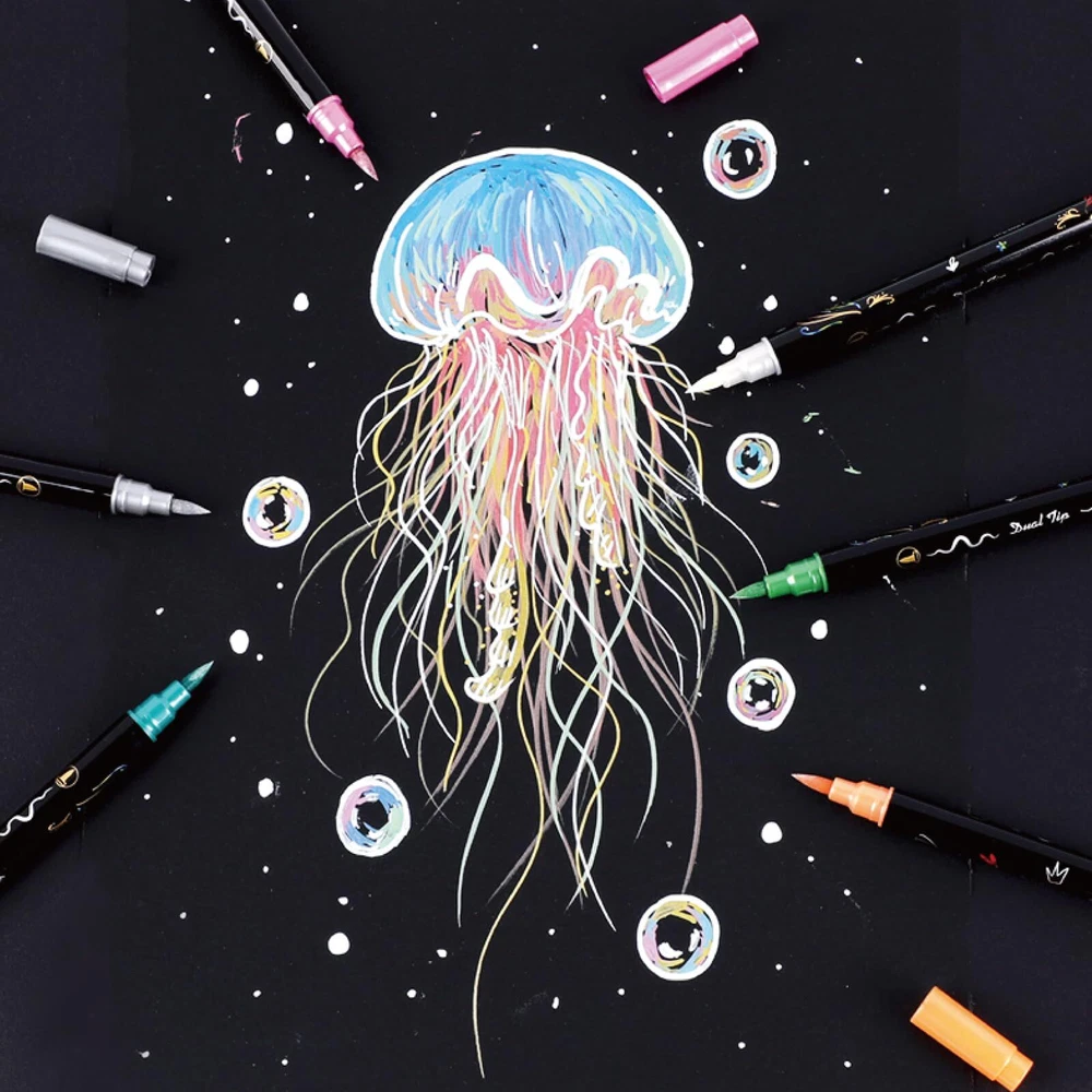 Multifunctional Metallic Markers Metallic marker pens for black paper crafts Dual tip metallic pens for art projects Metallic markers for rock painting or gift making Best holiday gift for family, kids and adults Product Details: Material: Water based ink and pp Color: 10 Vibrant metallic colors Tip: Medium & brush tip Package Includes: 10 x Dual Tip Metallic Marker Pen High Quality Metallic Markers: Made of premium water-based opaque ink conforming to ASTM D4236, our metallic marker pens are non-toxic, odorless, quick-drying, fade-resistant, and provide strong coverage to add shiny embellishments to various craft projects 10 Vibrant Metallic Colors: The set includes 10 vibrant colors—green, red, purple, light green, blue, silver, black, gold, white, bronze—offering better color selection and a vivid metallic finish for arts, crafts, and decorations. The white ink applies transparent but turns opaque when dry Dual Tip Design: INKLAB dual tip metallic pens feature a medium tip for bold marks and clean lines, and a brush tip for creating extra fine lines or filling shapes (0.38-5 mm). The versatile tips are perfect for detailed work and adding vibrant color Works on Most Surfaces: These markers are ideal for use on photos, card stock, rock, plastic, mugs, fabric, metal, wood, ceramics, glass, and especially black paper or dark surfaces. The ink flows smoothly with consistent color, no shaking needed Multifunctional Uses: Perfect for art projects, black paper crafts, DIY crafts, drawing, present making, customized mugs, rock painting, adult coloring, and as a present for family, kids, and adults