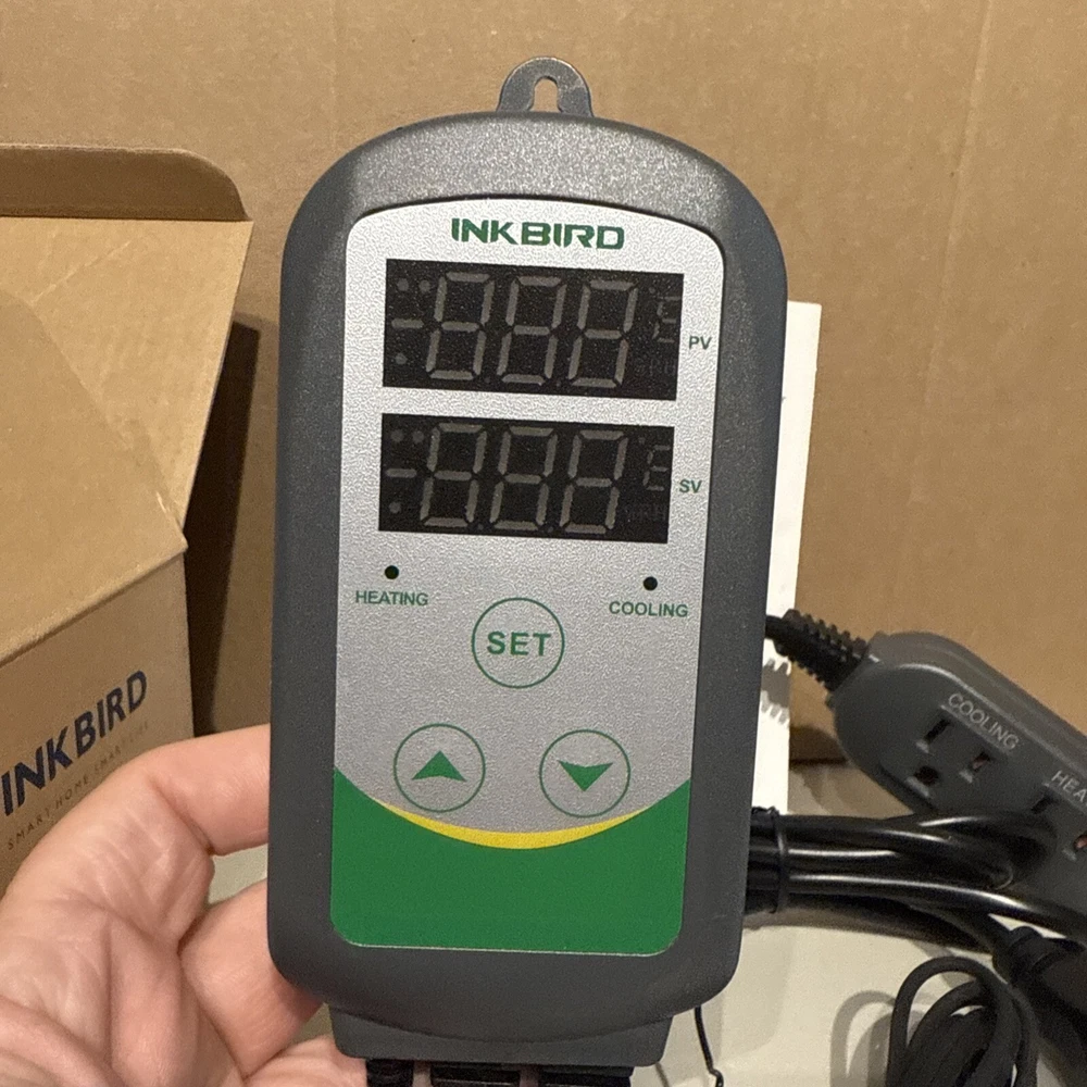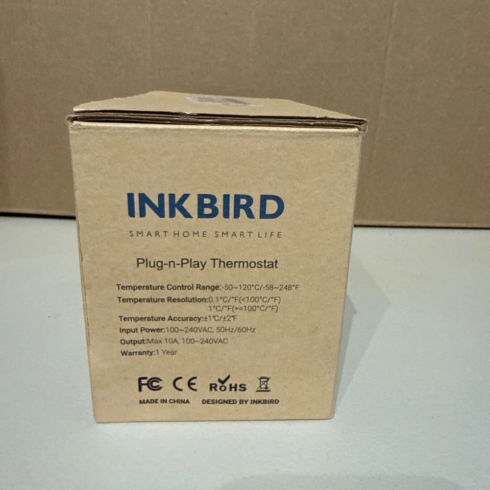 The INKBIRD ITC-308 Temperature Controller is a digital thermostat designed for heating and cooling systems. It has a temperature control range of -50~120 °C / -58~248 ° F with a resolution of 0.1°C/0.1°F and an accuracy of ± 1°C(-50~70°C)/ ± 1°F(-50~160°F). It features a 2-stage outlet switching for heat-cool-on/off and has a maximum output of 10A, 100V ~240VAC. The thermostat has a green color and is made of metal probe and plastic. It is programmable and has a manufacturer warranty of 1 year.