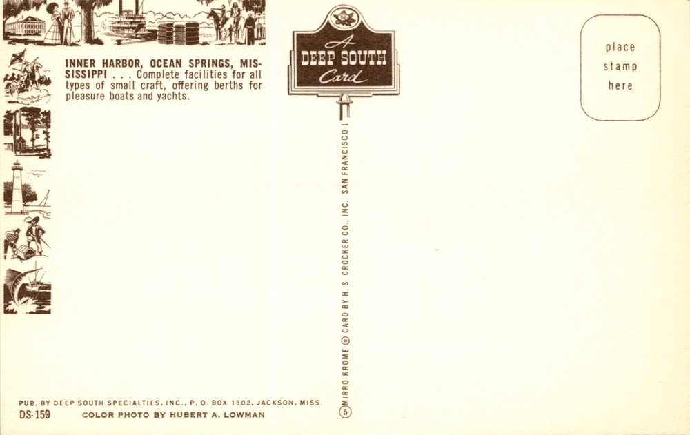 MAKE AN OFFER. THE MORE YOU BUY THE BETTER DEAL I WILL ACCEPT The postcard features a photograph of Inner Harbor in Ocean Springs, Mississippi. The harbor is depicted as having complete facilities for various types of small craft, providing berths for pleasure boats and yachts. The postcard was published by Deep South Specialties, Inc., based in Jackson, Mississippi. The color photograph was taken by Hubert A.