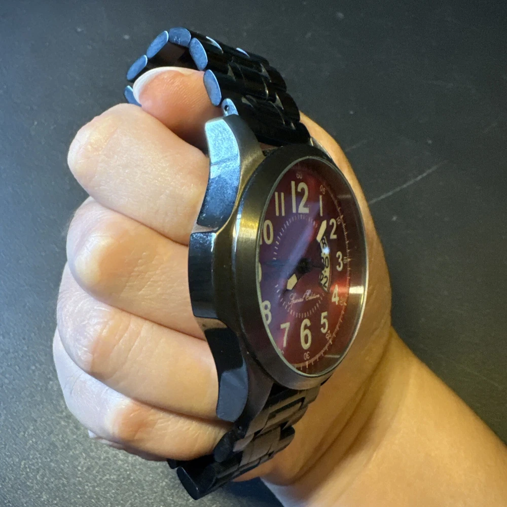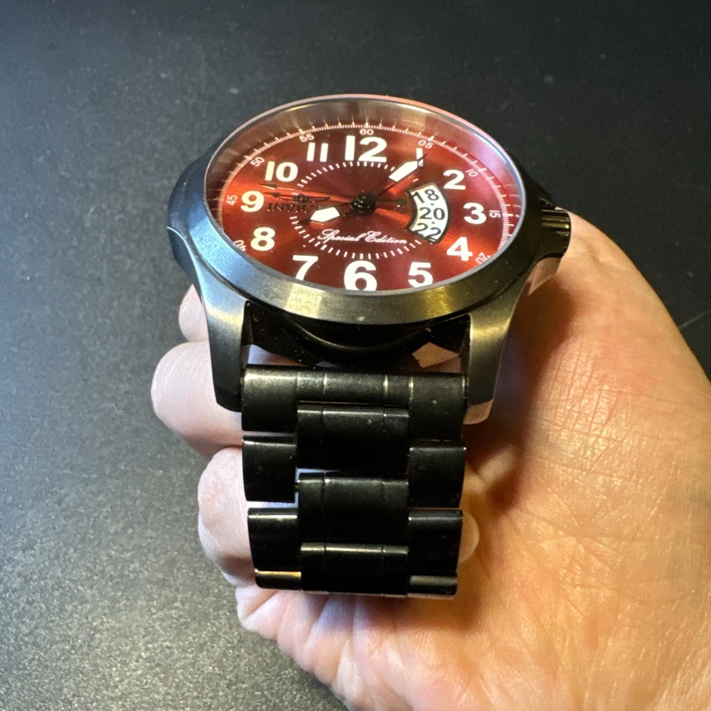 Elevate your style with this stunning red Invicta Force wristwatch. Crafted from high-quality steel, this special edition timepiece boasts a sleek analog display and powerful quartz movement. With a water resistance of up to 100 meters, this watch is perfect for the adventurous man. The reference number 18985 adds a touch of sophistication to the design, making it a great addition to any collection. Ever since its founding in 2008, Invicta has been known for its high-quality watches that are designed to impress. This wristwatch is no exception, with its striking red case and elegant design. It's perfect for men who want to make a statement with their accessories. Add this incredible timepiece to your collection. Personal used condition in collection. Not currently running. NEEDS NEW BATTERIES! Bought couple years back and it's been in storage. No box. Just the watch itself with the band. Very good pristine condition. Currently sold out at retail value on official site rare to find. offers welcome.