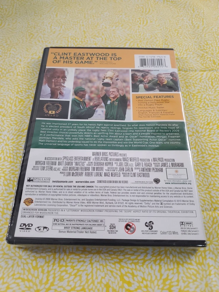 THANK YOU FOR VISITING OUR STORE. WE SHIP 6 DAYS A WEEK (UNLESS THERE IS A FEDERAL HOLIDAY). MOST ITEMS WILL SHIP IN A STURDY BOX AS NEEDED. PLEASE FEEL FREE TO REACH OUT IF YOU HAVE ANY QUESTIONS. WE WILL COMBINE SHIPPING WHEN AVAILABLE. Experience the true story of Nelson Mandela’s leadership and inspiration with Invictus. Directed by Clint Eastwood and starring Morgan Freeman and Matt Damon, this PG-13 rated film is a powerful drama that captures the spirit of hope and resilience during South Africa’s apartheid era. With a run time of 133 minutes and featuring Widescreen format, this DVD edition of Invictus is perfect for all movie lovers and history enthusiasts. Don't miss the chance to own a piece of this inspiring story.