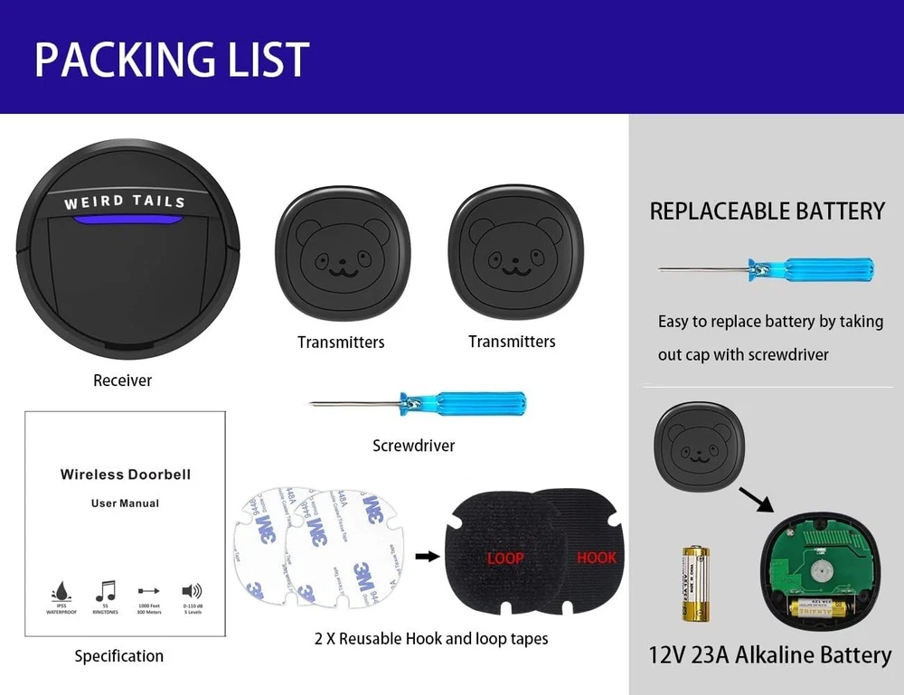Voltage: 12V Batteries: 1 12v Batteries Required. (included) Personalize: No Package Dimensions: 4.61 X 3.27 X 3.19 Inches; 5.89 Ounces UPC: Does not apply Power Source: Battery Item Package Dimensions L X W X H: 4.61 X 3.27 X 3.19 Inches Button Shape: Round Button Material: Plastic Finish: Matte Shape: Rectangle gtin13: Does not apply Color: 1 receiver 2 transmitters Item Weight: 5.9 ounces Size: 1 Receiver 2 Transmitters Battery Included: Yes Type: Digital Number of Batteries: 1 Items Included: Receiver, Transmitters, Transmitter Suitable For: Home, Dogs Style: Modern Connectivity: Wireless Material: Plastic, Rubber Power: 1.5 W Target Audience Keyword: Dogs Features: Waterproof, LED Flash, 55 Melodies, 5 Volume Levels, Long Range Brand: Unbranded