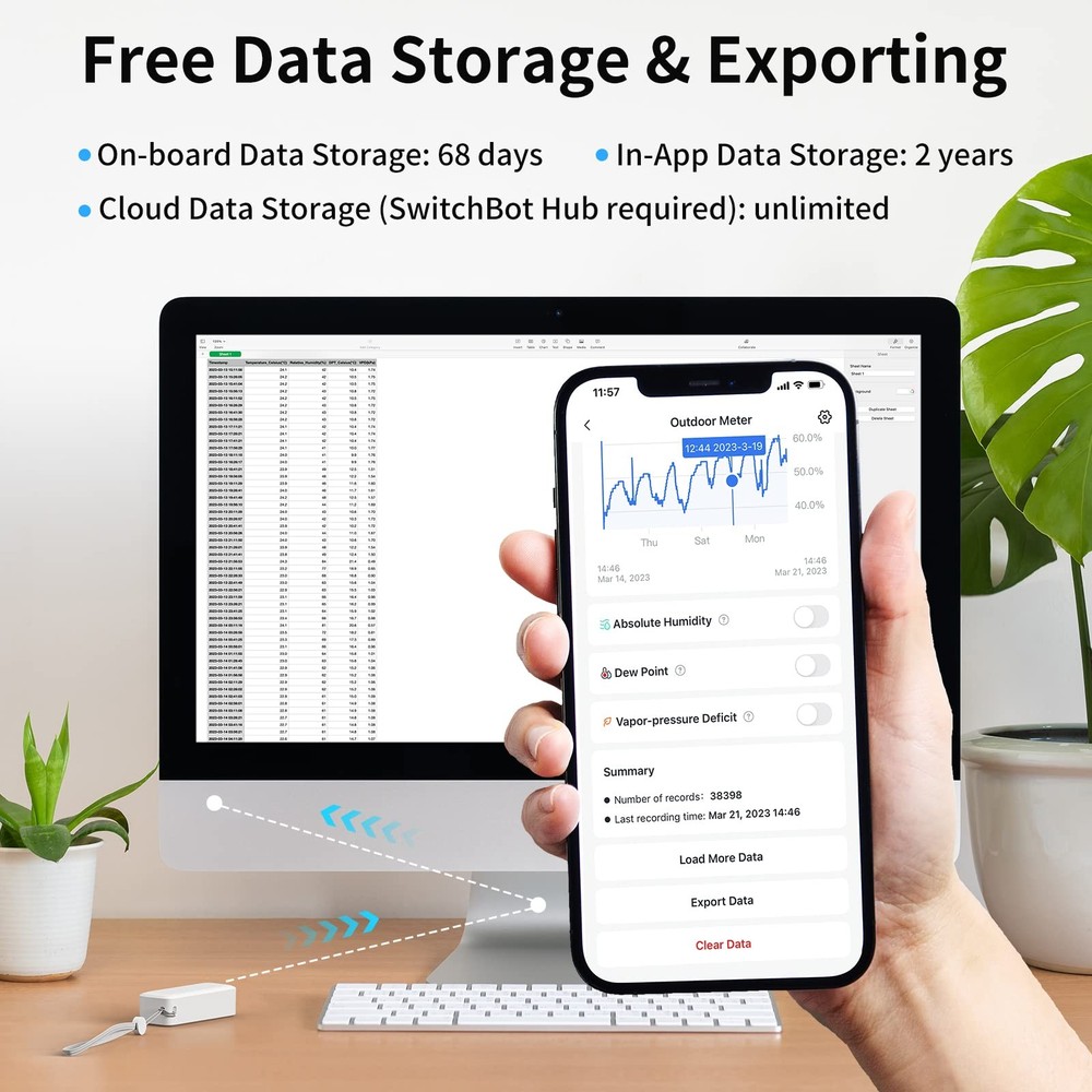 IP65 Dustproof/Waterproof, Suitable for Indoors & Outdoors: Outdoor Thermometer is IP65 dustproof and waterproof and can work safely even on rainy days. They're easy to use, lightweight, and portable. Perfect for kitchens, bathrooms, greenhouses, refrigerators, guitar cases, humidors, attics, basements, cigar humidor and crawlspaces. More Sensitive to Temperature & Humidity: With its built-in industrial Swiss Sensirion you can expect more accuracy up to ± 1.8% RH, ± 0.36 ° F, with a faster and more accurate 4sec sampling interval to always monitor the temperature and humidity in your living environment. Supports Data Exporting: 394ft connecting distance (no obstacles) allows you to quickly and clearly view the temperature and humidity yearly, monthly, daily, or by the hour. Enjoy up to 68 days On-board Data Storage and up to 2 years In-App Data Storage(Unlimited cloud storage if Hub is added). Data can be exported as. csv file for more in-depth analysis of your environmental. Supports multiple methods of data calibration. Compact and Durable: indoor outdoor thermometer wireless features a simple and compact design, with a lanyard attached to allow you to hang it to just about anything. With its low power consumption design, you can use it for up to years, and do not need to replace the removable batteries frequently. Smarter Push Notifications (Hub required): Our hygrometer now supports Dewpoint, and VPD readings with absolute humidity as well as temperature and humidity readings that can be used as Scene conditions. When used with a Hub, should any preset value be exceeded, our app can push a notification alert to allow you to react in real-time to changes in freezer, wine cellar, instrument case, attic, basement, crawlspace, reptile tank, terrarium, and more.