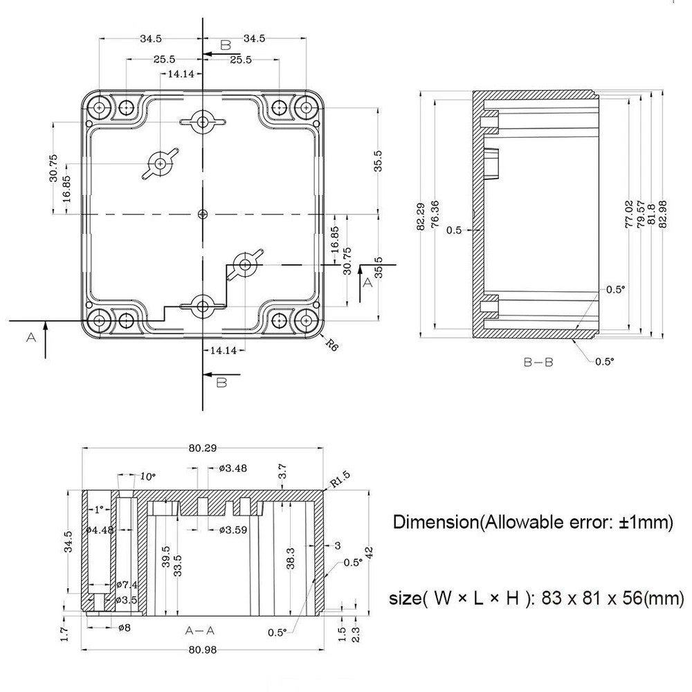 Junction Box IP65 Waterproof Project Box Dustproof ABS Plastic Electrical Boxes Universal Enclosure for Electronic Black 3.29x 3.19x 2.2 inch (83 x 81 x 56mm)(Pack of 1) About the Product Description: This ABS project box brings a better customizable experience. 1.Made of ABS material. Sturdy and terrific for making those DIY projects. Easy to drill and shape openings for many items like meters, sockets, LEDs and so on. 2.Many screw holes inside in various places. If wanted to make one to go in it, such as attaching a board, there would be no problem mounting it. 3.100% brand new and high quality. Specifications: Product Name: Junction Box Outer Size of the black project box(Approx.):3.29" x 3.19" x 2.2"/83x 81 x56mm(L*W*H) Inner Size of the black project box(Approx.): 3.1" x 3" x 2"/76 x 74 x 49mm(L*W*H)- - (Allowable Error: 2mm) Main Color: Black Main Material: ABS Waterproof Rating: IP65 Package Include: 1 x Junction Box 1 x Rubber Grommet 4 x Screws(Not Rustproof) Key Features IP65 Waterproof: project box is designed to provide protection against moisture, water, and dust.Equipped with rubber grommet sealing tightly to ensure electrical components dry and effective in wet or harsh environments. High-quality Material: ABS plastic junction boxes are able to withstand impact, heat, and various weather conditions. Lightweight and durability make them easy to drill, modify and serve for long time. Versatile Enclosure: These electrical boxes are well-suited for indoor and outdoor LED displays, control panels, solar power systems,surveillance cameras, security systems etc. Also a convenient solution for DIY projects and hobbyists. Outer Size: 3.29 x 3.19 x 2.2inch(83x 81 x56mm);Inner Size: 3.1 x 3 x 2inch(76 x 74 x 49mm)- - *Tips: in order to confirm the detailed installation dimensions, please refer to our detail image, which shows specific internal dimensions of the product. (Allowable Error: 2mm) ,Thickness: 0.12in/3mm Package Content: 1 x Junction Box, 1 x Rubber Grommet ,4 x Metal Screws Delivery Information Our shipping is prompt and secure. Orders are dispatched within 1-2 business days. It should take 3-5 business days for the product to reach your destination (Saturday and Sunday excluded). We do not ship to a different address. we will ship to the address you provide on the ebay only. Please check your address before purchase. Return Policy Returns are accepted within 30 days if you are not completely satisfied. Refunds are issued back to your original payment method. Items must be returned in their original condition and packaging. Payment Options We accept PayPal, credit cards, and other payment methods supported by eBay. Please ensure your payment details are up-to-date to avoid any delays. Your Feedback Matters We appreciate your feedback. If you're happy with your purchase, please consider leaving a positive review. Contact Information If you have any queries or require further assistance, please contact us via eBay messages.