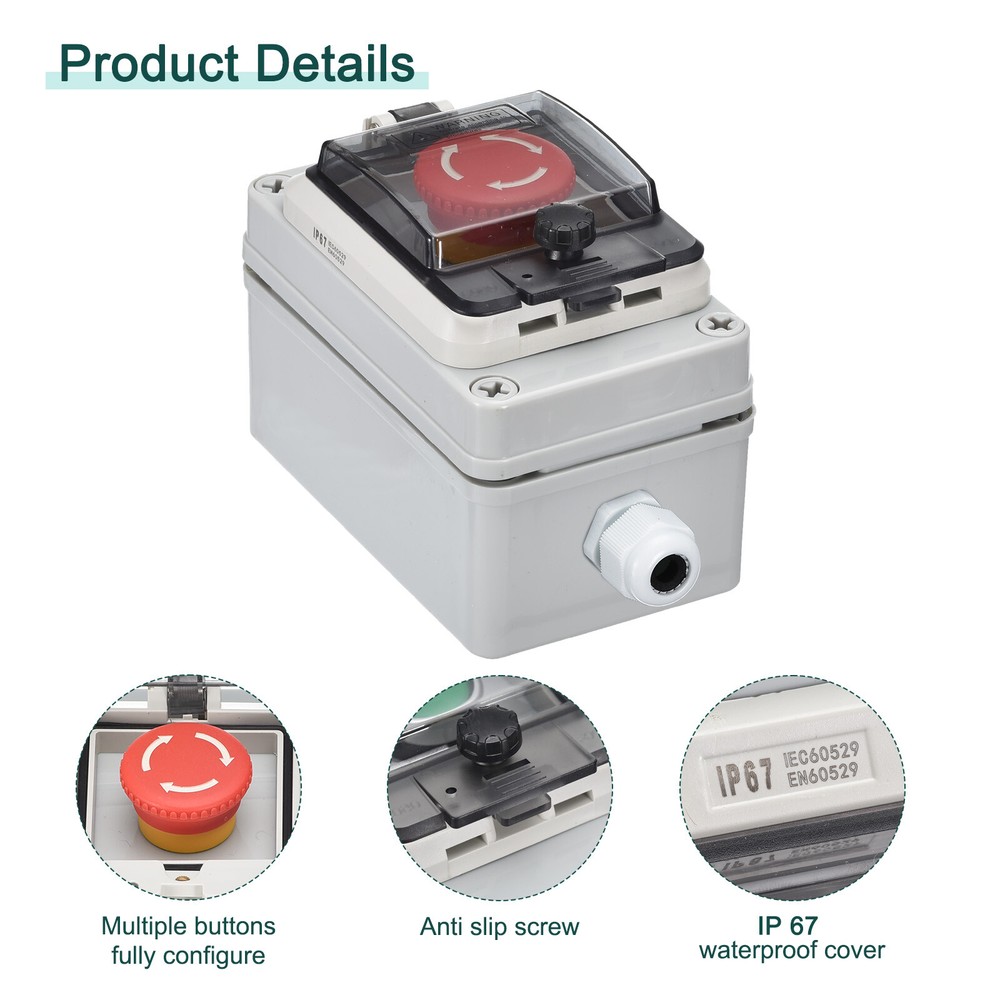 Document What is this?This product is a push button box designed for various electrical applications. It features a waterproof rating of IP67, ensuring protection against dust and water ingress.What will I get?Product name:Push button box;Waterproof Rating: IP67;Material: ABS;Overall Size:Ith :10A;Ui :400V;E Stop Button: Latching Rotary;Contact Type: 1 NC + 1 NO;Size: 126mm x 75mm x 97mm / 5" x 3" x 3.8";Are there any advantages of the product?The push button box provides a high level of protection with its IP67 waterproof rating, making it suitable for both indoor and outdoor use. The buttons have stable and reliable contacts, while the engineering plastic construction makes them resistant to breakage.How to use it?The push button box is commonly used for indoor and outdoor installations in electrical, communication, and fire equipment, as well as in industries such as electronics, power supply, construction, and more. It can also used for environments that require dustproof or waterproof protection.What should I notice?1. Ensure proper installation and wiring to ensure safe and effective operation.2. If using in outdoor or exposed areas, regularly inspect for any signs of damage or wear that may lower its waterproof and dustproof capabilities.3. Carefully follow the instructions provided for installation and use to optimize the performance and longevity of the push button box. IP67 Push Button Box ABS E Stop Button for Electrical Fire Equipment What is this? This product is a push button box designed for various electrical applications. It features a waterproof rating of IP67, ensuring protection against dust and water ingress. What will I get? Product name:Push button box; Waterproof Rating: IP67; Material: ABS; Overall Size: Ith :10A; Ui :400V; E Stop Button: Latching Rotary; Contact Type: 1 NC + 1 NO; Size: 126mm x 75mm x 97mm / 5" x 3" x 3.8"; Are there any advantages of the product? The push button box provides a high level of protection with its IP67 waterproof rating, making it suitable for both indoor and outdoor use. The buttons have stable and reliable contacts, while the engineering plastic construction makes them resistant to breakage. How to use it? The push button box is commonly used for indoor and outdoor installations in electrical, communication, and fire equipment, as well as in industries such as electronics, power supply, construction, and more. It can also used for environments that require dustproof or waterproof protection. What should I notice? 1. Ensure proper installation and wiring to ensure safe and effective operation. 2. If using in outdoor or exposed areas, regularly inspect for any signs of damage or wear that may lower its waterproof and dustproof capabilities. 3. Carefully follow the instructions provided for installation and use to optimize the performance and longevity of the push button box. Hot Item Payment 1.We accept eBay payment . 2.Payment must be received within 7 business days of auction closing. Shipping 1.We ship to your eBay or Paypal address. Please make sure your eBay and Paypal address is correct before you pay. 2.Items will be shipped within 1-3 business day when we received payment. 3.Delivery time depends on destination and other factors. Description Policy IP67 Push Button Box ABS E Stop Button for Electrical Fire Equipment What is this? This product is a push button box designed for various electrical applications. It features a waterproof rating of IP67, ensuring protection against dust and water ingress. What will I get? Product name:Push button box; Waterproof Rating: IP67; Material: ABS; Overall Size: Ith :10A; Ui :400V; E Stop Button: Latching Rotary; Contact Type: 1 NC + 1 NO; Size: 126mm x 75mm x 97mm / 5" x 3" x 3.8"; Are there any advantages of the product? The push button box provides a high level of protection with its IP67 waterproof rating, making it suitable for both indoor and outdoor use. The buttons have stable and reliable contacts, while the engineering plastic construction makes them resistant to breakage. How to use it? The push button box is commonly used for indoor and outdoor installations in electrical, communication, and fire equipment, as well as in industries such as electronics, power supply, construction, and more. It can also used for environments that require dustproof or waterproof protection. What should I notice? 1. Ensure proper installation and wiring to ensure safe and effective operation. 2. If using in outdoor or exposed areas, regularly inspect for any signs of damage or wear that may lower its waterproof and dustproof capabilities. 3. Carefully follow the instructions provided for installation and use to optimize the performance and longevity of the push button box. Hot Item Payment 1.We accept eBay payment . 2.Payment must be received within 7 business days of auction closing. Shipping 1.We ship to your eBay or Paypal address. Please make sure your eBay and Paypal address is correct before you pay. 2.Items will be shipped within 1-3 business day when we received payment. 3.Delivery time depends on destination and other factors.