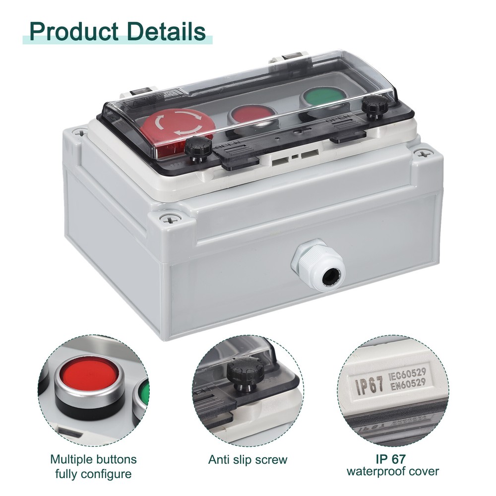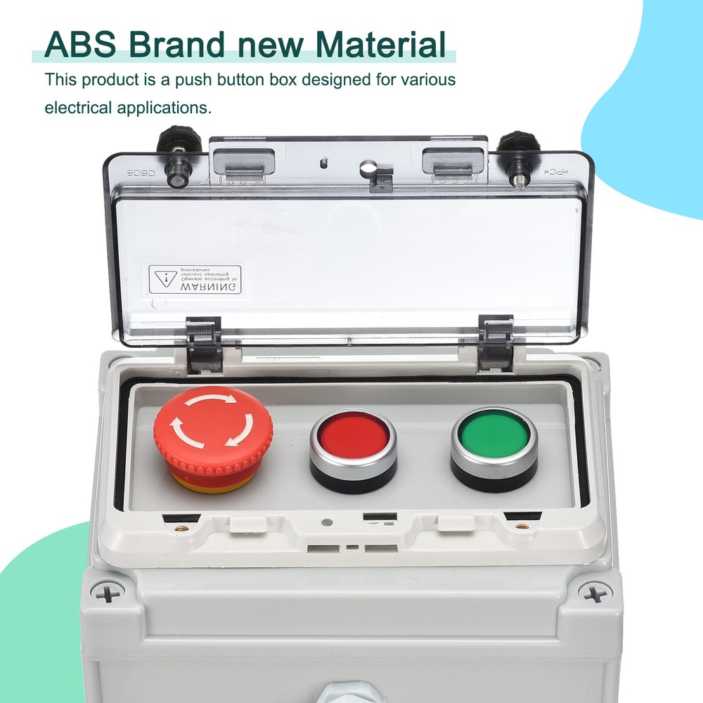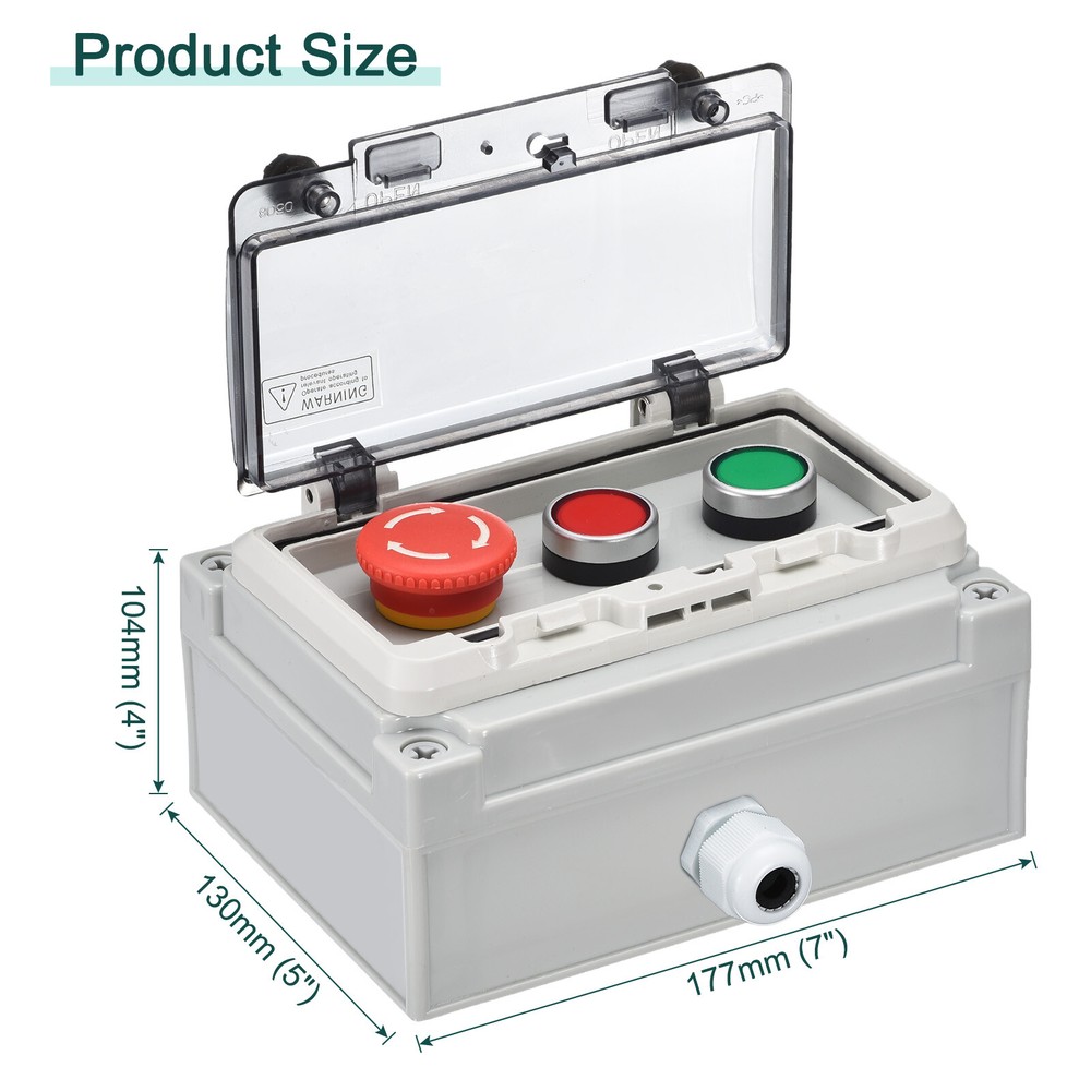 Document What is this?This product is a push button box designed for various electrical applications. It features a waterproof rating of IP67, ensuring protection against dust and water ingress.What will I get?Product name:Push button box;Waterproof Rating: IP67;Material: ABS;Overall Size:Ith :10A;Ui :400V;E Stop Button: Latching Rotary;Red Green Button: Momentary;Contact Type: 1 NC + 1 NO;Size: 177mm x 130mm x 104mm / 7" x 5" x 4";Are there any advantages of the product?The push button box provides a high level of protection with its IP67 waterproof rating, making it suitable for both indoor and outdoor use. The buttons have stable and reliable contacts, while the engineering plastic construction makes them resistant to breakage.How to use it?The push button box is commonly used for indoor and outdoor installations in electrical, communication, and fire equipment, as well as in industries such as electronics, power supply, construction, and more. It can also used for environments that require dustproof or waterproof protection.What should I notice?1. Ensure proper installation and wiring to ensure safe and effective operation.2. If using in outdoor or exposed areas, regularly inspect for any signs of damage or wear that may lower its waterproof and dustproof capabilities.3. Carefully follow the instructions provided for installation and use to optimize the performance and longevity of the push button box. IP67 Push Button Box ABS Green Button Red Button E Stop Button What is this? This product is a push button box designed for various electrical applications. It features a waterproof rating of IP67, ensuring protection against dust and water ingress. What will I get? Product name:Push button box; Waterproof Rating: IP67; Material: ABS; Overall Size: Ith :10A; Ui :400V; E Stop Button: Latching Rotary; Red Green Button: Momentary; Contact Type: 1 NC + 1 NO; Size: 177mm x 130mm x 104mm / 7" x 5" x 4"; Are there any advantages of the product? The push button box provides a high level of protection with its IP67 waterproof rating, making it suitable for both indoor and outdoor use. The buttons have stable and reliable contacts, while the engineering plastic construction makes them resistant to breakage. How to use it? The push button box is commonly used for indoor and outdoor installations in electrical, communication, and fire equipment, as well as in industries such as electronics, power supply, construction, and more. It can also used for environments that require dustproof or waterproof protection. What should I notice? 1. Ensure proper installation and wiring to ensure safe and effective operation. 2. If using in outdoor or exposed areas, regularly inspect for any signs of damage or wear that may lower its waterproof and dustproof capabilities. 3. Carefully follow the instructions provided for installation and use to optimize the performance and longevity of the push button box. Hot Item Payment 1.We accept eBay payment . 2.Payment must be received within 7 business days of auction closing. Shipping 1.We ship to your eBay or Paypal address. Please make sure your eBay and Paypal address is correct before you pay. 2.Items will be shipped within 1-3 business day when we received payment. 3.Delivery time depends on destination and other factors. Description Policy IP67 Push Button Box ABS Green Button Red Button E Stop Button What is this? This product is a push button box designed for various electrical applications. It features a waterproof rating of IP67, ensuring protection against dust and water ingress. What will I get? Product name:Push button box; Waterproof Rating: IP67; Material: ABS; Overall Size: Ith :10A; Ui :400V; E Stop Button: Latching Rotary; Red Green Button: Momentary; Contact Type: 1 NC + 1 NO; Size: 177mm x 130mm x 104mm / 7" x 5" x 4"; Are there any advantages of the product? The push button box provides a high level of protection with its IP67 waterproof rating, making it suitable for both indoor and outdoor use. The buttons have stable and reliable contacts, while the engineering plastic construction makes them resistant to breakage. How to use it? The push button box is commonly used for indoor and outdoor installations in electrical, communication, and fire equipment, as well as in industries such as electronics, power supply, construction, and more. It can also used for environments that require dustproof or waterproof protection. What should I notice? 1. Ensure proper installation and wiring to ensure safe and effective operation. 2. If using in outdoor or exposed areas, regularly inspect for any signs of damage or wear that may lower its waterproof and dustproof capabilities. 3. Carefully follow the instructions provided for installation and use to optimize the performance and longevity of the push button box. Hot Item Payment 1.We accept eBay payment . 2.Payment must be received within 7 business days of auction closing. Shipping 1.We ship to your eBay or Paypal address. Please make sure your eBay and Paypal address is correct before you pay. 2.Items will be shipped within 1-3 business day when we received payment. 3.Delivery time depends on destination and other factors.