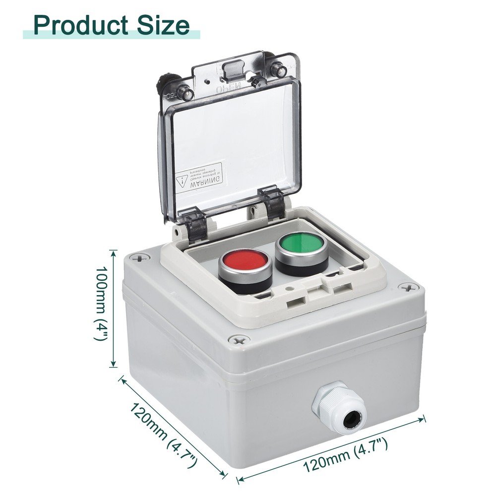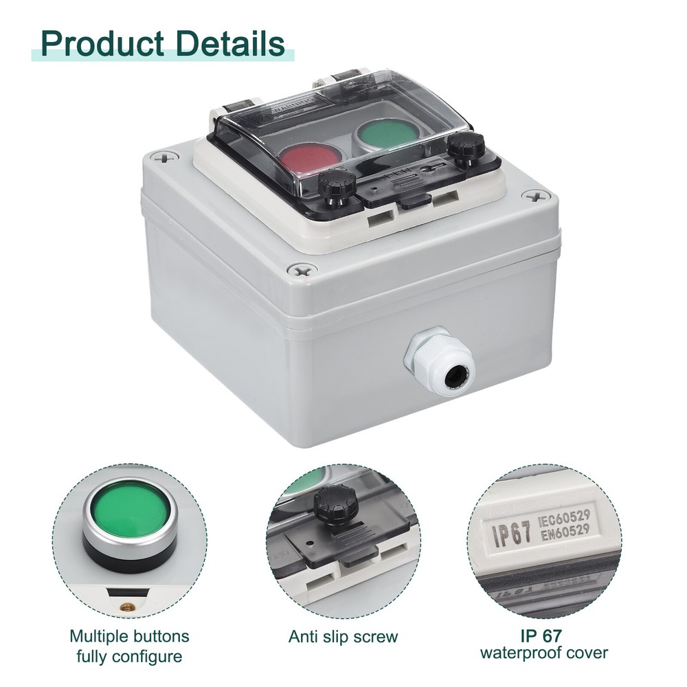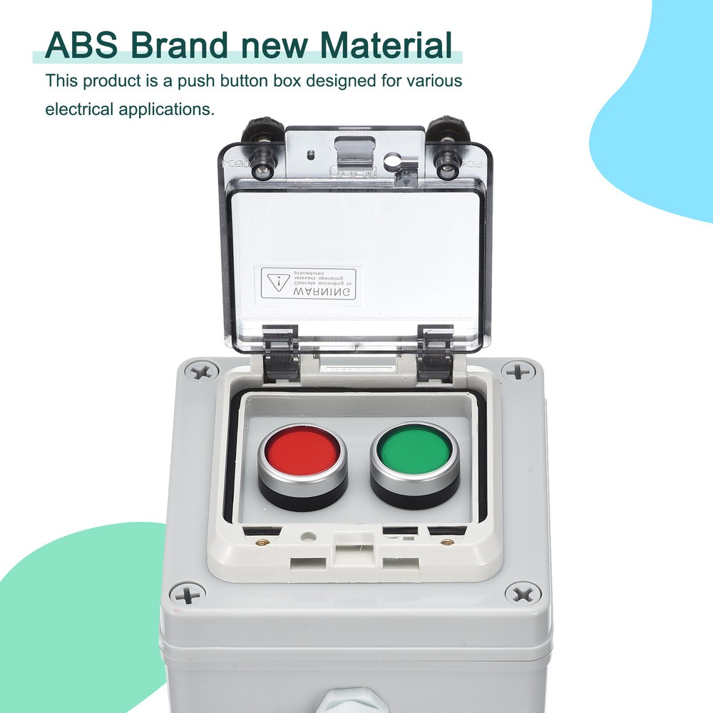 Document What is this?This product is a push button box designed for various electrical applications. It features a waterproof rating of IP67, ensuring protection against dust and water ingress.What will I get?Product name:Push button box;Waterproof Rating: IP67;Material: ABS;Overall Size:Ith :10A;Ui :400V;Red Green Button: Momentary;Contact Type: 1 NC + 1 NO;Size: 120mm x 120mm x 100mm / 4.7" x 4.7" x 4";Are there any advantages of the product?The push button box provides a high level of protection with its IP67 waterproof rating, making it suitable for both indoor and outdoor use. The buttons have stable and reliable contacts, while the engineering plastic construction makes them resistant to breakage.How to use it?The push button box is commonly used for indoor and outdoor installations in electrical, communication, and fire equipment, as well as in industries such as electronics, power supply, construction, and more. It can also used for environments that require dustproof or waterproof protection.What should I notice?1. Ensure proper installation and wiring to ensure safe and effective operation.2. If using in outdoor or exposed areas, regularly inspect for any signs of damage or wear that may lower its waterproof and dustproof capabilities.3. Carefully follow the instructions provided for installation and use to optimize the performance and longevity of the push button box. IP67 Push Button Box ABS Green Button Red Button Electrical Fire Equipment What is this? This product is a push button box designed for various electrical applications. It features a waterproof rating of IP67, ensuring protection against dust and water ingress. What will I get? Product name:Push button box; Waterproof Rating: IP67; Material: ABS; Overall Size: Ith :10A; Ui :400V; Red Green Button: Momentary; Contact Type: 1 NC + 1 NO; Size: 120mm x 120mm x 100mm / 4.7" x 4.7" x 4"; Are there any advantages of the product? The push button box provides a high level of protection with its IP67 waterproof rating, making it suitable for both indoor and outdoor use. The buttons have stable and reliable contacts, while the engineering plastic construction makes them resistant to breakage. How to use it? The push button box is commonly used for indoor and outdoor installations in electrical, communication, and fire equipment, as well as in industries such as electronics, power supply, construction, and more. It can also used for environments that require dustproof or waterproof protection. What should I notice? 1. Ensure proper installation and wiring to ensure safe and effective operation. 2. If using in outdoor or exposed areas, regularly inspect for any signs of damage or wear that may lower its waterproof and dustproof capabilities. 3. Carefully follow the instructions provided for installation and use to optimize the performance and longevity of the push button box. Hot Item Payment 1.We accept eBay payment . 2.Payment must be received within 7 business days of auction closing. Shipping 1.We ship to your eBay or Paypal address. Please make sure your eBay and Paypal address is correct before you pay. 2.Items will be shipped within 1-3 business day when we received payment. 3.Delivery time depends on destination and other factors. Description Policy IP67 Push Button Box ABS Green Button Red Button Electrical Fire Equipment What is this? This product is a push button box designed for various electrical applications. It features a waterproof rating of IP67, ensuring protection against dust and water ingress. What will I get? Product name:Push button box; Waterproof Rating: IP67; Material: ABS; Overall Size: Ith :10A; Ui :400V; Red Green Button: Momentary; Contact Type: 1 NC + 1 NO; Size: 120mm x 120mm x 100mm / 4.7" x 4.7" x 4"; Are there any advantages of the product? The push button box provides a high level of protection with its IP67 waterproof rating, making it suitable for both indoor and outdoor use. The buttons have stable and reliable contacts, while the engineering plastic construction makes them resistant to breakage. How to use it? The push button box is commonly used for indoor and outdoor installations in electrical, communication, and fire equipment, as well as in industries such as electronics, power supply, construction, and more. It can also used for environments that require dustproof or waterproof protection. What should I notice? 1. Ensure proper installation and wiring to ensure safe and effective operation. 2. If using in outdoor or exposed areas, regularly inspect for any signs of damage or wear that may lower its waterproof and dustproof capabilities. 3. Carefully follow the instructions provided for installation and use to optimize the performance and longevity of the push button box. Hot Item Payment 1.We accept eBay payment . 2.Payment must be received within 7 business days of auction closing. Shipping 1.We ship to your eBay or Paypal address. Please make sure your eBay and Paypal address is correct before you pay. 2.Items will be shipped within 1-3 business day when we received payment. 3.Delivery time depends on destination and other factors.