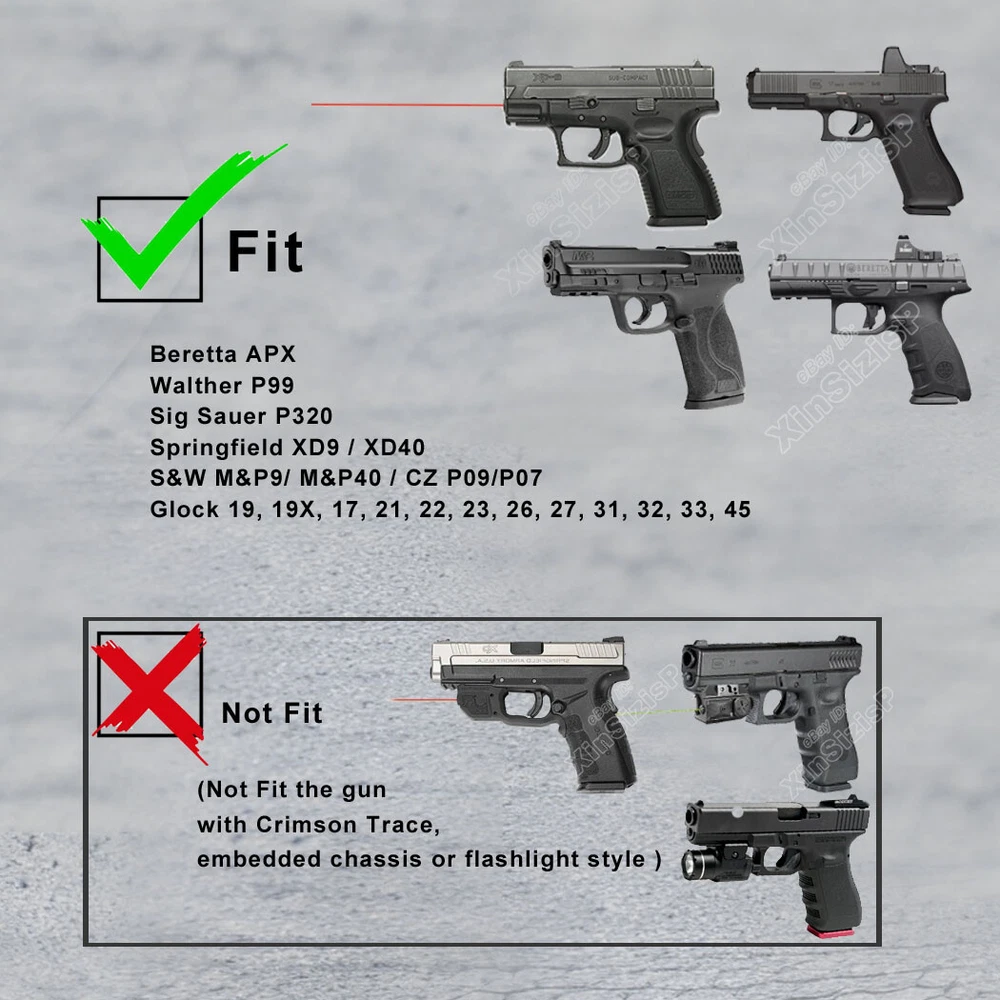 High Quality Military & Police Grade Polymer OWB Holster Specially Designed For Fast Draw During Duty Or Shooting Competition. Outside Waistband Tactical Holster This holster fits 9mm, 10mm, and .40 caliber firearms but is not compatible with .45 caliber models. Holster Fit Glock 19 (Gen 1-5) Glock 19X Glock 17 (Gen 1-5) Glock 21 (Gen 1-5) Glock 26 (Gen 1-5) Glock 27 (Gen 1-5) Glock 31 (Gen 1-5) Glock 32 (Gen 1-5) Glock 33 (Gen 1-5) Glock 45 (Gen 1-5) Glock 22 (Gen 1-4) Glock 23 (Gen 1-4) Holster Fit Smith & Wesson M&P 9 M2.0 4.25" 9mm Luger Smith & Wesson M&P 10mm M2.0 4" 10mm Auto Smith & Wesson M&P 10mm M2.0 4.6" 10mm Auto Smith & Wesson M&P 40 M2.0 3.6" Subcompact .40 S&W Smith & Wesson M&P 9 M2.0 3.6" Compact 9mm Luger Smith & Wesson M&P 9 M2.0 3.6" Subcompact 9mm Luger Smith & Wesson M&P 9 M2.0 4.0" Compact 9mm Luger Smith & Wesson M&P 9 M2.0 5" 9mm Luger Holster Fit Walther P99 AS 9mm Luger Walther P99c 9mm Luger/.40 S&W Walther PPQ 9mm Luger Holster Fit Springfield XD 9, XD 40, 5" 9mm Luger/.40 S&W Springfield XD 9, XD 40, Full Size 4" 9mm Luger/.40 S&W Springfield XD MOD.2 4" Service 9mm Luger Springfield XD MOD.2 Subcompact 3.3" 9mm Luger Springfield XD Subcompact 3" 9mm Luger/.40 S&W Springfield XD-M 4.5" 10mm Auto Springfield XD-M 5.25" Competition 10mm Auto Springfield XD-M Elite 3.8" 9mm Luger Springfield XD-M Elite 4.5" 9mm Luger Springfield XD-S MOD.2 .40 S&W Holster Fit Beretta APX 9mm Luger/.40 S&W Beretta APX Compact 9mm Luger/.40 S&W Beretta APX Centurion 9mm Luger/.40 S&W Beretta APX Centurion Combat 9mm Luger Note: Not compatible with Beretta APX A1 Carry and Beretta APX Carry 3.5". Holster Fit Tisas Zigana PX-9 9mm Holster FitBRG9 Elite 9mm Holster Fit Sig Sauer P320 (9mm/.40) series all models Sig Sauer P220 (9mm/.40) series all models Sig Sauer P229 (9mm/.40) series all models Sig Sauer SP2022 (9mm/.40) series all models Sig Sauer P226 (9mm/.40) series all models Sig Sauer P228 (9mm/.40) series all models Holster Fit CZ P-07 9mm Luger CZ P-09 9mm Luger CZ P-10 C 9mm Luger CZ P-10 F 9mm Luger CZ P-10 M 9mm Luger CZ P-10 S 9mm Luger CZ P-10 SC 9mm Luger Holster Fit Sarsilmaz SAR 9 Sarsilmaz SAR 9X Sarsilmaz SAR 9 Compact Sarsilmaz SAR 9 SP Sarsilmaz SAR 9 Sport Sarsilmaz SAR 40 Sarsilmaz SAR K2P Sarsilmaz SAR B6 Sarsilmaz SAR B6C Sarsilmaz SAR B6C 7.65 Sarsilmaz SAR B6C-LR Sarsilmaz SAR B6C-S Sarsilmaz SAR CM9 Sarsilmaz SAR ST9 Sarsilmaz SAR 2000 Sarsilmaz K12 Sport Sarsilmaz K12 Sport X Sarsilmaz K11 Sarsilmaz AR-24 Sarsilmaz AR-24K Sarsilmaz Kilinc 2000 Light Sarsilmaz Kilinc 2000 Mega Sarsilmaz P8 L Sarsilmaz P8S Ease and Comfort Push side buttons to achieve the fast opening and closing, unique design allows for belt carrying or vest carrying, perfectly used by duty holsters, uniformed law enforcement officers, security personnel, military personnel, private persons, and shooting sports holsters. And it fits closer to the body which can achieve better concealment under clothes. High S afety Secure Level II Retention - Locking system restrain pistol in the holster to ensure ultimate safety, activate the release by pressing the button with the index finger to achieve gun access . A djustable Easily set Holster 360 degrees to your desire position with Allen key, compatible belt width up to 2 inch . Tough & Durable Material Custom-molded body made of polymer stronger than leather that will wear out, adapt to every bad environment In the Package: · 1*Holster with Belt Clip Attachment · 1*Allen Key Shipping: Ships same day or next except Sundays and Holidays ! Free shipping! Ship by USPS First Class Package. 100% MONEY BACK GUARANTEE. Any question please be free to contact with us .Thanks!
