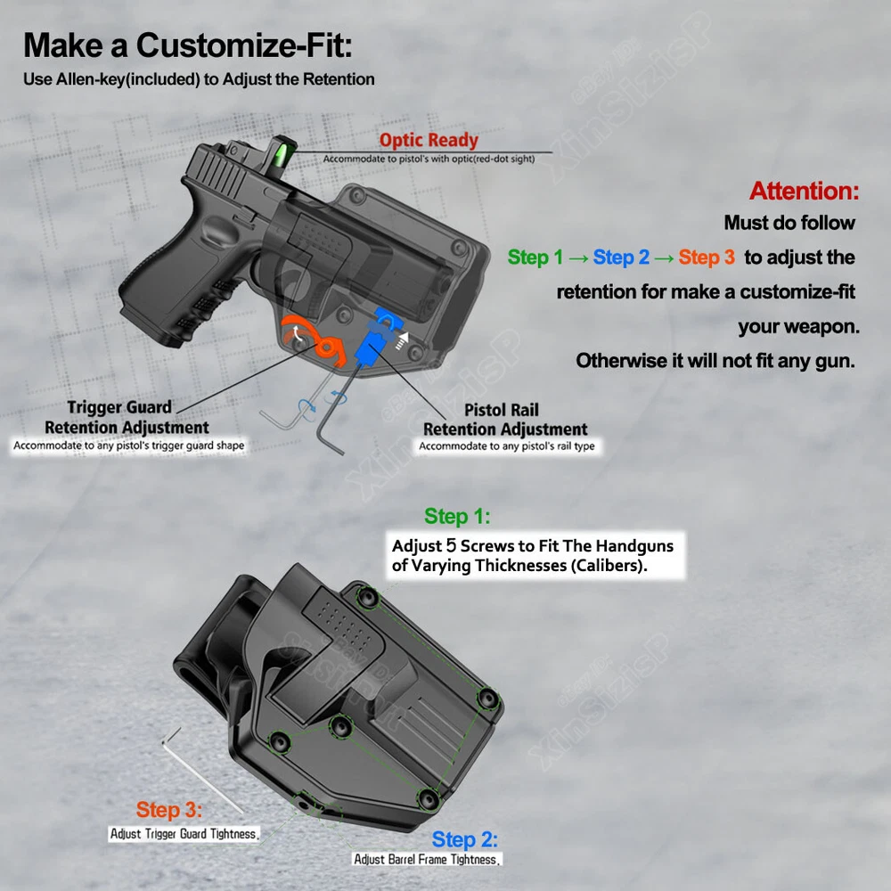 Mega-fit Holster / Versatile Holster / Universal Holster, Fits Most Popular Full Size and Compact Pistols, Fits Pistols with Red Dot, Fits Pistols with High Front Sight I tem D escription : Holster for SCCY SCCY CPX-1 9mm Luger SCCY CPX-1 RD 9mm Luger SCCY CPX-2 9mm Luger SCCY CPX-2 RD 9mm Luger SCCY CPX-2 Gen3 9mm Luger SCCY CPX-2 RD Gen3 9mm Luger SCCY DVG-1 9mm Luger SCCY DVG-1 RD 9mm Luger Attention: While you have the holster, please follow these three steps to adjust its retention for a customized fit, as shown in the listing picture. Proper adjustment ensures your weapon is secure. Without it, the holster may not fit any firearm correctly. 1) After adjust the retention , Weapon Compatibility - Outside Waistband Tactical H olster Fit Holster perfect work with suppressor sights, and fit all the capacity 9mm,10mm, .40 cal, .45 cal a n d 22LR for the gun. Compatible-Beretta Fits Beretta 92, 92X Centurion, 92S Full Size . 92G ELITE LTT , 92A1, 92FS, PX4, PX4 STORM, APX, M9A1, M9A3 without laser, APX Centurion 9mm, APX Compact 9mm , APX A1, APX A1 compact , M9A1 Compatible-Bersa Fits Bersa Thunder 9 Pro XT Compatible-BRG Fits BRG USA BRG9 Elite 9mm Compatible-Browning Fits Hi-Power, Hi-Power 640, Hi-Power 3D, Browning Mark III Compatible-Canik Fits TP9 Elite Combat, TP9 SFX, TP9 SF,TP9 Elite-S, TP9SA Compatible-Caracal Fits Caracal EF, Caracal F, Caracal F Gen II Compatible-Colt Fits Colt 1911-3'', 1911-4'', 1911-5'', M1911 A1, M1911, Colt 1911 .45, Colt 1911 9mm Compatible-CYMA Fits CYMA CM127 Compatible-CZ Fits CZ P07, P09, 75 SP-01 Shadow, Shadow 2, P-10C, P-10 F, 75, 75B, 85 Compatible-FN Fits FNX-45, FN-509 Compatible-Girsan Fits Girsan MC28, Regard MC 9mm, MC28 SA 9mm, MC 14T, MC P35 PI LW, MC28 SA, Regard MC, 1911 MC Compatible-Glock Fits Glock 17 Gen(1,2, 3, 4, 5), Glock 19 Gen(1,2, 3, 4, 5), Glock 19X, Glock 21, 22 Gen(1,2, 3, 4, 5), 23 Gen(1,2, 3, 4, 5), 24, 26, 27, 30, 31, 32, 33, 34, 35, 36, 41, 42, 43, 43X, 43X, MOS, 44, 45, 47, 47 mos, 48. Compatible-Heckler & Koch Fits H&K USP and H&K USP Compact, SFP9,VP9 Compatible-Hi-Point Fits Hi-Point C9 Compatible-HS Fits HS-9 Compatible-ISSC Fits M22 Gen2 Compatible-IWI Fits Masada 9mm, Jericho 941 9mm Compatible-Jericho Fits Jericho 941 RS Compatible-Kahr Fits CW45 Compatible-Norinco Fits Norinco NP22 Compatible- Palmetto State Armory Fits PSA Dagger Compact 9mm, PSA Dagger Full Size S 9mm, PSA Dagger Full Size SX 9mm, PSA Dagger Micro 9mm, PSA 5.7 Rock Compatible-Para ordnance Fits Para ordnance P12-45 Compatible-PREXER Fits Wist 94 Compatible-Radom Fits VIS 100 Compatible-Rock Island Armory Fits Baby Rock 380, BBR 3.10 45ACP, BBR Standard 380ACP, M200, M206, 1911 , SA 1911 Compatible-Ruger Fits Ruger MAX-9, Security-9, Security 9 Compact/ Pro/ Standard , Security 380, Ruger-5.7, Ruger American, SR1911, SR22, RSR9, SR9C, SR40, SR45, PRESCOTT 57, LC9 , Compatible- SCCY Fits CPX-1 (Gen 1 2 3), CPX-2 (Gen 1 2 3) , CPX-3 (Gen 1 2 3) , DVG-1, CPX-1RD / CPX-2RD Compatible- Sarsilmaz Fits AR-24 , AR-24K, B6, B6C, B6C7.65, B6C-LR, B6C-S, CM9, K-12 Sport, K-12 Sport X, K11, K2 45, K2 45C, Kilinc 2000 Light, Kilinc 2000 Mega, P8 L, P8S, SAR 9, SAR 9 C, SAR 9 METE Compatible-Shadow Systems Fits CR920 Elite, DR920, DR920 FS, DR920P, MR920 Compatible-Sig Sauer Fits Sig Sauer P365, P365 BB , P365X / XL/ SAS/ X Macro, P220, P225, P226, P228, P238, Sig Pro 2022 (Germany or USA version), SP2022 SAR, P938, P320, P229, P250, P320 Compact, P320 with Lima Laser Compatible-Smith & Wesson Fits Smith & Wesson M&P 9MM, M&P M2.0 9MM, M&P 40, M&P 45 ACP, M&P 40, M&P .40 C, M&P .45, M&P 9 M2.0, M&P Shield 9mm, 40, 45, M&P Compact 9, 40, SW9, SW9V, SD9 VE, SD40 VE, SD40, M&P 40 M2.0, 380 SHIELD EZ , 9 SHIELD EZ , M&P9, 9 SHIELD ,CSX, S&W 1911 Compatible-Springfield Fits Springfield XD-9, XD-40, XD-45, XD-S, XD-S .45 ACP, XDM-9, XDM-40, XDM-45 ACP, XDE-9, HELLCAT, HELLCAT PRO, Hellcat OSP / RDP 9mm , XDS-45, XDS-9, XDM , XDM elite 10mm , 1911 SA , 1911 Compatible-Steyr Fits Steyr Arms C9-A1, Arms C9-A2, Arms C9-A2 MF Compatible-Stoeger Fits STR-9 Compatible-Tara Fits TM9 Compatible-Taurus Fits Taurus Millennium, Taurus 100, Taurus 92, PT111 G2, G2C, G3, PT24/7, GX4, PT111, PT132, PT138, PT140, PT145, PT745, PT938, T800 series and Pro version, PT809, PT709, PT24/7, PT24/7-OSS, PT809C, PT840C, G3, TH9, Taurus 1911, Taurus PT 92 AF, TX22 compact, TX22 22LR Compatible- Tisas Zigana Fits PX-9, Tisas zig m1911 duty .45, Tisas M1911 .45 Compatible-Walther Fits Walther P99 QA, PPQ(M1 M2 M3), P88 9mm, PPQ Compatible-Zastava Fits EZ9, EZ40 ( Without embedded chassis, and no flashlight style ) 2) Holster with paddle - Push side buttons to achieve the fast opening and closing, unique design allows for belt carrying or vest carrying, perfectly used by duty holsters, uniformed law enforcement officers, security personnel, military personnel, private persons, and shooting sports holsters. And it fits closer to the body which can achieve better concealment under clothes. 3) Secure Level II Retention - Auto-locking system restrain pistol in OWB holster to ensure ultimate safety, activate the release by pressing the button with the index finger to achieve gun access . 4) Adjustable Carry Angle - Easily set Holster 360 degrees to your desire position with Allen key, compatible belt width up to 2 inches . 5) Tough, Durable Material - Custom-molded body made of polymer stronger than leather that will wear out, adapt to every bad environment Shipping: Ships same day or next except Sundays and Holidays ! Free shipping! Ship by USPS First Class Package. 100% MONEY BACK GUARANTEE . If it doesn't fit your pistol or you are not 100% satisfied just send it back for a full refund or exchange. We will even pay return shipping. A ny question please be free to contact with us .Thanks!