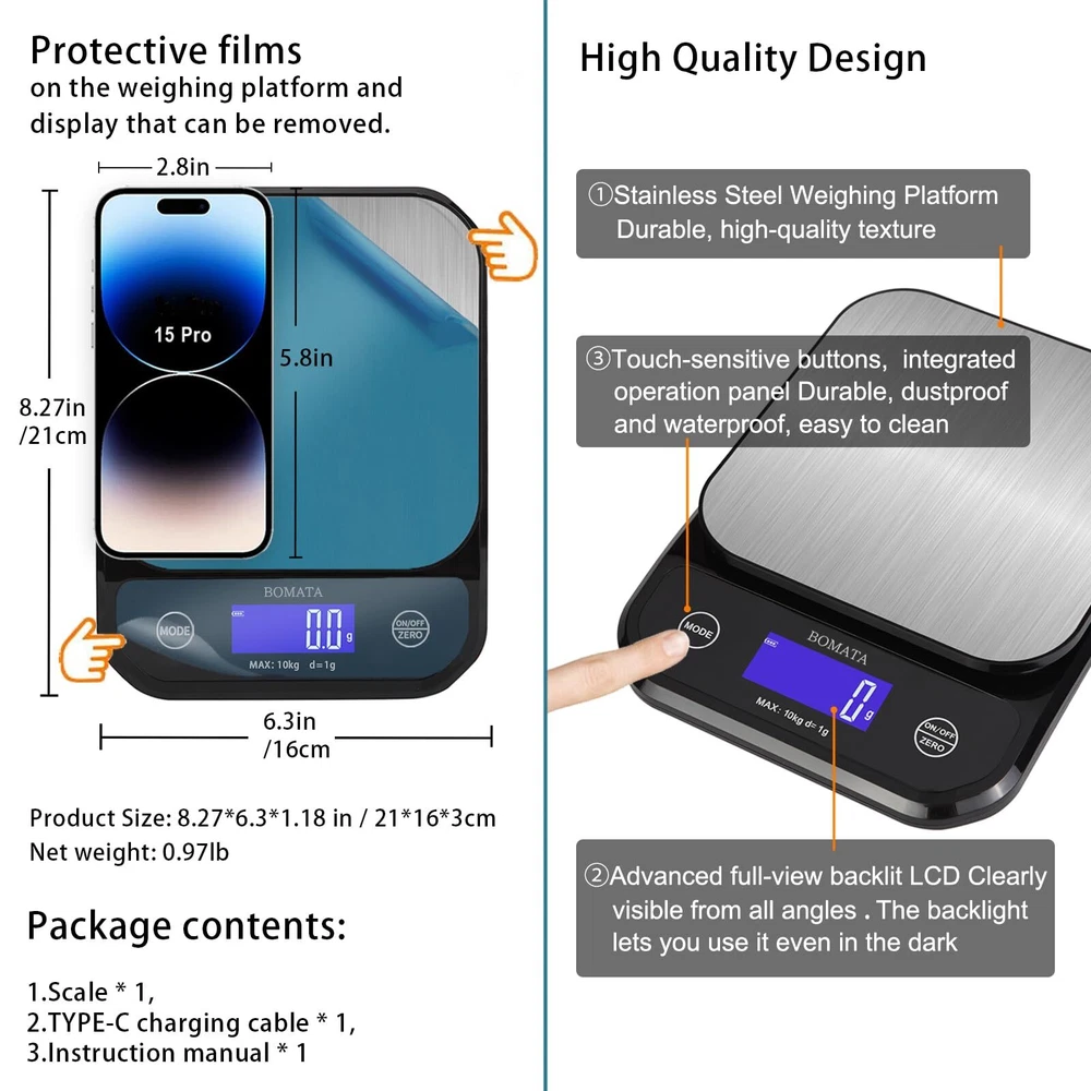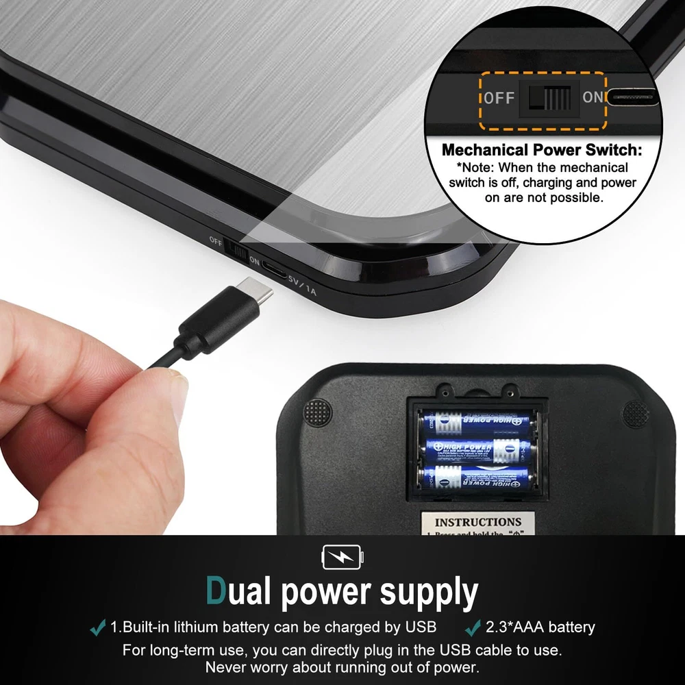 B609 Washable ScaleSuper Waterproof and DustproofEasy to clean, no worry about water damage to the scale. Not afraid of liquid, dust and humid environment, it's of better quality than ordinary kitchen scale. A washable kitchen scale is the best for making bread! Even if is spilled, it can be washed directly. Due to it being completely washable, dough, meat, etc. can also be directly placed on the scale without worrying about any cleaning trouble. [ IPX7 Waterproof , ] Can be submerged in 1 meter deep water for 30 minutes without damage. and washable to clean any dried flour, oil stain,spills, and food residue. Especially suitable for baking, Seafood, liquid and meat weighing. [ Large capacity and high precision ] Measuring range 0.1oz to 22lb (3g to 10kg)] in Increments of 0.05oz/1g. Use a single high-precision sensor. More accurate and stable than flat scales using four bottom sensors. [ Dual power supply, Rechargeable ] With built-in lithium battery can be charged by USB cable. Can also be powered by 3 AAA batteries. ※Make sure to take out the AAA battery when washing. (Accessories do not include AAA batteries) [ Multi-function , Better materials ] 5 Units (oz, lb, g, kg, ml), Tare function, Auto-off (cancelable), Calibration, Overweight and low battery warning. Internal circuits and sensors are strictly packaged and protected. Large weighing platform made of stainless steel, Wide viewing angle LCD with backlight , Touch-sensitive buttons with BEEP. [ 0% PURCHASE RISK ] is committed to creating quality products and services. SCALE comes with a -year . If the product does not meet your expectations, please feel free to us for a or .