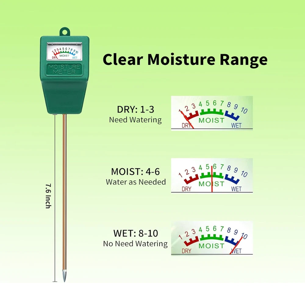 Soil Hygrometer for Plants, Soil Water Gauge Meter Indoor Outdoor, Soil Moisture Sensor for Garden, Lawn, Farm Plants Care (Green) 【Stop Over Watering】: Are you always bothered whether your plant needs watering or not? Don’t know when to water your plant? You need this soil moisture meter to help you eliminate the guesswork. 【Easy to Use and Read】: Stick the moisture meter probe into plant root level, the big and clear screen will show moisture readings immediately. 10 scales of 3 moisture range DRY-MOIST-WET, easy to read and understand. 【Accurate and Reliable】: Single moisture sensor probe is very sensitive, responds quickly. Reading is fast and accurate. No batteries or electricity needed, convenient to use. 【Long Sensitive Probe】: 7.6” inch long moisture sensor probe can easily get to plant root level that fingers can’t reach, less hurt to the root, help to better know the soil moisture condition. 【Indoor Outdoor Plant Care】: This soil moisture meter is designed for testing plant soil moisture only, suitable for potted plants, hanging flower baskets, picky plants, vegetables, fruits, grass.A great handy tool for home gardeners, plant lovers, beginners.