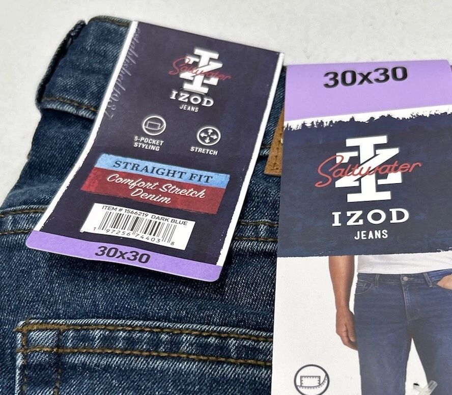 IZOD Men's Straight Fit Comfort Stretch Denim Jeans Stained (See the Pictures Please) Size: 30X30 Color: Dark Blue Content: 68% Cotton / 26% Polyester / 4% Other Fiber / 2 % Spandex