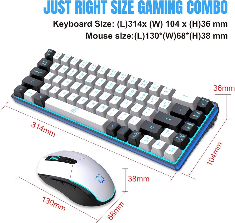 Product Description 60% Wireless Gaming Keyboard and Mouse Combo,Ice Blue Backlit Rechargeable 2000mAh Battery,Mini Mechanical Feel Anti-ghosting Keyboard + Popular RGB Mice for Gaming, Office(White-Black) Small Gaming keyboard Mouse Combo — team has been working hard to develop just right size gaming combo that can balance work and games. Now,K68 come true to you,which will make your desk cleaner and travel more convenient 2.4G wireless keyboard and mouse — 2 in 1 keyboard and mouse combo shares ONLY only a USB tiny receiver placed in the slot at the bottom of the keyboard. It adopts advanced stable 2.4G wireless transmission technology, and the mini wireless keyboard and mouse have no signal interference, no delay. The effective transmission distance is 6-10 meters Rechargeable and Long Battery Life — This rechargeable 60 wireless keyboard is equipped with 2000 mAh battery,and the mouse is equipped with a 500 mAh battery. It only takes 2 hours to charge the keyboard by 5V/1A , and it can be used continuously for more than 40 hours with light. Support energy-saving sleep mode Ice Blue Light and Ergonomic Design — team choose the most popular ice blue lighting color for you, no messy. Press “ FN+ON” for breathing function. The unique structural design and built-in steel plates, etc., make the small keyboard have a very similar black switch mechanical feel. The cute pocket-sized mouse contains seven brilliant colors. The wireless mouse buttons also make a crisp sound of game atmosphere. Try,you will feel so good in your hand Universal Compatibility — Plug and play, no driver needed. This small wireless keyboard mouse combo supports Windows (95/98,ME,NT,XP,VISTA/ 7/ 8/ 10). Compatible with IBM PC and Apple MAC systems. Multiple language versions are supported (Note:The code has been completed by default. If the connection is lost for any reason, you only need to reset the code pairing) About Us We are a reputable seller with many years of experience selling on eBay. Our goal is to provide high-quality products and excellent customer service. Shipping Items will be shipped within 1-3 business days when we received payment. (Orders are not processed on weekends & holidays) Tracking information will be sent once item is shipped. Delivery time depends on destination and other factors Item is shipped to ebay address. Leaving correct address can minimize delay. For international shipping and shipping to Guam, Hawaii and Alaska, Please contact us before placing the order. International buyers please note: Import duties, taxes and charges are not included in the item price or shipping charges. These charges are buyer’s responsibility. We will try our best to reduce the risk of the custom duties. Local pick-up is unavailable at the moment. Contact Us We reply any email messages within 1 business / working days(off-duty at weekend). If you do not get a response from us, then please check your junk or spam mailbox. Our Business hours: Mon-Fri 9:00-18:00, UTC/GMT +8 hours. Please contact us either by clicking "contact seller" in the "purchase history" section or simply click "ask a question" at the bottom of this page. If you are unsatisfied with our item or service, please contact us before leaving any feedback. We are committed to resolve all issues in a friendly and satisfactory manner.