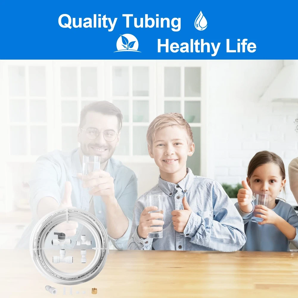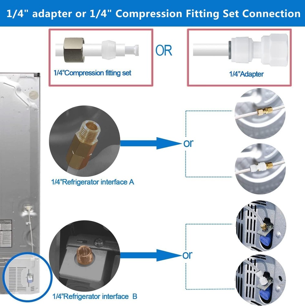 Ice Maker Water Line Kit - Food Grade Refrigerator/Fridge 25 feet, White Product Details 【Widely Compatibility】:Our water line kit is compatible with most brands and models of refrigerator such as Samsung, GE, LG, Whirlpool, Frigidaire, etc. Perfect for connecting most standard under sink filtration system or reverse osmosis systems (1/4"or 3/8" Outlet) to refrigerator,ice maker,water dispenser and more. 【Safe Material】:Our Ice maker water line kit is made by food grade materials, have tested to meet NSF/ANSI standards and BPA free.Ensure you and your family enjoy crystal ice cubes and delicious pure water. 【Easy Installation】:The fittings in the water line kit are standard and Push-in quick connect,no additional tools required. Also a clear installation instructions help you complete your work in minutes. 【Prime Quality Accessories】:The accessories in our kit are extremely safe and durable,there is no need to consider replacement for several years. 【Include All Parts You Need】:25 FT 1/4" OD tubing, a 1/4" x 1/4" x 1/4" tee(for 1/4" outlet water filters),a 3/8" x 1/4" x 3/8" tee (for 3/8" outlet water filters),a 1/4" shut off valve,1/4" straight fitting,a 1/4" adapter,and a compression fitting set (2 insert, 2 sleeve, 1 nut).