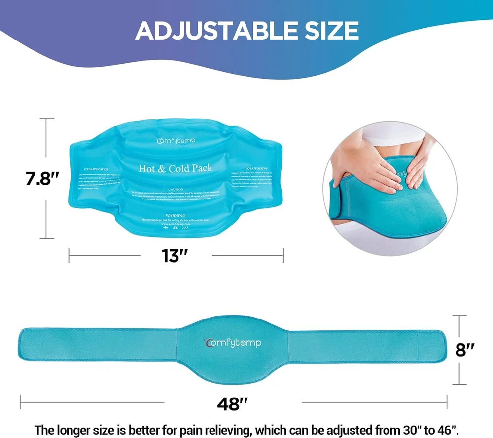 Hot and Cold Therapy: This flexible back ice pack provides both cold and hot therapy. It can be heated 40S in microwave for 30mins penetrating muscle spasms therapy, and can also be frozen 1h in freezer for 30mins deeper cold compress. A perfect hot and cold therapy for waist and lower back pain relief Targeted Back Pain Relief: Uniquely designed to provide targeted back pain relief by contouring to the shape of the back, this reusable ice packs for injuries actively reduces inflammation to alleviate pain associated with lower lumbar, sciatic nerve pain relief, degenerative disc disease, and coccyx tailbone pain Stay In Place With Adjustable Strap: With an adjustable waist belt, our waist ice pack supports up to 48" waist circumference. You can control the compression level and achieve the most comfortable results, and enjoy the hands free relief anywhere Flexible & Leak-proof: This back pain relief products is filled with professional-grade gel that allows them to remain pliable when frozen, and the double-sealed seams effectively prevent leakage and tears for better application, great sciatica pain relief products Safe & Reusable: This cold ice pack is latex-free and non-toxic gel, high-quality durable nylon & vinyl fabric provides extra safety and comfort to prevent skin irritation or discomfort during use Support: All Comfytemp ice packs are FSA HSA Approved/Eligible. Backed by our dedicated customer support team that offers quality service and peace of mind with prompt responses and effective solutions to millions worldwide, you can trust Comfytemp. This lower back ice pack wrap hot cold therapy is an ideal after lumbar back surgery gift for women and men, as well as a thoughtful pain relief gift for men, women, friends, familys, mom, dad on Mother's Day, Father's Day, birthdays, and Christmas. Product Description Become Pain-Free With Comfytemp Comfytemp Ice Pack for Back Pain Relief Reusable Gel Wrap is your go as it perfectly molds to the shape of your lower back, or wherever your aches and pains are. Mold it into your muscles and joints for instant relief right where you need it. Natural Therapy For Back Pain Relief Uniquely designed ice wrap to provide targeted back pain relief by contouring to the shape of the back, this reusable ice pack for injuries actively reduces inflammation to alleviate pain associated with lower lumbar, sciatic nerve pain relief, degenerative disc disease, and coccyx tailbone pain. What Makes Comfytemp Stand Out? A perfect hot and cold therapy for waist and lower back pain relief . Both hot & cold compress help eliminate fatigue and pain. 1 One Size Fits Most 2 Better Compression 3 Safe & Trusted Gel Pack 1 Targeted Back Pain Relief 2 Hands Free Application 3 Fits Men & Women 1 Other Replaced Ice Packs 2 Reusable Body Ice Packs 3 2 Gel Ice Packs