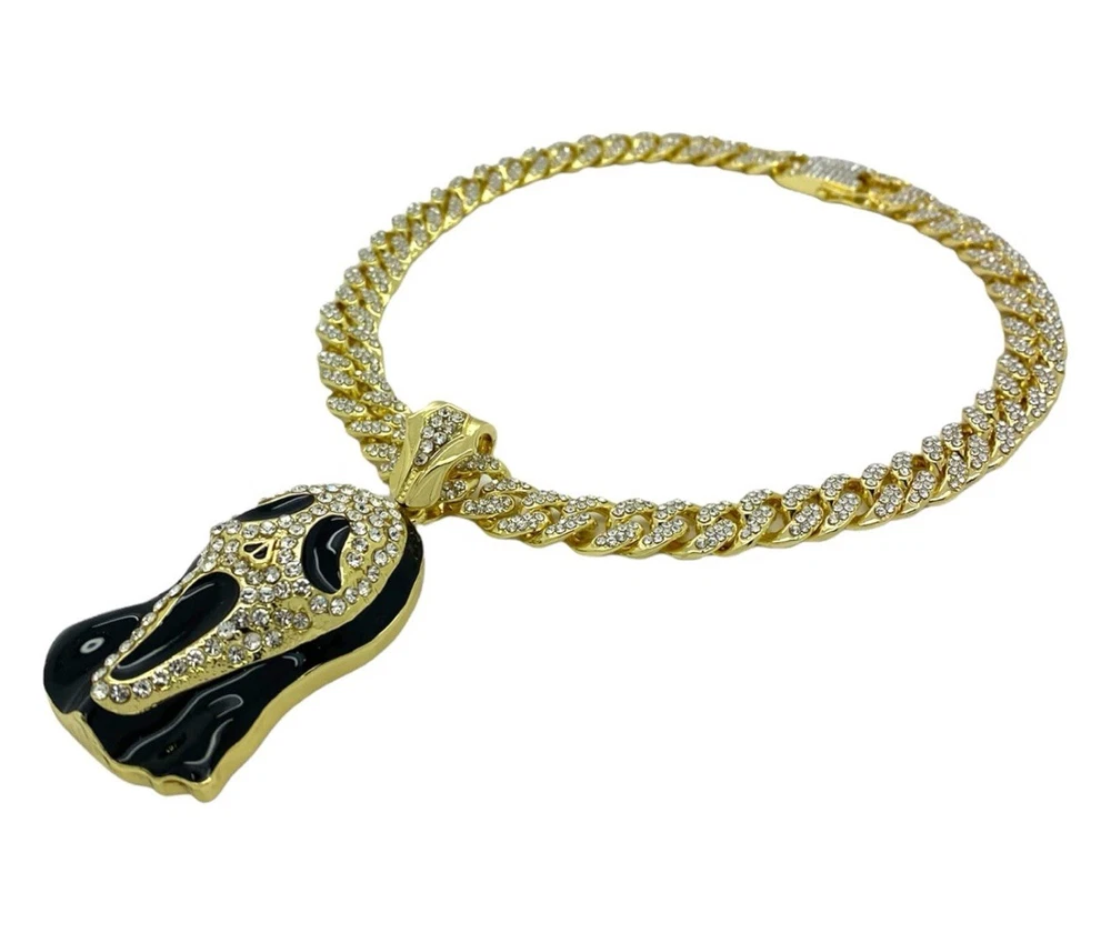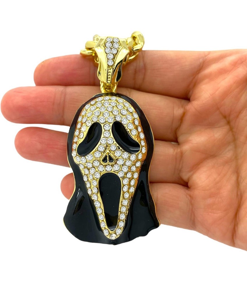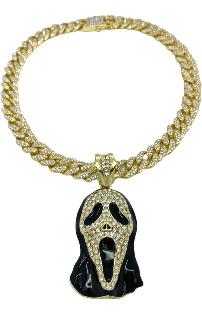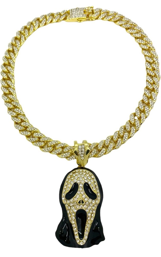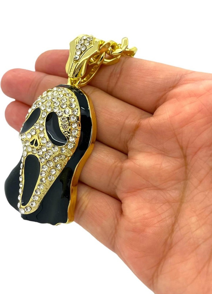 Elevate your style with this stunning Iced Out “SCREAM MASK” Pendant & Chain, a stunning addition to any classy jewelry collection.. With its gleaming gold color and eye-catching round white cubic zirconia stones, this piece is designed to dazzle and impress.. The pendant pays homage to iconic movie characters, adding a touch of pop culture flair to your look. Perfect for anniversaries or just to show off your unique taste, this pendant comes with an 18-inch chain to complete your stunningly bright accessory.. Whether you're dressing up for a special occasion or adding some personality to your everyday wear, this unbranded pendant is a versatile choice that speaks to your bold style and love for standout pieces.