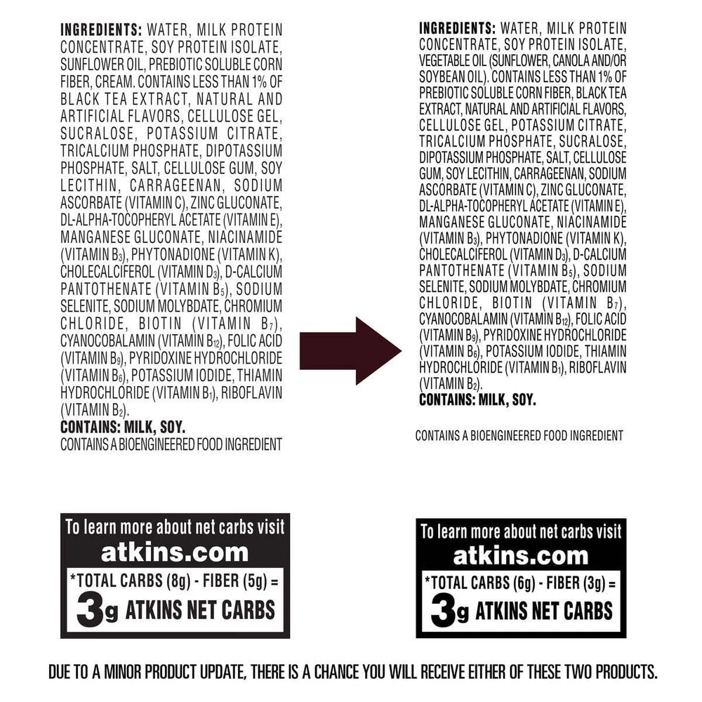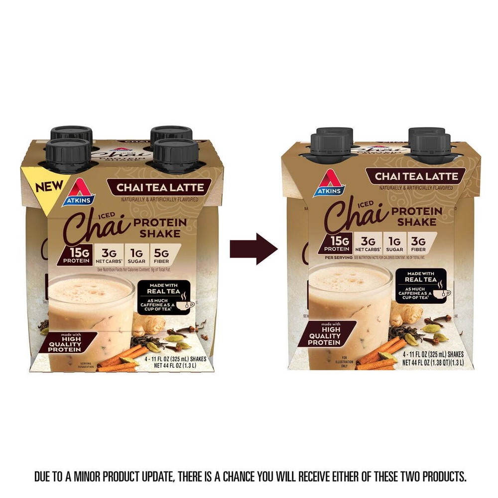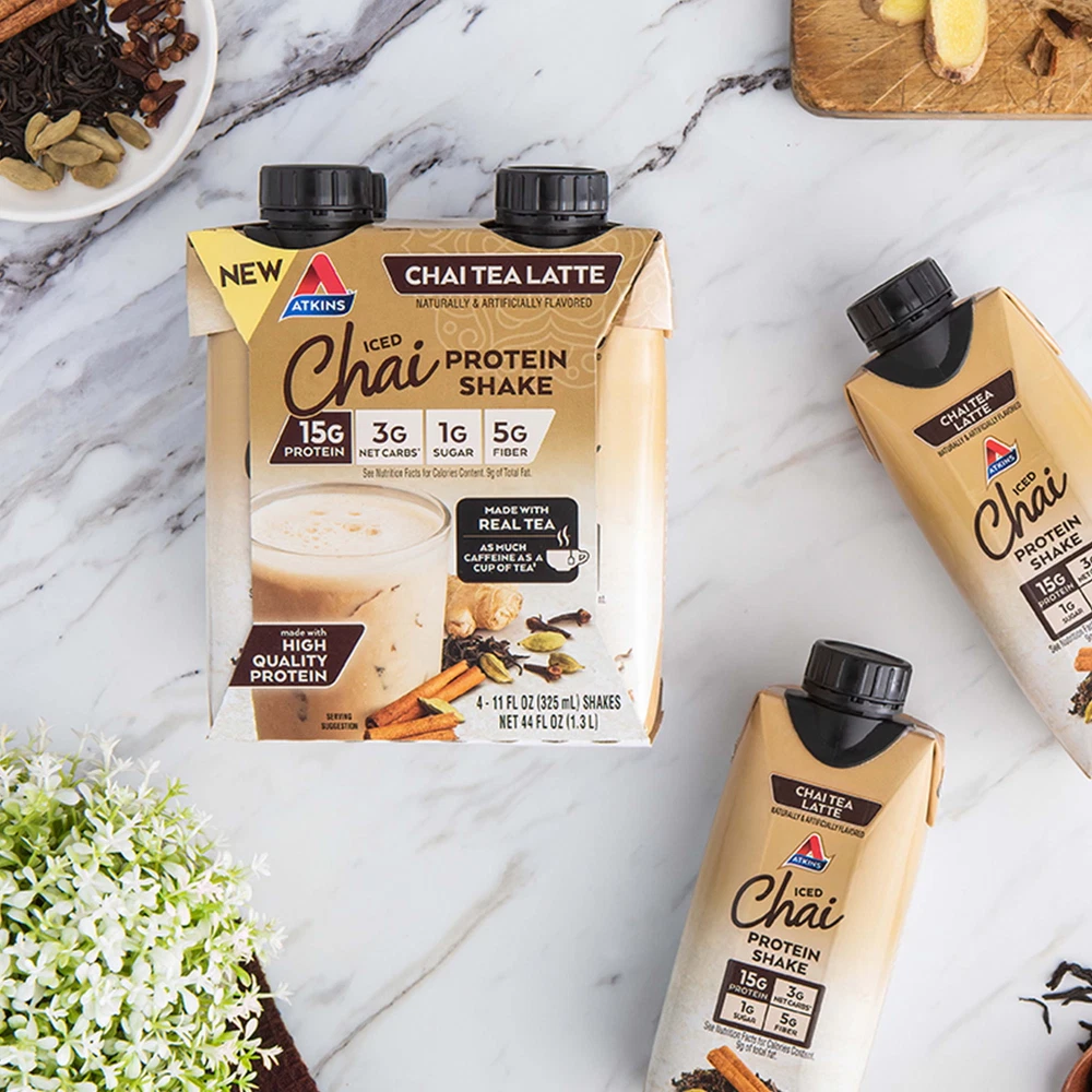 Chai Tea Latte flavored Protein Shakes are low sugar*, low carb* and bring together the invigorating taste of chai tea flavor and the enlivening kick of a cup of tea in a delicious protein shake. There’s nothing quite like a gluten free, low glycemic protein shake with the great taste of chai tea and the caffeine* of a cup of tea to get you going, with 15g of protein, 3g of net carbs, and 1g of sugar per serving*. They’re also keto friendly*, a good source of fiber* and contain no artificial growth hormones. AT HOME OR ON-THE-GO. Atkins Chai Tea Latte Protein Shakes. Enjoy delicious shakes that fit right into your busy schedule, with 15g of protein, 3g of net carbs, and 1g of sugar per serving*. YOUR APPROACH. Help give your body the nutrients it needs without sacrificing your favorite flavors. AMAZING RECIPES. Delight in the nutrients and satisfying flavors of great foods made with quality ingredients. Offered in 4ct cartons containing individually bottled 11 fl oz shakes. TASTE WHAT’S GOOD. Stay true to your low carb lifestyle with these delicious protein shakes. *See Nutrition Facts for Calories and Saturated Fat Contents. Fiber: 9g Total Fat per serving. Low Sugar: 1g Total Sugar per serving. Not a low calorie food. Low Carb: 6g Total Carbs, 3g Net Carbs per serving. Caffeine content per shake as compared to a standard 8 fl oz cup of brewed coffee.
