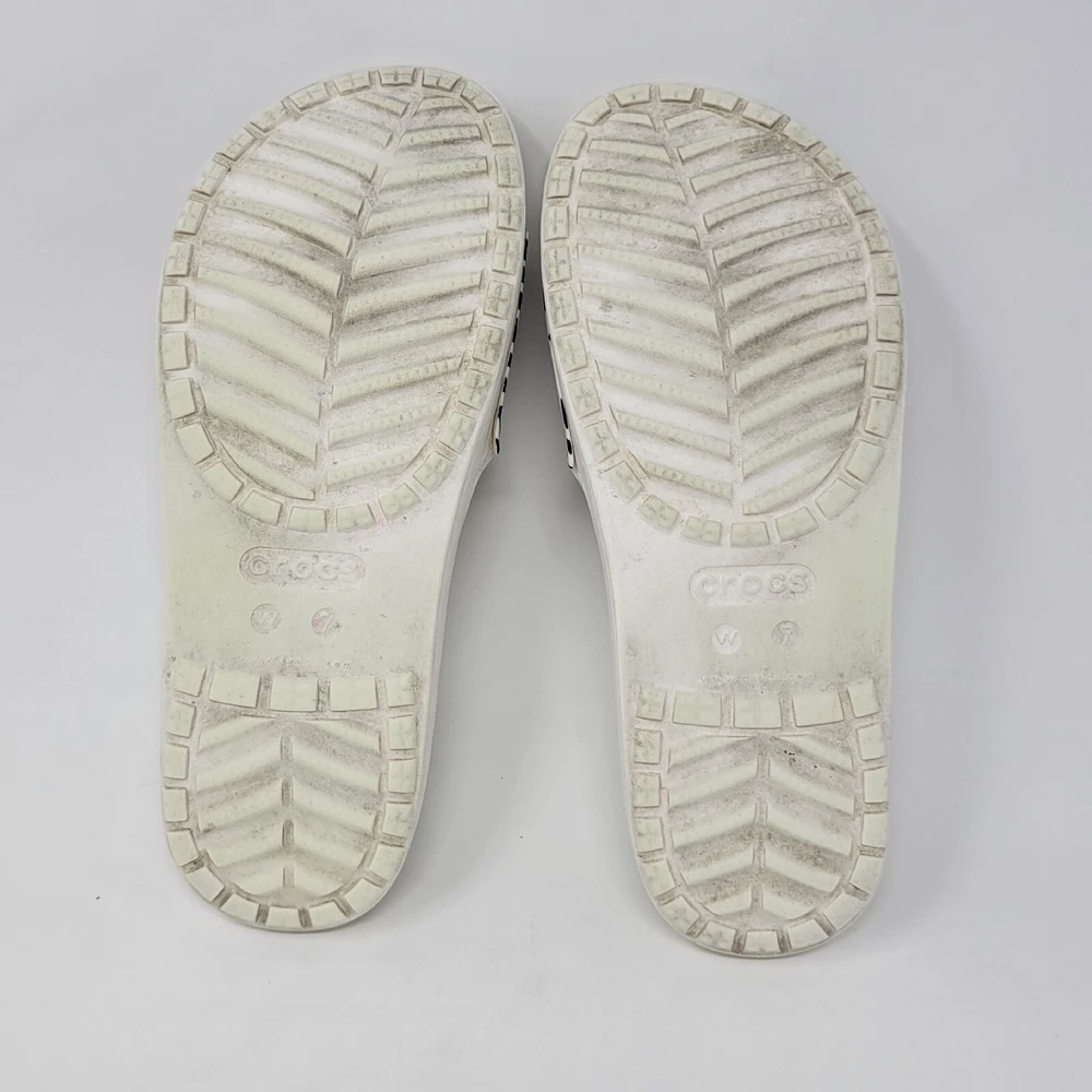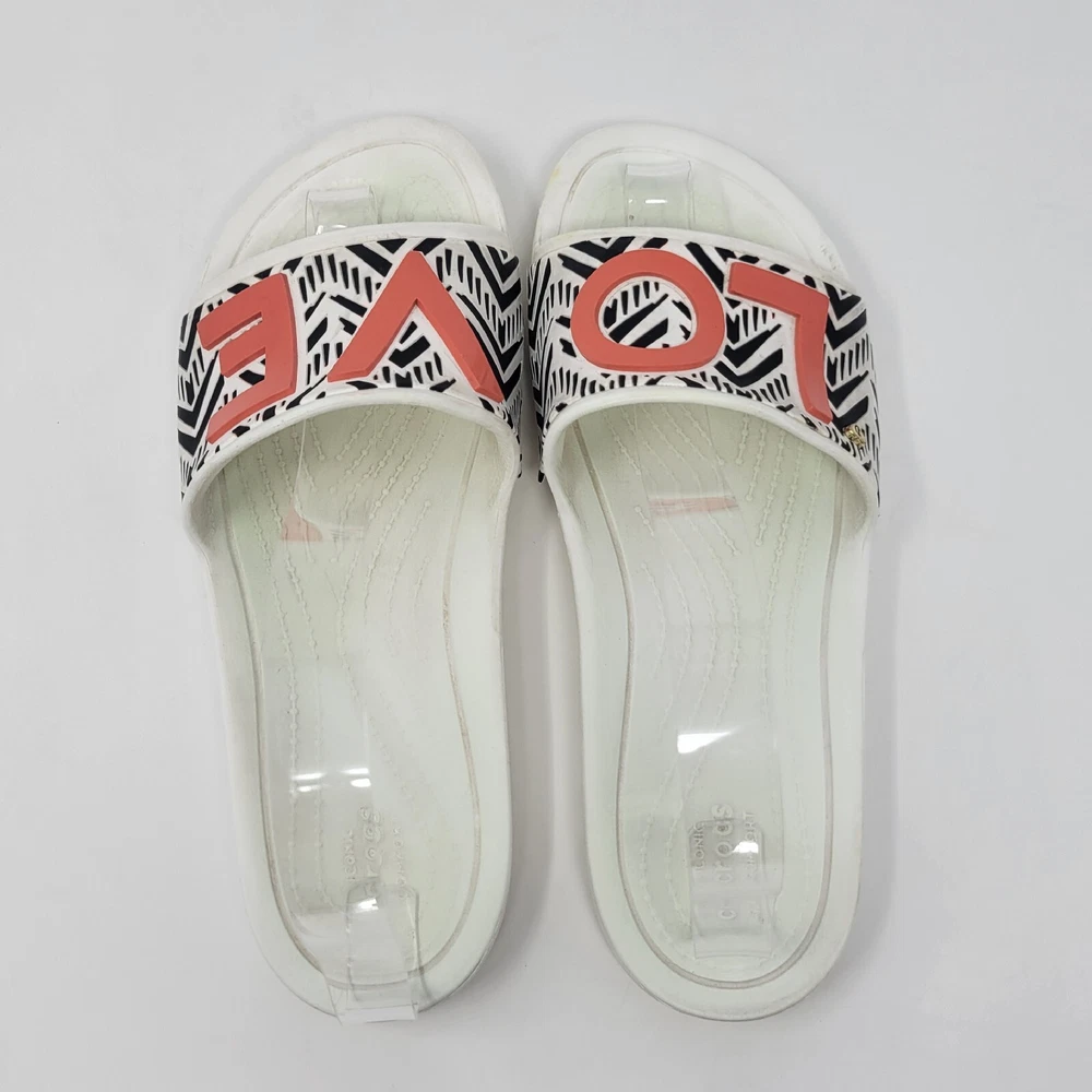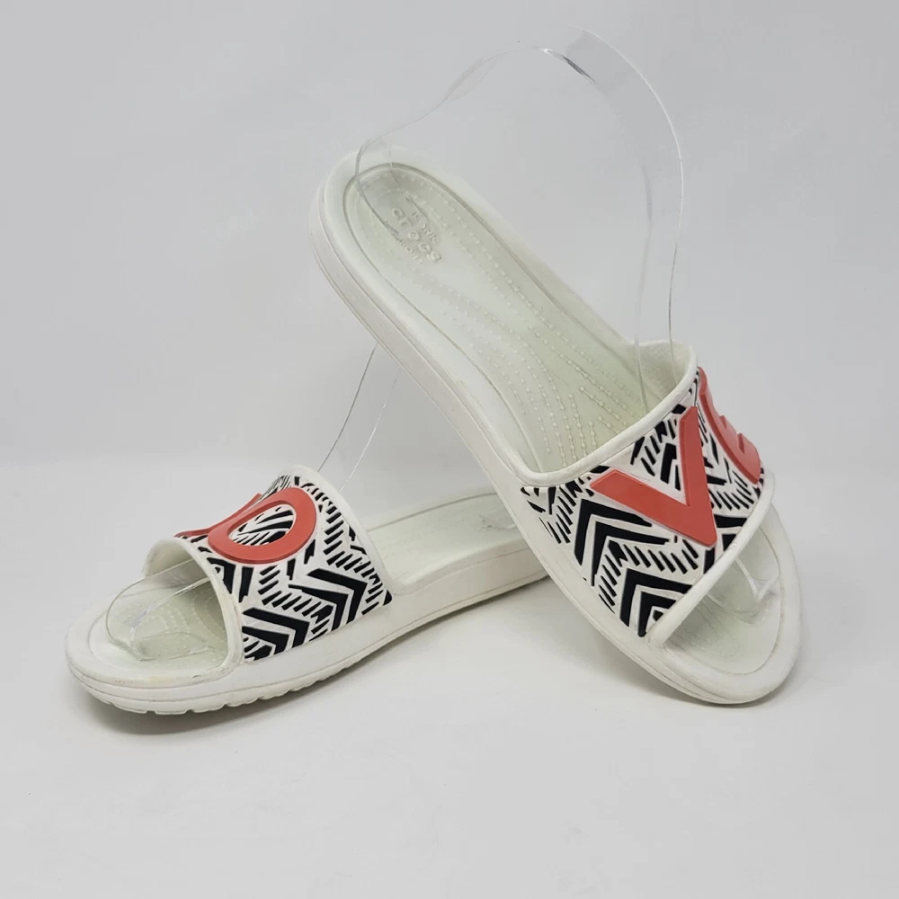 Elevate your casual style with these iconic Crocs women's slide sandals featuring a trendy white, black, and red tribal love pattern. These lightweight sandals provide maximum comfort with a flat heel style and slip-on closure, making them perfect for your travel and casual wear needs. With a synthetic upper and lining material and a synthetic outsole, these sandals are durable and long-lasting. The sandal's accents include a logo, and the theme includes hipster, letters, numbers, and words, hippie, college, 80s, city, tribal, 90s, retro, hip hop, and logo, making them a versatile addition to your shoe collection. These sandals are available in US shoe size 7 and UK shoe size 5, with an EU shoe size of 38. These shoes are in excellent “pre owned” condition. For more information, please see photos or feel free to contact me with any questions. All orders are shipped within 24 hours of payment received.