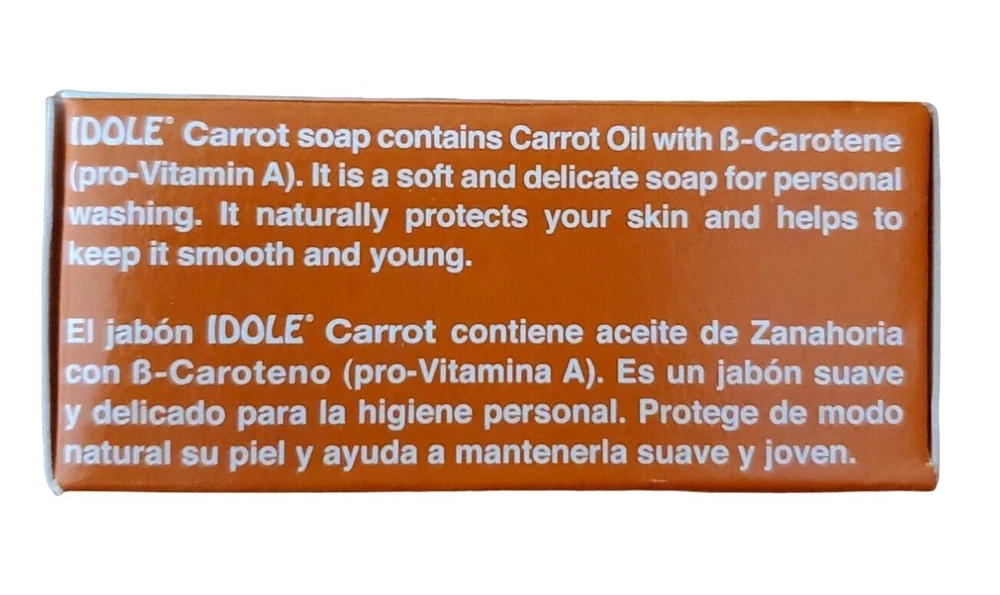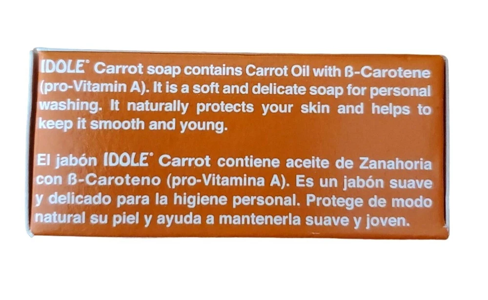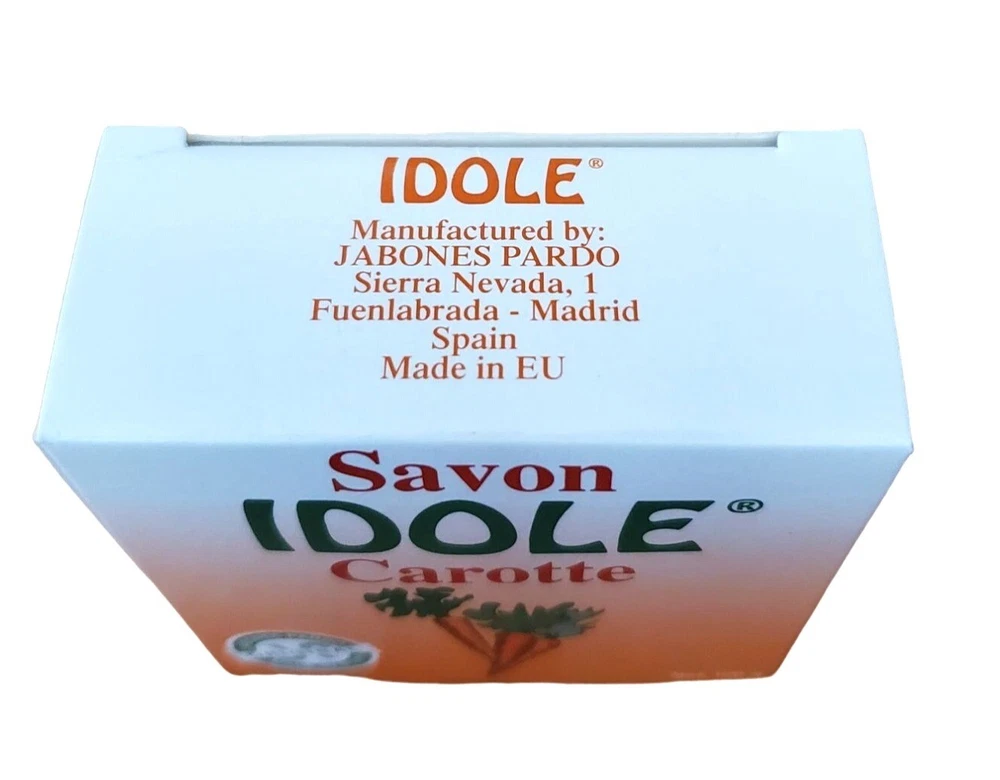 Idole Carrot Soap 3.5oz / 100 grams B-Carotene Savon Carotte Jabon Zanahoria Made in Spain Quality luxury bar soap Natural soap that contains carrot oil with B-Carotene (pro-vitamin A). It is a soft and delicate soap for personal washing on the face or body. It naturally protects your skin and helps to keep it smooth and younger looking. Enhance your skincare routine and discover your radiant natural glowing skin with quality renowned brightening properties. Infused with the power of carrot extract, this soap is designed to leave your skin looking refreshed, vibrant, and flawless Your bath/shower skincare routine just received a upgrade and let your inner radiance shine through with every wash. Features: Carrot Extract Magic: Idole Carrot Soap is enriched with pure carrot extract, a natural ingredient celebrated for its skin-brightening and tone-evening. Hydrating Elegance: This soap isn't just about beauty; it's about all over body/face care. Enjoy the moisturizing touch that leaves your skin feeling soft, supple, and well-nourished. Antioxidant Shield: Carrots are packed with antioxidants that help protect your skin from the effects of daily exposure to the elements, leaving it looking youthful and rejuvenated. The natural benefits: Contains Carrot Seed Oil with Carrot Root Extracts It is a soft and delicate soap for personal washing in the bath or shower. It naturally protects your skin and helps to keep it smooth and young. Leaves your skin healthy, refreshed and ready to use this brightening care. The soap deeply cleans and softens the skin on the face and body. It contains carrot oil that helps reinforce its protective action. Day by day, the skin is Also, it rejuvenates mature skin for a more uniform and radiant even tone. Natural for daily use Ingredients in Idole Carrot Soap for Skin Brightening: Sodium Tallowate, Sodium Palmate, Aqua, Sodium Cocoate, Glycerin, Parfum, Sunflower Seed oil, Carrot Root Extracts, Carrot Seed oil, Beta Carotene, Ascorbyl palmitate, Hexyl Cinnamal, Benzyl Salicylate, Limonene, Sodium Chloride, Trisodium HEDTA El jabon Idole Carroit, contiene aceite de Zanahoria con B-Caroteno (pro-Vitamina A). Es un jabon suave y delicado parala higiene personal. Protege de modo natural su piel y ayuda a mantenerla suave y joven. We are a small family owned business located in Florida ALL ITEMS PURCHASED FROM THE DISTRIBUTOR AND WILL ARRIVE WITH A LONG EXPIRATION DATE
