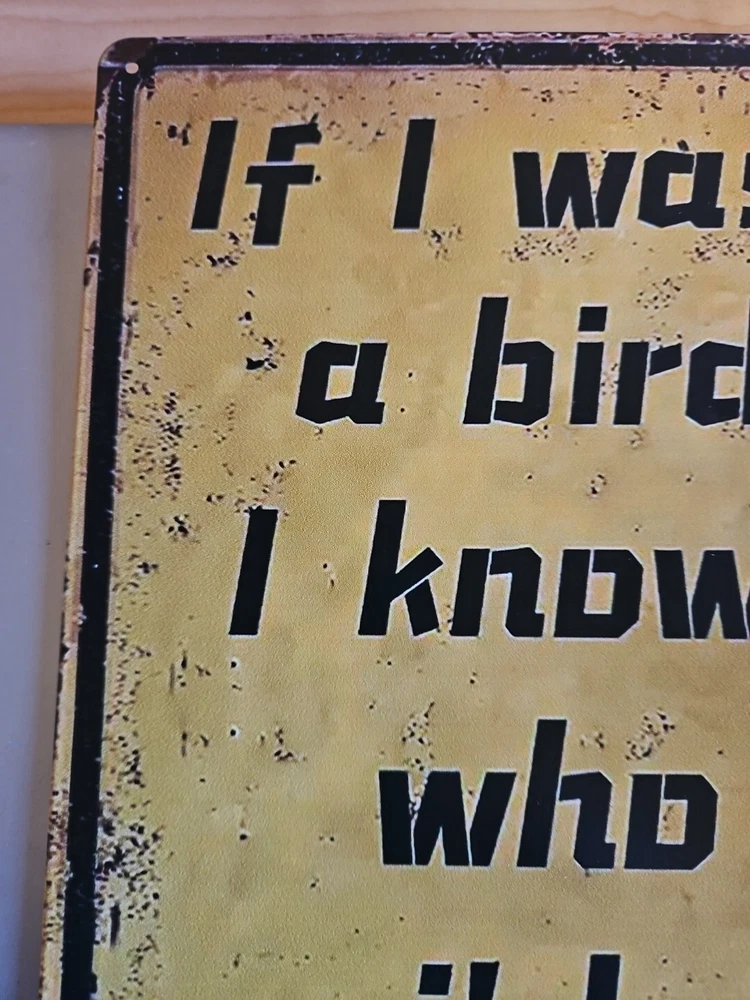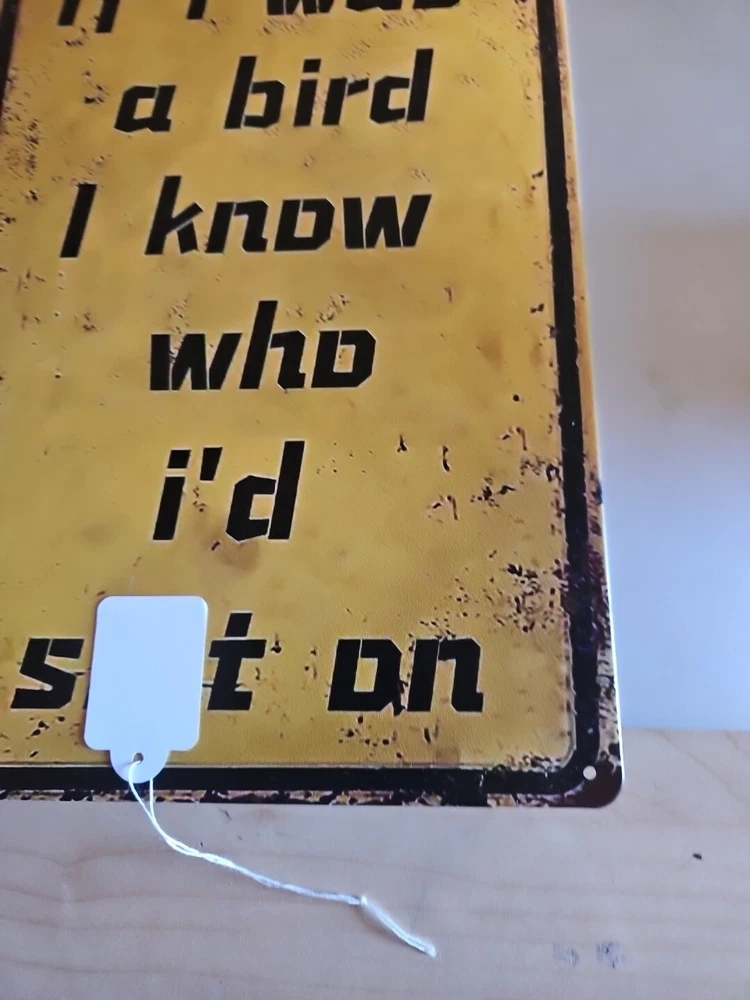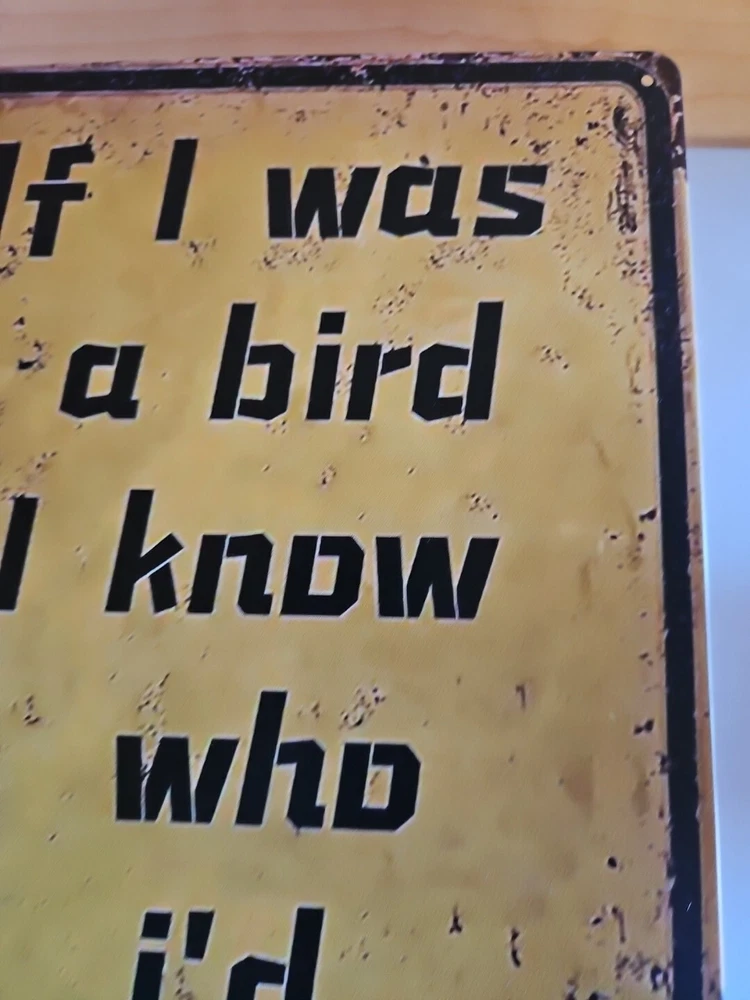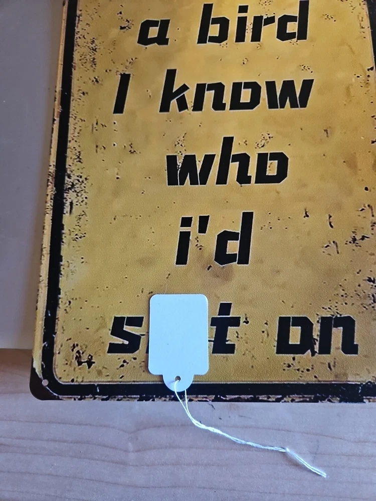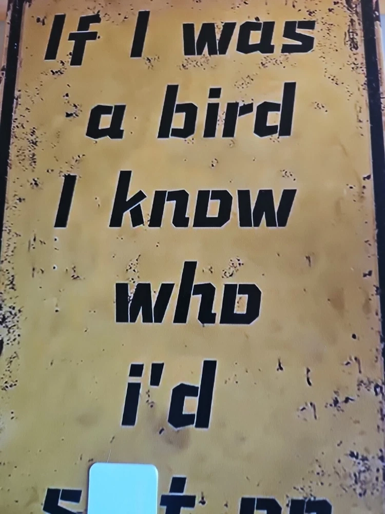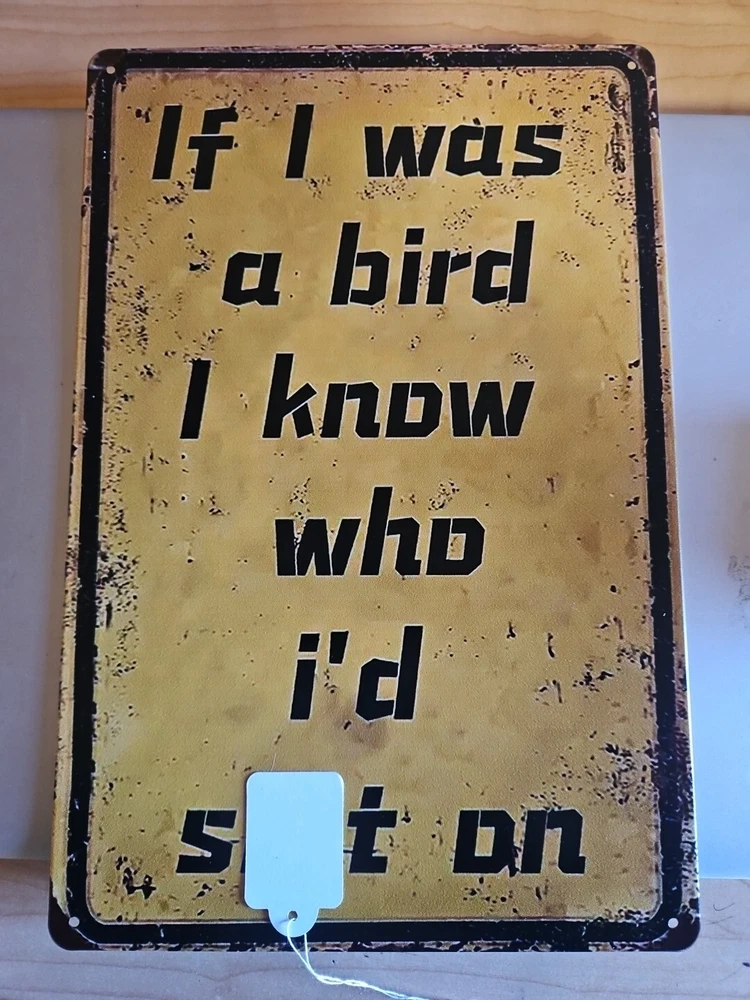 This metal sign with the title "If I Was A Bird" is perfect for any room in your home. The rustic and primitive style of this rectangular sign is sure to add a touch of revenge to your home décor. Made of high-quality metal, this sign is ready to hang and will make a great addition to your collection of decorative items. The sign features a metallic finish and is shaped like a bird, making it a unique and eye-catching piece. It measures 8x12 inches and comes with a hanging feature, making it easy to display in any room. Whether you're a fan of birds or simply looking for a unique piece of décor, this metal sign is sure to impress. Word is blocked out, but you can figure out what it says.