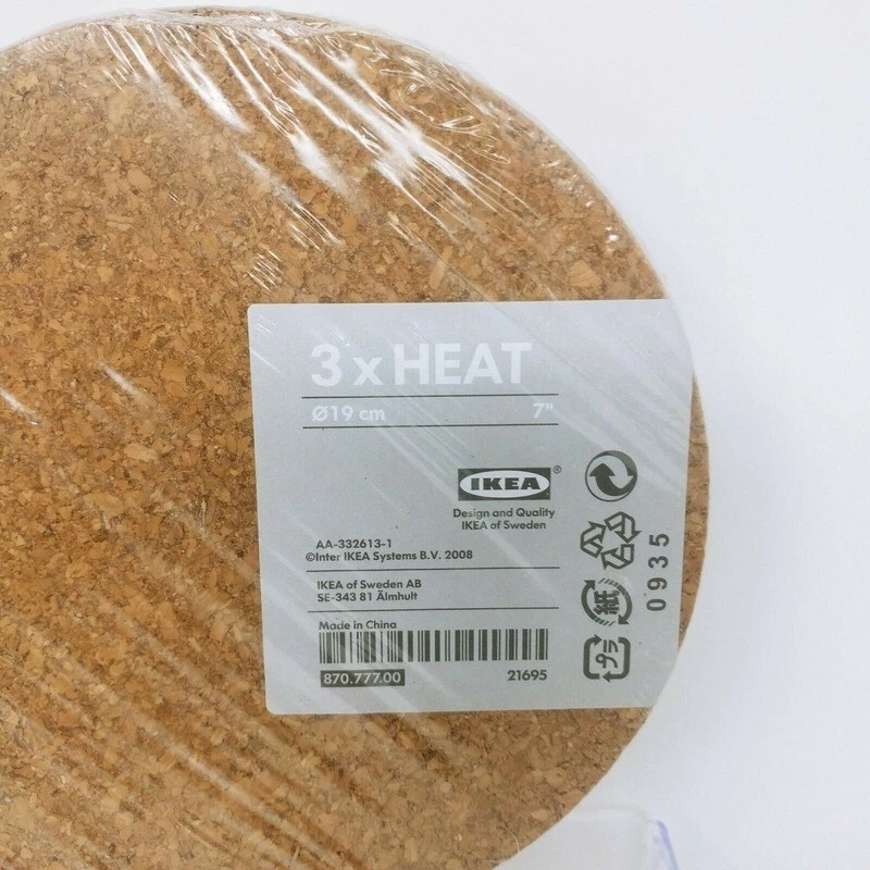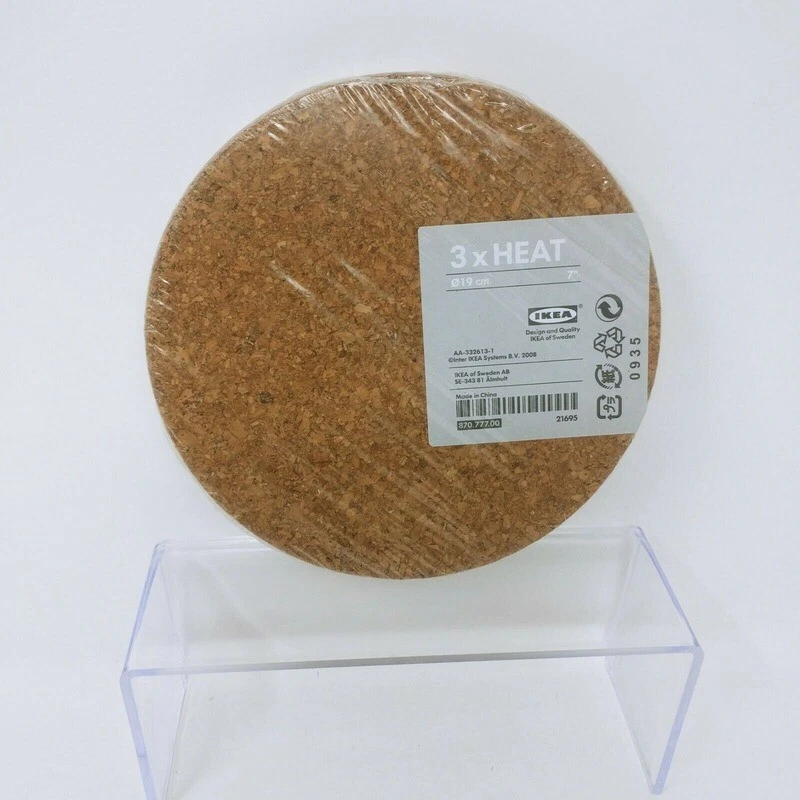 IKEA Heat Trivet - 7" Cork (Set of 3) Good to know You can combine several pot stands to fit larger pots and dishes Product dimensions Diameter: 7" Package quantity: 3 per pack Product description Cork Article Number: 870.777.00 Care instructions Wipe clean with a damp cloth People & Planet Renewable material (cork) Typically ships within a business day after receipt of cleared payment Various shipping options available at check out Buyer responsible for correct shipping address, we only ship to authorized PayPal addresses Combined invoicing available on multiple product purchase via "shopping cart" function Thank you for your consideration! RETURN POLICIES We offer a 30 day return policy from checkout. Please contact us for before returning item (unauthorized returns shall not be processed). Items defective upon receipt must be packaged in their retail packaging as if new and returned with a detailed description of the problem. To qualify for a refund, the product must be UNOPENED and returned within 30 days of checkout. Goods must be returned in the original box, in perfect condition, unused, no seals broken and with no missing parts. Buyer responsible for return shipping & handling fees and are not refundable. In the event of an exchange the delivery & handling cost will be paid for by the Buyer. Unfortunately we do not accept returns of such item(s): Health & Beauty, perishables, intimate apparel, OPENED, WASHED, WORN and/or USED item(s). We reserve the right to decline any returns if the above guidelines are not followed. If the item arrives to you and it shows visible damage as the carrier is delivering to you, please refuse the delivery so it will be returned to sender and please contact us immediately. On Nov-04-20 at 22:11:10 PST, seller added the following information:
