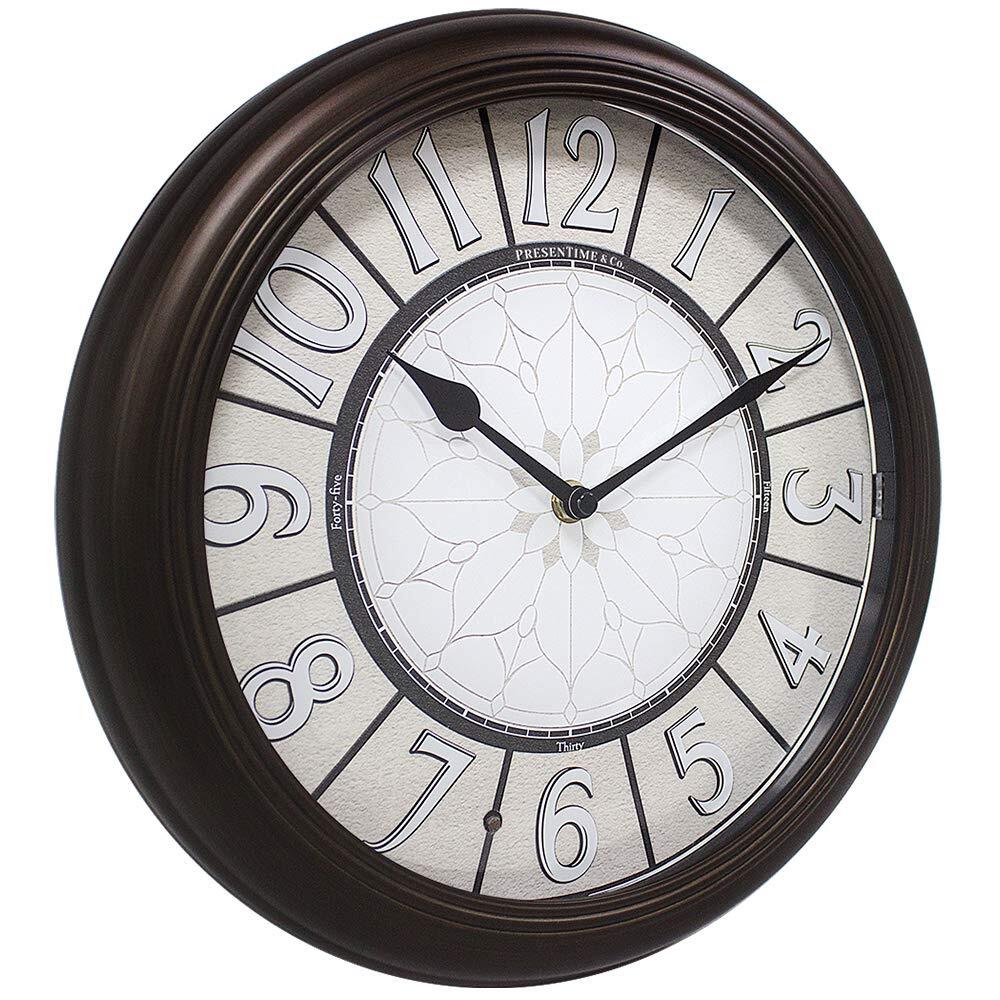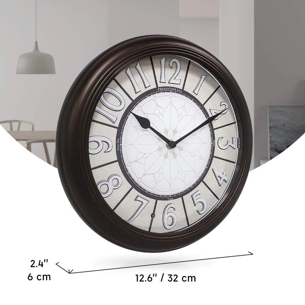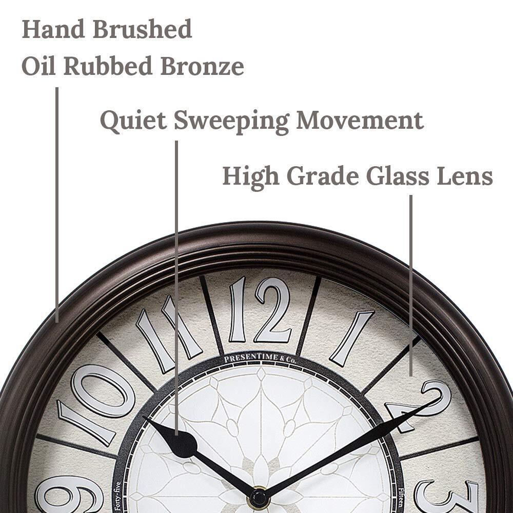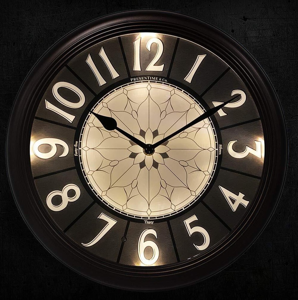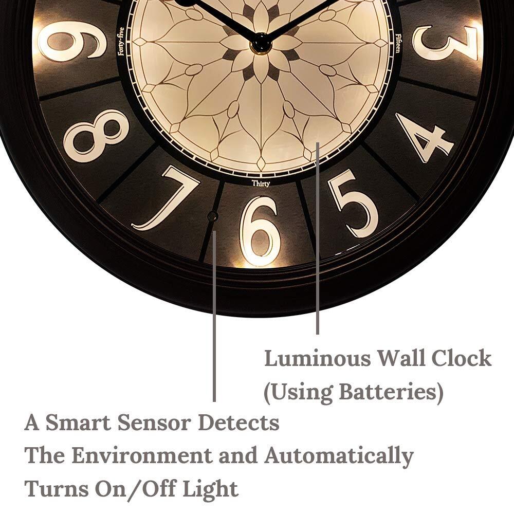 ★【 Elegant & Smart Self-illuminated Clock 】: This elegant 12.6 Inch Premium LED clock is built with bright warm white lights and a smart light sensor on clock face which detects brightness/darkness of the ambient environment and automatically turns on/off lights in low/bright light. (does not light when switched to OFF). ★【 No Cables Swinging Around and No Need to Plug into Power Outlet 】: It is engineered to operate on 1 x AA battery for clock movement and 4 x C size batteries for LED lights and sensor, Not included. With 4 x C size batteries, the clock lights up reliably from 6 to 12 months, depending on the environment it is hung on. ★【 Enjoy the Silence- Accurate & Quiet Sweeping Quartz Movement 】: No ticking sound at night gives you a sweet dream through the whole night. 1 x AA battery for operation, not included ★【It's In The Details】: Hand brushed oil rubbed bronze & retro luminous clock face at night. Elegant & vintage design for living room, fireplace, bedroom, kitchen, or patio, garden, backyard, on the wall by the pool. Farmhouse, Coastal, Antique, Vintage, and Classic Wall Clock. ★【Clock Makes a Great Gift】: Elegant design and premium quality make this timepiece a great gift for everyone.