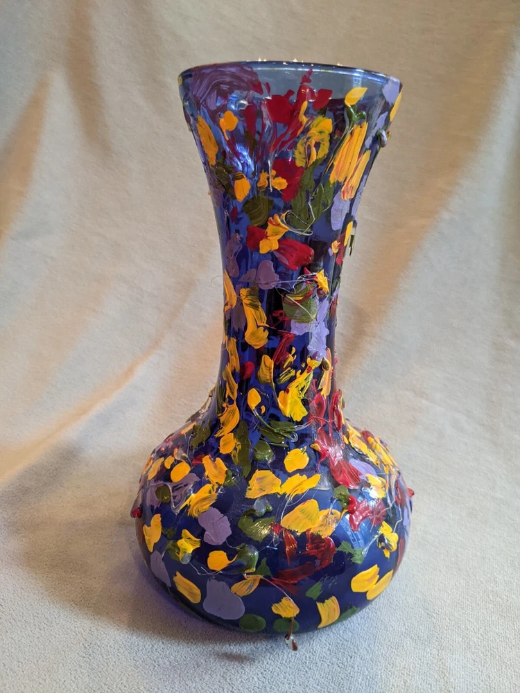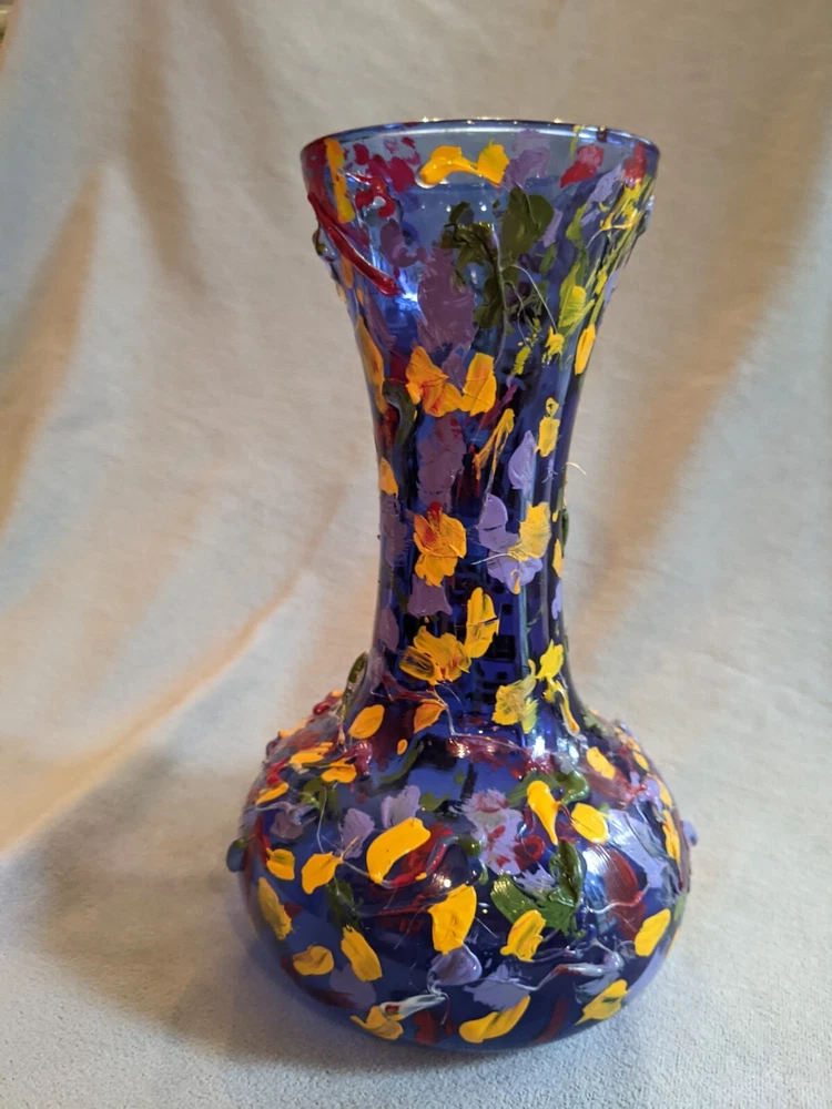 Beautiful Illusion Cobalt Glass Vase with Impasto Resin Abstract Art. The glass vase is in great condition, no cracks, chips, or repairs. It is made by Indian Glass, Cincinnati Ohio. Impasto Resin Abstract Art painting is by unknown artist. Beautiful decoration for your home or office. Dimensions: H: 7-7/8”; Dia.: 4-3/4”. Weight: 12 oz. What I pay for shipping is what you pay. Any shipping funds in excess of what I pay for shipping, I issue a shipping REFUND. Over 97% of my customers getting a shipping REFUND. GENERALLY shipping from my location (East Coast) to West Coast I ship UPS or FEDEX (Cheaper than USPS) and my West Coast Customers generally get a larger shipping REFUND. I template my shipping for the East Coast (where I live) so I can quickly get items listed in my eBay store: "Harvest Luna". I do not know beforehand the buyer and their location will be BEFORE they purchase the item. If you would ever like to make a deal on multiple items, I sell at my eBay store: "Harvest Luna" and to pay only one cost for shipping, I invite you to message or email me at any time.