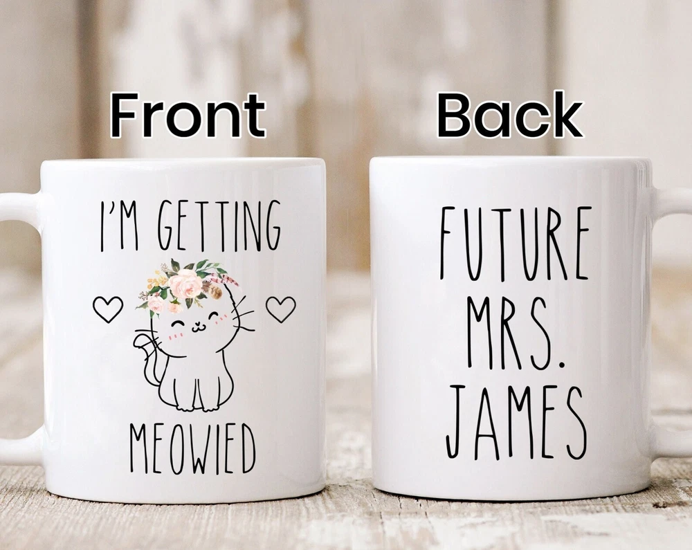 I'm Getting Meowied Custom Mug Cute Engagement Gift For Her Future Mrs Mug Product Details.. This high quality 11oz. ceramic white mug has a premium hard coat that provides crisp and vibrant color reproduction sure to last for years. Perfect for all hot & cold beverages. The highest quality printing possible is used. It will never fade no matter how many times you wash it. Material: 100% Ceramic. Print both sides. Dishwasher and Microwave Safe. High Gloss + Premium White Finish. Printed in the U.S.A. Personalized & Custom. We support personalized and custom mug to add custom, when placing an order, you can add notes to the "order note" in shipping address section. Also you can contact us directly via message. Shipping Info. Ready to ship in 1 to 2 business days, All products are made-to-order and proudly printed in the United States. Shipped by USPS and DHL, You will receive your order in 5-7 days. Replace & Refund. All products are defective during shipping broken, chipped will be replaced free of charge. You are not satisfied with the product, we will refund 100% money to you. If any other issues arise, please do not hesitate to message, we would be more than happy to assist you.