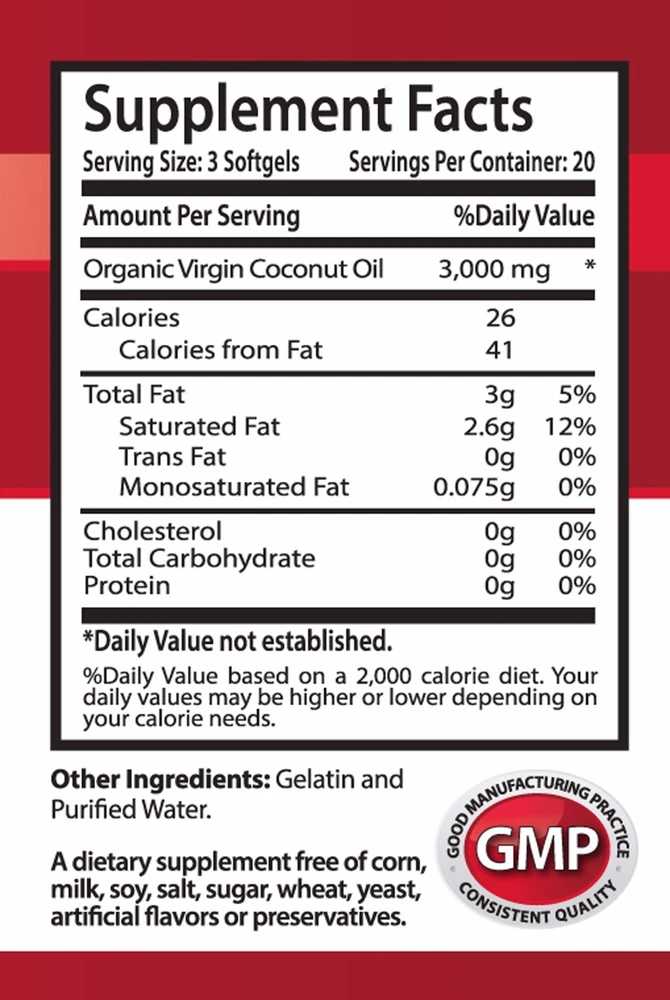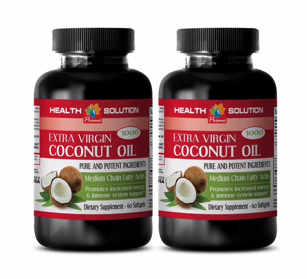 COCONUT OIL 3000 MG PURE AND POTENT INGREDIENTS IMMUNE AND BRAIN BOOSTER EXTRA VIRGIN Manufactured For Health Solution Prime Made in USA 1 Bottle, 60 Softgels BENEFITS: Boost immune system Cares your digestion Prevents premature aging of skin Fat burn and healthy weight loss Blood pressure support Detox and cleanse Cares your hair and skin Antibacterial About Coconut Oil "Tree of Life" Each and every part of the tree is used for one thing or the other. Its uses range from cosmetics to food and it is part of the diet in the tropic and subtropic regions. The fibrous husk is used to make coir ropes and mats, the shell is used for charcoal and the fruit is used for oil as well as in diet. Coconut water is one of the healthiest drinks on the planet. This sweet liquid is present in the young, green coconut. Coconut is a drupe and it has three layers: endocarp, mesocarp and exocarp. It is often described as a superfood as it has many health benefits. Coconut oil is rich in healthy fatty acids like capric acid and lauric acid. It also contains healthy saturated fat. The fat in coconut oil is easier to digest, has anti-fungal and anti-microbial properties and are not stored as fat readily. Coconut oil is used mainly in tropical countries but is now gaining popularity across the world. This oil contains three unique fatty acids that are responsible for its various health benefits: lauric acid, capric acid, and caprylic acid. These are some of the rarest substances found in nature and the reason why this oil is so beneficial. In addition, coconut oil also contains linoleic acid, oleic acid, phenolic acid, myristic acid, Vitamin E, Vitamin K, and iron. Coconut oil benefits a) May Protect liver and cares kidney infection . The medium-chain fatty acids present in coconut oil are known to have antibiotic properties. It kills the bacteria by destroying the lipid coating on it. b) Helps burn fat and lose weight The fatty acids in coconut oil help in burning more calories and losing weight. According to a research, coconut oil helps in reducing the abdominal fat in women. It also boosts metabolic rate of the body and this helps in burning more calories. c) Improves brain function Coconut oil boost memory in older people. F atty acids are readily absorbed by the body and they fuel the cells of the brain, helping them to function efficiently. d) Boosts immunity Lauric acid in coconut oil helps in fighting bacterial infection. Lauric acid creates an environment in the body that is toxic for the viruses. The healthy fats in coconut oil support immune. Coconut oil helps to suppress inflammation while supporting healthy metabolism. f) Helps in preventing bones problems Coconut oil is rich in antioxidants, which fight the free radicals. One of the main causes of bone problems is free radicals and coconut oil is a natural care for the condition. Coconut oil also improves the calcium absorption by the body. g) Heart health The main saturated fat in coconut oil is lauric acid. This type of saturated fat is shorter in length than other saturated fats. Lauric acid can be considered a medium chain triglyceride which acts differently in the body than longer saturated fats. Coconut oil, like other plant-based oils, does not contain cholesterol. The vast majority of the fats in coconut oil are medium chain triglycerides. These medium chain fatty acids found in coconuts have tremendous health benefits and are easy for the body to burn as fuel for energy. Coconut oil also contains antiviral, antifungal, antibacterial, and antimicrobial properties. SUPPLEMENT FACTS: Serving size: 3 softgels Servings per container: 20 Organic Virgin Coconut Oil 3000 mg Calories 26 Calories from Fat 41 Total Fat 3 g 5% Saturated Fat 2,6 g 12% Transfat 0 g 0% Monosatrurated fat 0,075 g Cholesterol 0 g Total Carbohydrate 0 g Protein 0 g Daily Value not established Other ingredients: Gelatiune and Purified water *These statements have not been evaluated by the Food and Drug Administration. This product is not intended to diagnose, treat, or prevent any disease. PREMIUM QUALITY PRODUCT