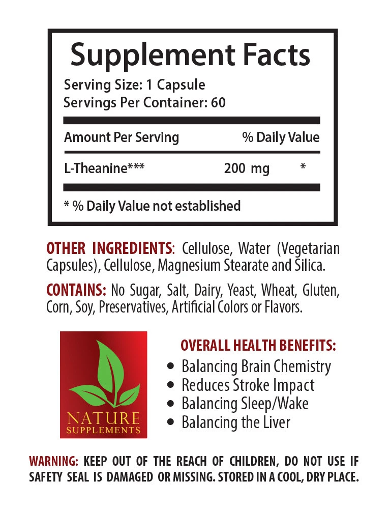 L-THEANINE 200MG Boost concentration and alertness Promote relaxation, reduce stress, and improve sleep Immune system booster Improve cognitive function and health Improve performance of mental tasks Boost learning and memory for Weight loss 3 Bottles 300 Capsules What is L-Theanine? L-Theanine is the amino acid compound that helps reduce stress levels and promotes a Calm, relaxed state of mind. Theanine may a distinct cognitive enhancement profile, however, theanine has many other surprising health benefits. It is used to help improve Mood and lower stress, and to protect the brain and heart function. Dietary supplements containing L-theanine are promoted for their ability to promote relaxation, reduce stress, and improve sleep, as well as boost concentration and alertness. What is it used for? L-theanine was discovered as a constituent of green tea in 1949 and was approved in Japan in 1964 for unlimited use in all foods, including chocolates, soft drinks, and herb teas, except infant foods. It also provides a unique umami taste and flavor to green tea infusion. L-theanine may help relieve stress by inducing a relaxing effect without drowsiness and may also possess Immune system beneficial attributes. Theanine may also have effects on the cardiovascular system and play a preventative role in cognitive function and health. Theanine for and Stress Taking our natural L-Theanine supplement may improve performance of mental tasks. This supplement may lower stress, along with the reduction of heart rates and blood pressure. Daily supplementation with l-theanine may lead to reduced . It may also promote relaxation and well-being. In addition, theanine may also have stimulating effects that promote relaxation. L-theanine is marketed as a dietary supplement on its own and as an ingredient in many formulas promoted for relaxation and stress reduction. Theanine Improves Brain Function L-Theanine supplementation helps increase attention and improve memory. A combination of L-Theanine and green tea extract may show the improvements in memory during a mental exercise. An improvement in attention may be also noticed by taking this theanine supplement as it may reduce stress and . This natural theanine supplement may improve cognitive performance, boost learning and memory, as well as reduce stress. Theanine Improves Cognitive function There’s a link between , reaction to stress, and the brain’s most fundamental function, maintaining cognition. L-theanine may be helpful in supporting cognitive function and preventing its loss. Theanine and caffeine are typically found together in tea. A combination of caffeine and theanine together significantly improves alertness, reduce fatigue, and improves task-switching accuracy. Theanine may be useful in controlling blood pressure. L-Theanine have somewhat different cognitive enhancement effects. (R) Theanine Helps with Weight Loss Theanine, along with other components of green tea may reduce fatty acid levels in the blood. L-Theanine due to its peneficial properties may help with Weight loss. L-Theanine may be indirectly useful for Weight loss by promoting a Calm and relaxed state of mind. As it helps to control stress and suppress overeating and contribute to control of Weight-gain. By helping to reducing stress and improve sleep, L-Theanine may be helpful for people looking to manage their Weight! L-Theanine Improves Sleep Quality This supplement with such powerful relaxing and stress-reducing effects would be used by some people to promote sleep. Actually, it’s true that using L-Theanine for sleep is one of the top L-Theanine benefits. L-Theanine supplement is a great way to improve quality of sleep and reduce time to fall asleep. This natural supplement may provide people a natural alternative to help promote healthy sleep. Using L-Theanine for sleep is a good option and it may help with sleep. Theanine May Enhance Immunity Theanine may boost the activity of Immune system functioning that may be useful for preventing the outside influence on the human body. High cortisol concentration in theanine supplement may be useful for Immune system and stimulates the Immune system. In the presence of stress, theanine helps to reverse this trend. Theanine decreased suppression of the Immune system caused by high cortisol from endurance exercise. Supplement Facts: L-Theanine 200mg Serving Size: 1 Tablet Servings Per Container: 100 Other Ingredients: Dicalcium phosphate, cellulose, vegetable stearin, cellulose gum, modified cellulose, silica, and magnesium stearate. Contains No sugar, salt, dairy, yeast, wheat, gluten, corn, soy, preservatives, artificial colors or flavors. SUGGESTED USE: As a dietary supplement, adults take one (1) tablet, one (1) to three (3) times daily between meals, or as directed by a health care professional. CAUTION: Do not exceed recommended dose. Pregnant or nursing mothers, children under the age of 18 and individuals with a known medical condition should consult a physician before using this or any dietary supplement. KEEP OUT OF THE REACH OF CHILDREN. DO NOT USE IF SAFETY SEAL IS DAMAGED OR MISSING. STORE IN A COOL, DRY PLACE. * GREAT QUALITY PRODUCT