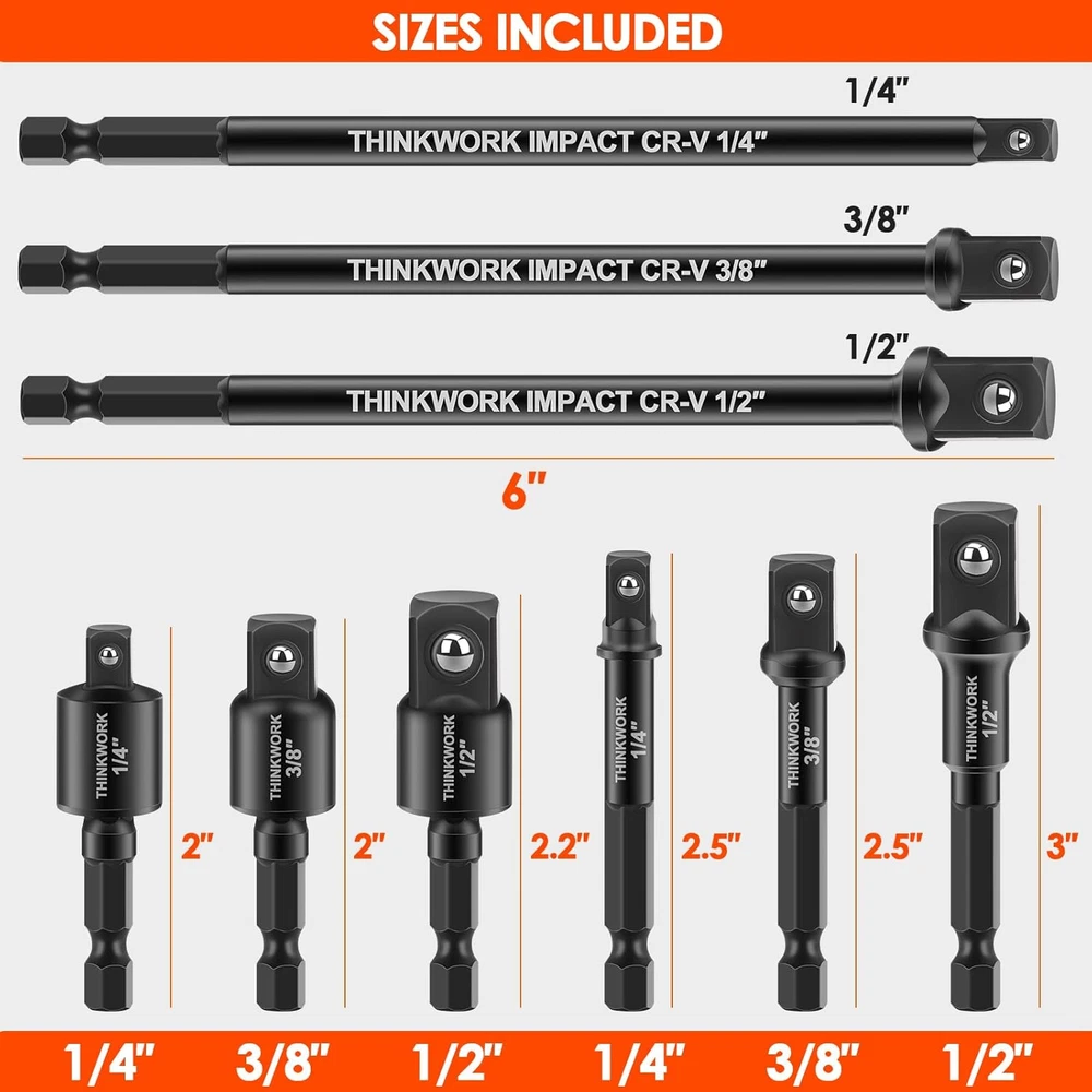 Store New Arrivals Add to Favorite View Feedback Contact Impact Socket Adapter Set, 1/4" 3/8" 1/2" Drill Socket Adapter, 1/4" Hex Shank Impact Driver Socket Adapter for Cordless Drill, Impact Driver, Power Drill, Impact Drill, 9-Piece Description Item model number PISA9S Style Longer Extension, Swivel-9pc Number of Pieces 11 Power Source hand_powered Color Black Material Chrome Vanadium Steel Country of Origin China Batteries Required? No Compatible Fastener Range 0.25 inches Drive System Hex, Square Item Weight 15.5 ounces Batteries Included? No Item Length 6 Inches Size One Size Included Components socket adapter Premium Quality: This impact adapter set is made from heat-treated and black phosphate coating treatment hardened chrome vanadium steel for superior durability. Secure Hold & Better Versatile: Spring ball of the impact drill adapters bearing on each square head to lock into sockets to avoid slipping securely during use. 1/4" hex shank for quick change with more flexibility. Clear Marking: Every drill adapter features high visibility laser etched size marking for easy identification. Well Organized: Thick & soft EVA inner keeps all the impact driver adapters organized and avoids scratching. Complete Sizes: Hex socket adapters including 1/4"F to 1/4"M socket adapter in 2.5" & 6" L, 1/4"F to 3/8"M socket adapter in 2.5" & 6" L, 1/4"F to 1/2"M socket adapter in 3" & 6" L, 3 pieces 360°rotatable socket adapter: 1/4"F to 1/4"M, 1/4"F to 3/8"M, 1/4"F to 1/2"M. Product Description Life is sweet, and every moment deserves to be appreciated. THINKWORK is a brand that offers professional tool products all over the world. We believe that "quality is better than quantity," to accomplish this better, THINKWORK puts quality first and offers our customers the best quality products. Must-Have Mechanic Tools It is a beautiful collection of everything you need to use. Whether experienced or a beginner, this impact grade socket adapter set is the ideal choice. Complete sizes Thick & soft EVA inner Secure hold & better versatile High visibility laser etched size High-strength chrome vanadium steel Heat-treated and black phosphate coating treatment Undisrupted Workflow Spring-loaded ball bearing provides a secure hold on sockets. Better Versatile 1/4" Hex shank for quick change with more flexibility. Premium Quality Made from heat-treated and black phosphate coating treatment hardened chrome vanadium steel for superior durability. ABOUT US We offer the best prices around on high quality products. Our E-store includes media such as books, movies, music and games while offering electronics, toys, sporting apparel, clothing, tools, general home, garden items and more. SHIPPING We are always working hard to ensure your package arrives as soon as possible. Please understand that some factors like weather, high postal traffic, and the performance of shipping companies are outside of our control. We offer free shipping to the lower 48 states and ship within 2 business days of payment, usually sooner. We do not accept P.O. Boxes. Please provide a physical address. For shipping outside of the continental USA, we only use eBay's Global Shipping Program.The item is shipped to KY and then sent to the rest of the world. International customers are responsible for all duties and taxes. Continue to check out in order to calculate costs for shipping the item to your country. Messages regarding eBay's Global Shipping Program MUST be directed at eBay EXCLUSIVELY. RETURNS We offer a 30-Day Return Policy on items which you are not completely satisfied with. You have the option for a full-refund or an exchange of the item. No returns are available on items shipped outside of the USA. PAYMENT We accept PayPal. CONTACT US This page content is yet to come Please ad us to your favorite seller and visit again later Thank You CUSTOMER SATISFACTION We try our very best to make sure every customer is completely satisfied. If there's a problem, message us! We're happy to help. WE ACCEPT Copyright © 2021 AutoDS. | All Rights Reserved