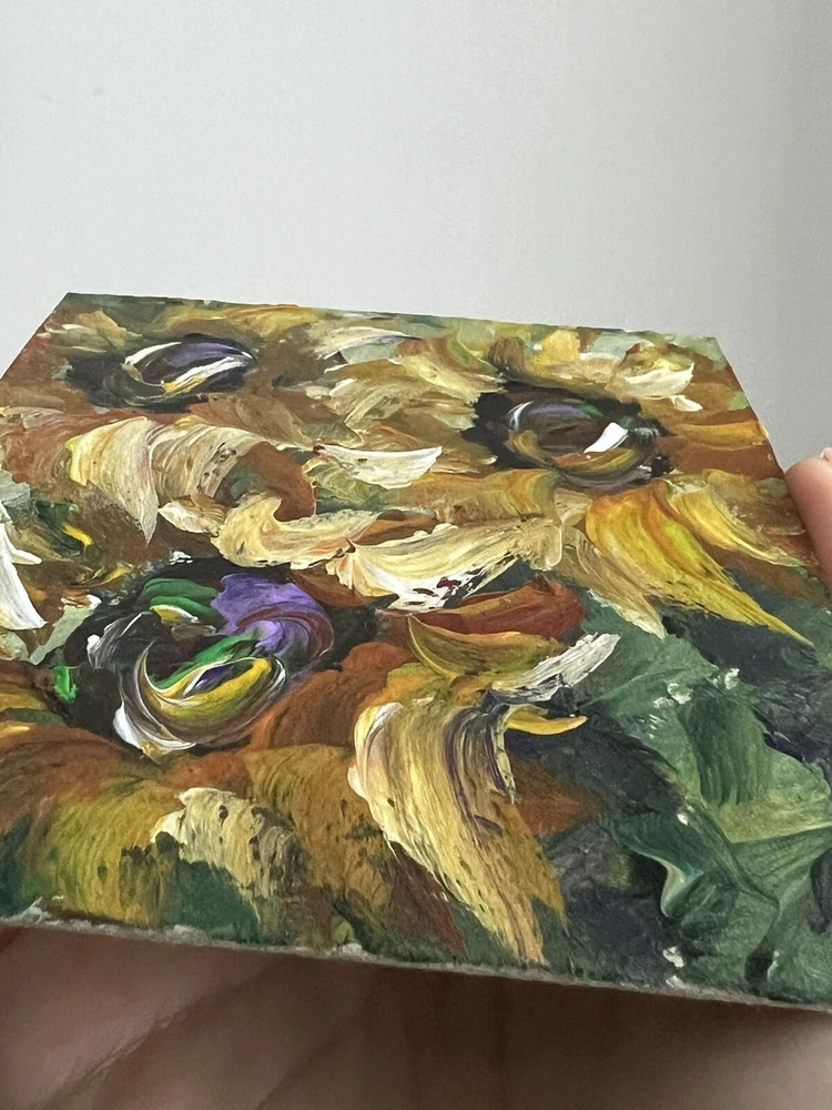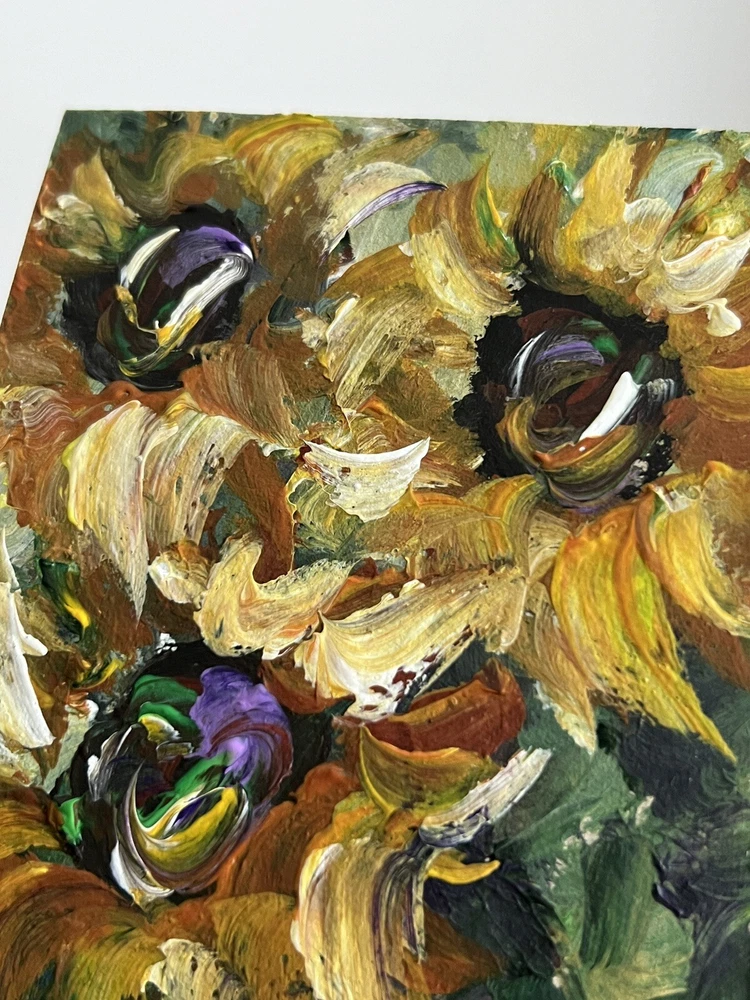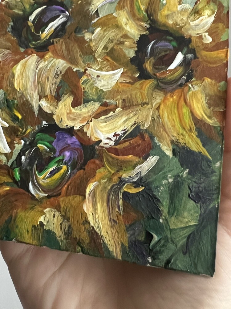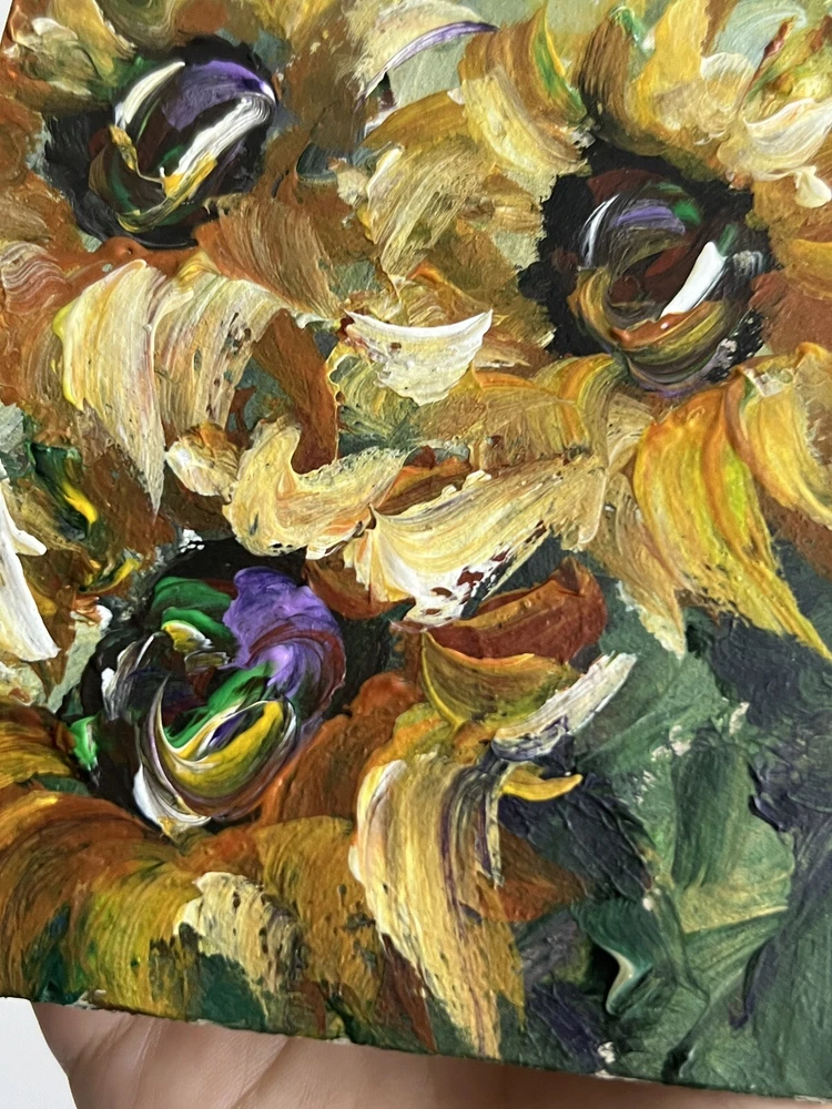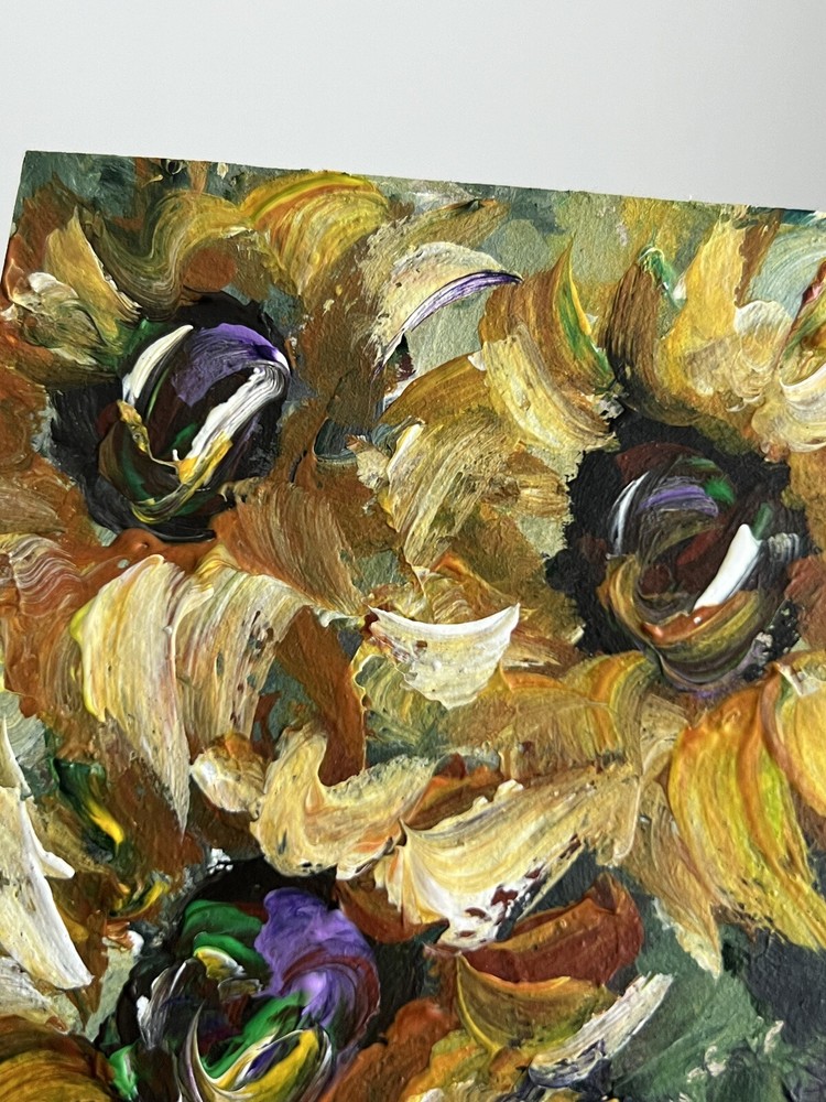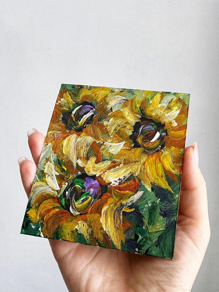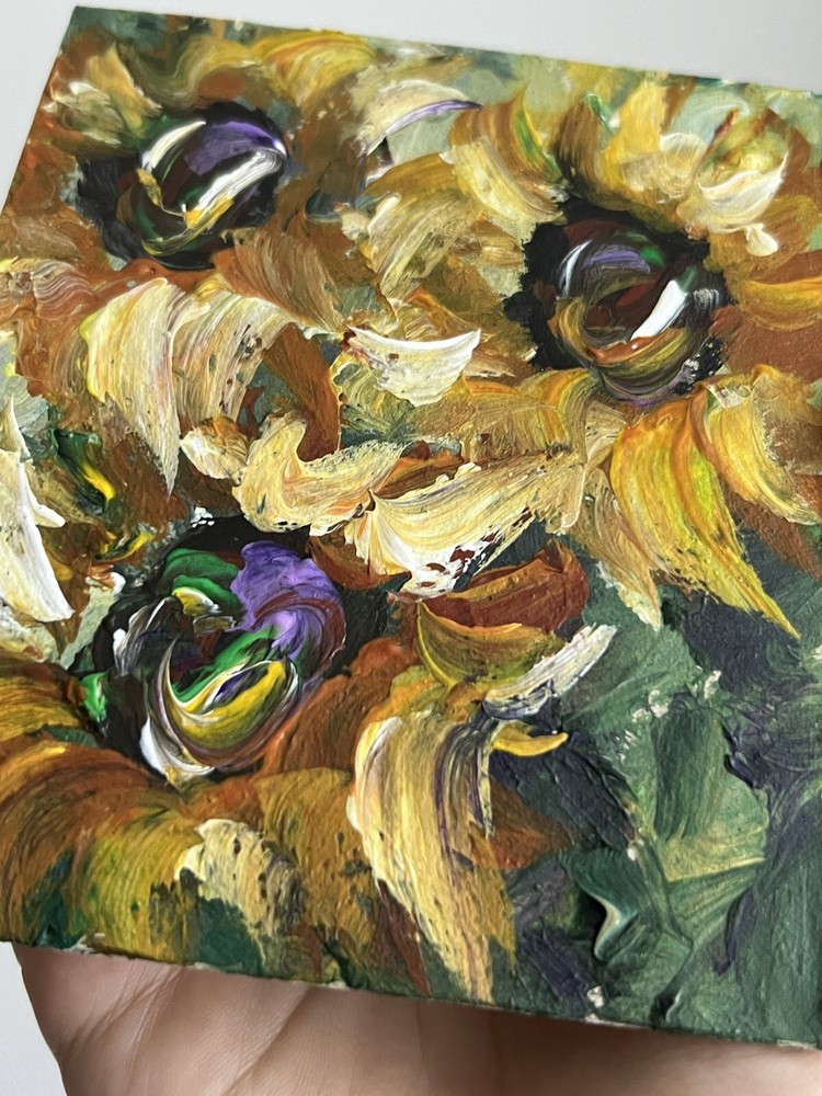 ๐ŸŒฟ Sunflowers acrylic painting. 100% hand painted Plein air impressionist art. Small floral painting. Original flowers art decor. ๐ŸŒฟ Original author's acrylic painting on thick cardboard . Unframed. Need a decorative frame. ๐ŸŒฟ Size: about ~ 10x12 cm / ~ about 4x5 inches ๐ŸŒท Signed from the back by Kateryna Oliynyk . ๐ŸŒฟ Materials: professional acrylic paints, cardboard ,. Unframed . Need a decorative frame. Or you can use a small stand / miniature easel.