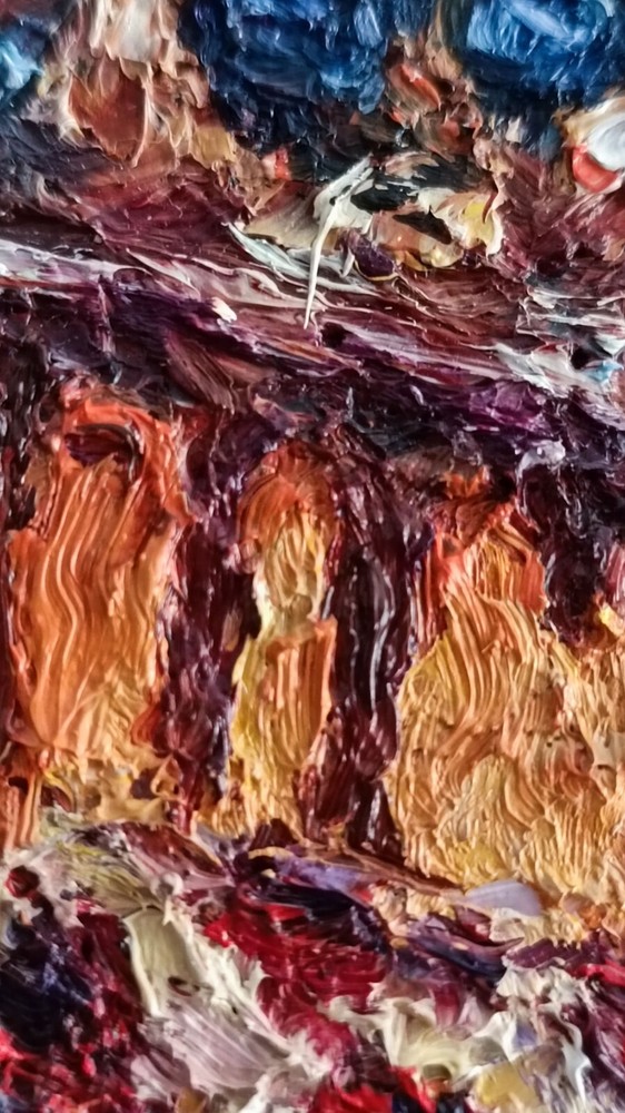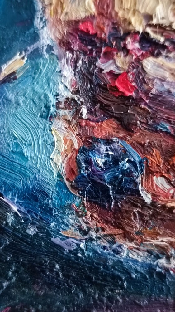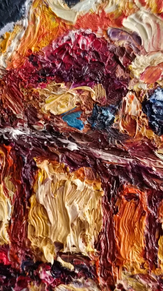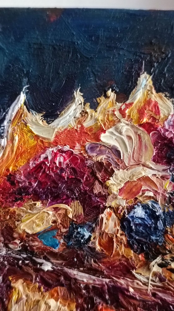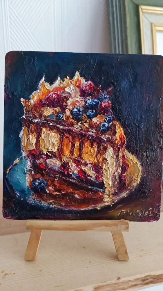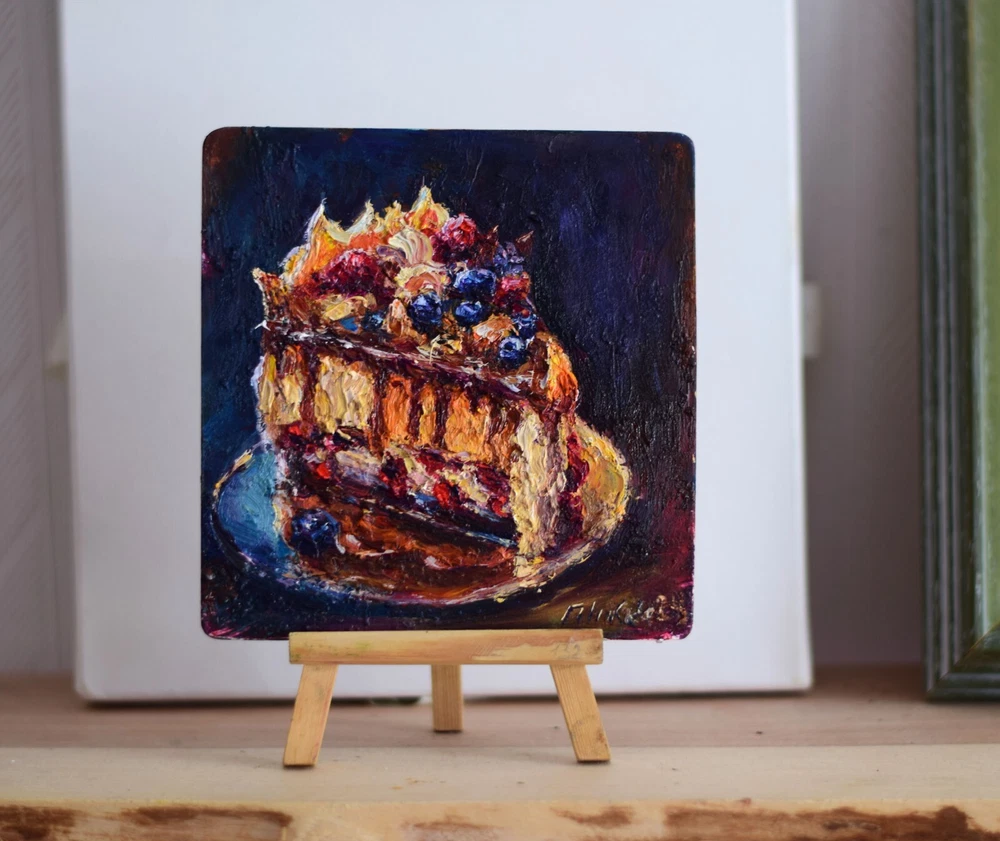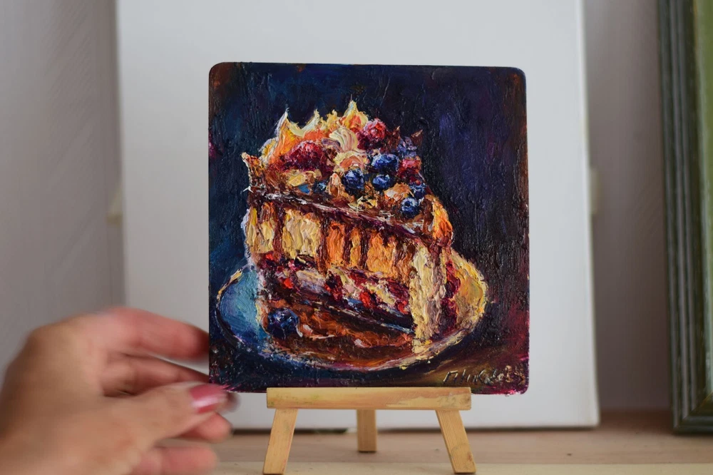 This stunning still life painting depicts a delightful dessert table with a mouth-watering raspberry-blueberry cake. Created by the talented artist Oksana Filinska, this contemporary piece expresses impressionism, modernism, and miniaturism styles. The painting is handmade using oil painting production technique on cardboard material, measuring 6 inches in height and 5 inches in width. The artwork is unframed and signed by the artist, making it an original piece from Europe. It is perfect for any art lover or food enthusiast who appreciates the beauty of still life paintings. This one-of-a-kind (OOAK) piece is sure to add a touch of elegance to any room and is produced in 2024.