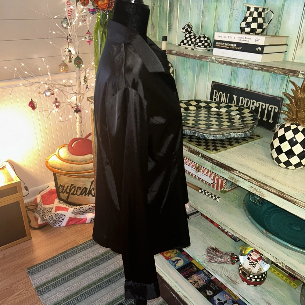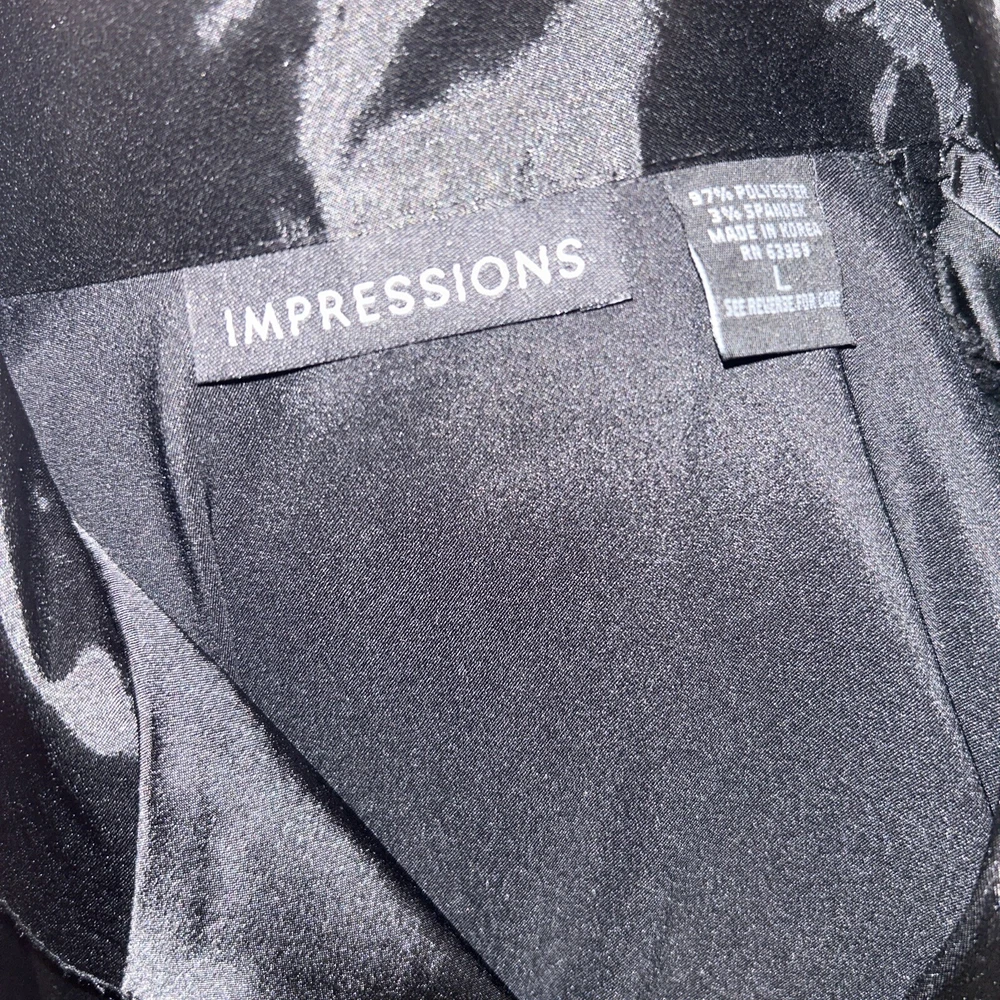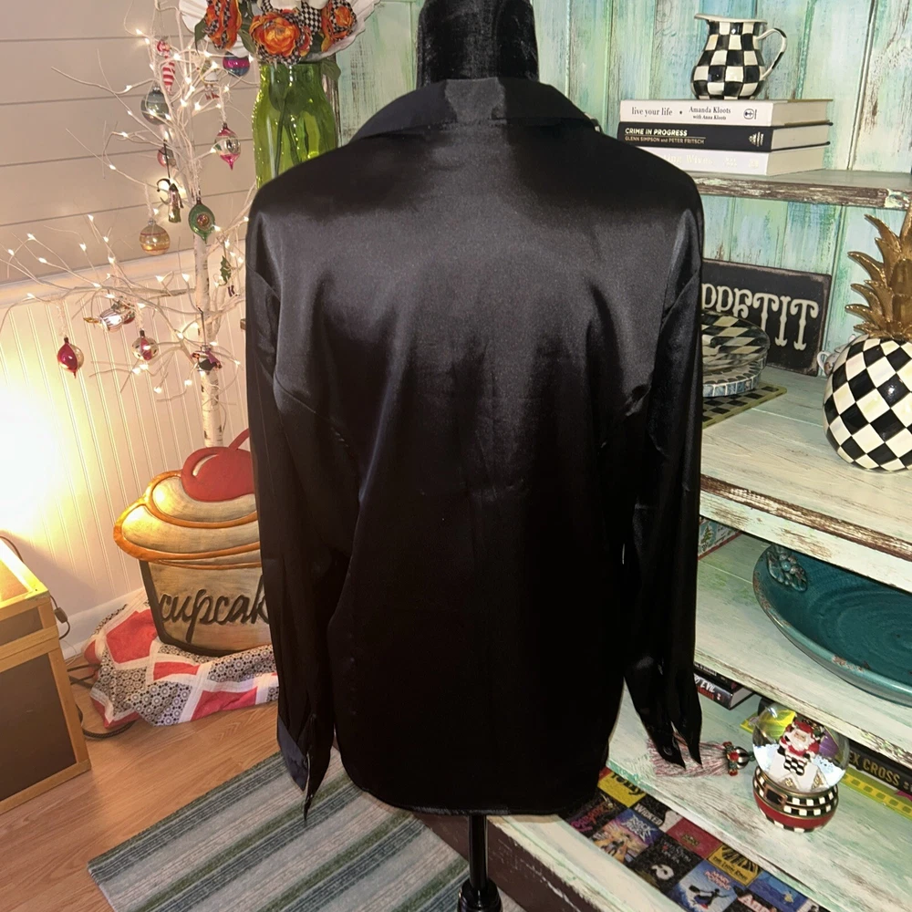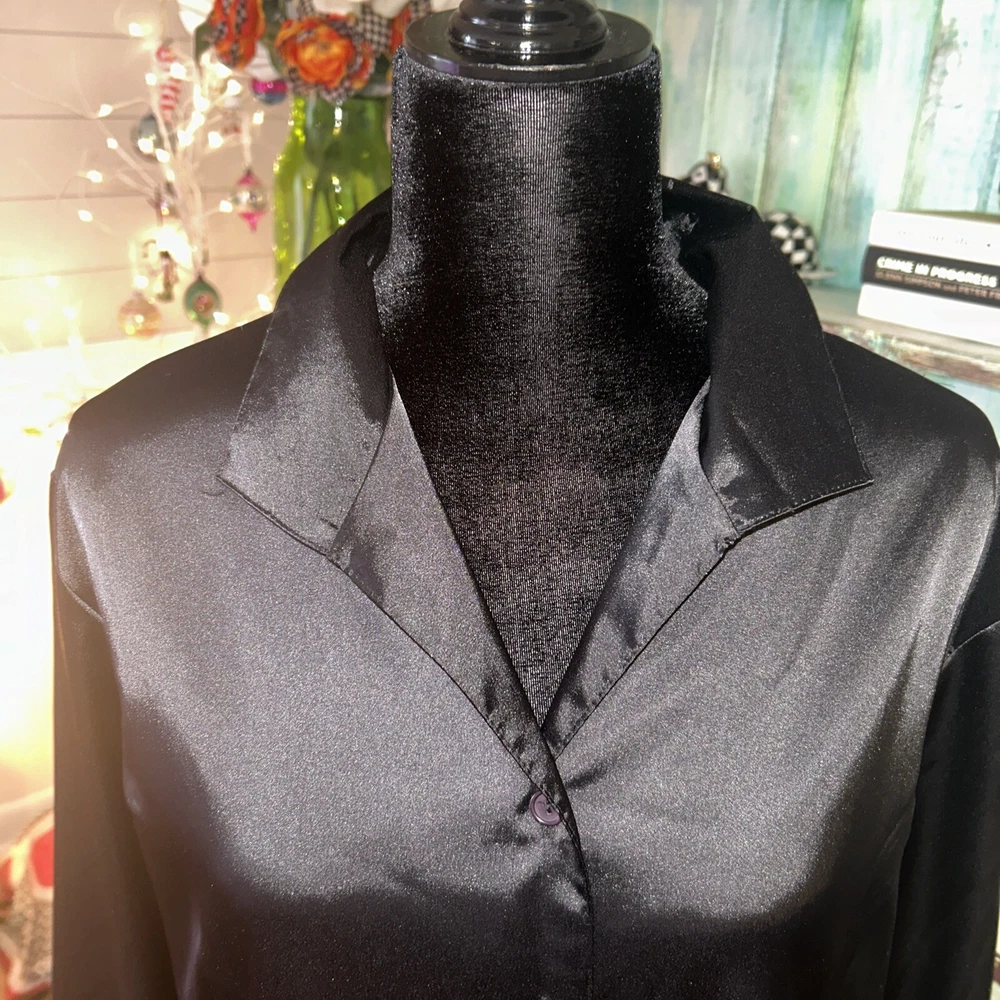 This is an Impressions black satin blouse in size Large, featuring a collared neckline, long sleeves with button closure, and a relaxed fit. Made from a blend of polyester and spandex, it has a vintage style with button accents. The blouse is suitable for various occasions including parties, casual outings, and business settings, and can be worn during all seasons - Winter, Summer, Fall, and Spring.