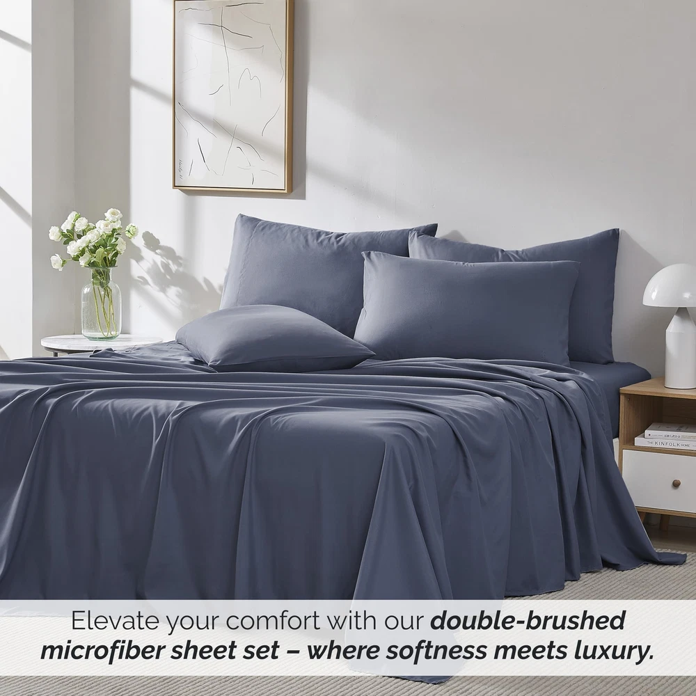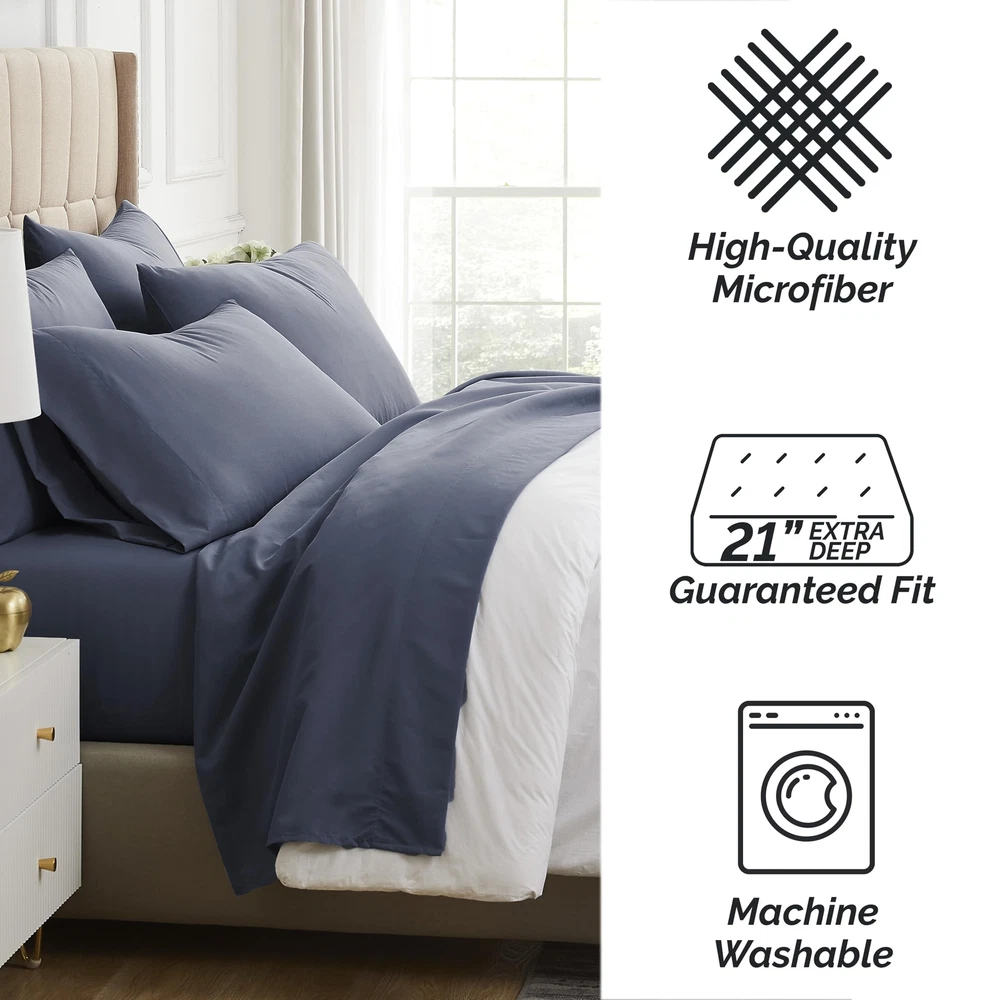 Are you tired of your fitted sheets not fitting properly on your mattresses and coming off? Our fitted sheets are 21 inches deep in size. This means they can easily fit your deep mattresses without coming off. The all-around elastic on our fitted sheets will cover your deep luxurious mattress and any toppers easily, no matter how much you toss and turn. These fitted sheets are premium quality and a snap to put on. We guarantee it. These sheets are our flagship product made with 110 GSM double-brushed microfiber fabric. Our unique method of brushing both sides makes these extremely soft and comfortable. With 21-inch deep pockets, these sheets are truly extra-deep Pocket sheet sets. Made under our trademarked Brand , Inc., a lot of attention has been paid to every aspect of the product. Starting from fabric feel, to stitching and even custom packaging. COMES WITH MANUFACTURER's ONE YEAR WARRANTY FROM DATE OF PURCHASE. Cleaning Instructions: Machine Wash Cold before use and with like colors. Tumble Dry low setting. Do not use Bleach. Remove Promptly. Luxury Lifestyle at Incredible Value: Luxurious, comfy Queen size sheet set in ultra-soft brushed microfiber for the most cozy and restful sleep you've ever had; No-shrink, no-fade, no-pill material stays beautiful for the life of the sheets. Queen Sheet Set Deep Pocket: The 21" deep queen fitted sheet has strong elastic around the entire hem to stay tucked on thick mattresses and toppers, including pillow-top, Euro-top, foam toppers. No more slipping or untucking. Softer with Every Wash: Heavenly softness that gets better with each wash. Comfy Queen size sheets that wrap you in silky smoothness for a luxurious sleep. Lightweight and breathable, perfect for year-round use. Fade-Resistant & Durable: These bed sheets, queen size bed, are Machine washable and tumble dryable, our sheets stay vibrant and fresh as new, wash after wash. Choose from many colors to suit your bedding and home décor aesthetic. 6-Piece Deep Pocket Sheets Queen Size Bed Set Includes: (1) Fitted Sheet 60" wide x 80" long x 21" Deep; (1) Oversize Flat Sheet 90" wide x 102" long; (4) Pillowcases 20" wide x 30" long