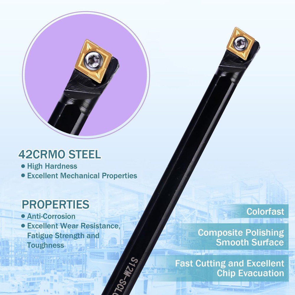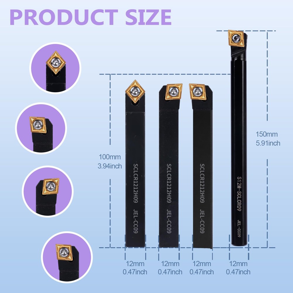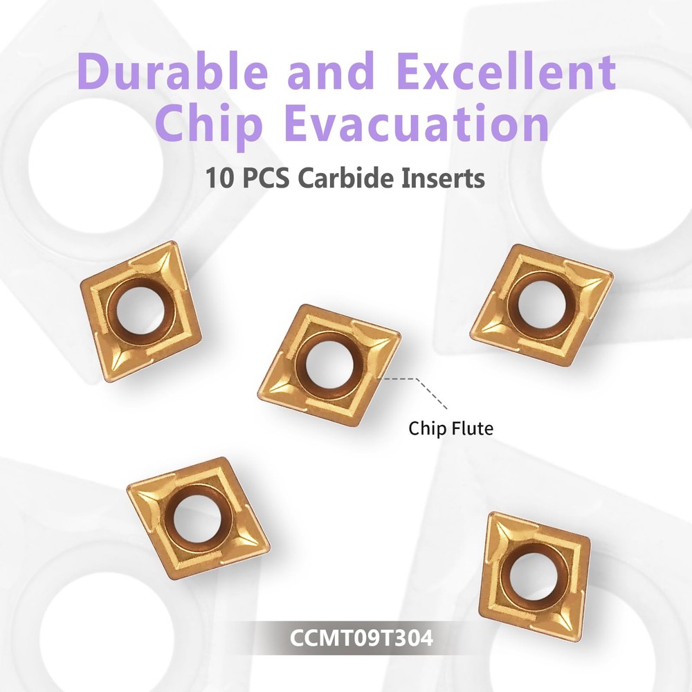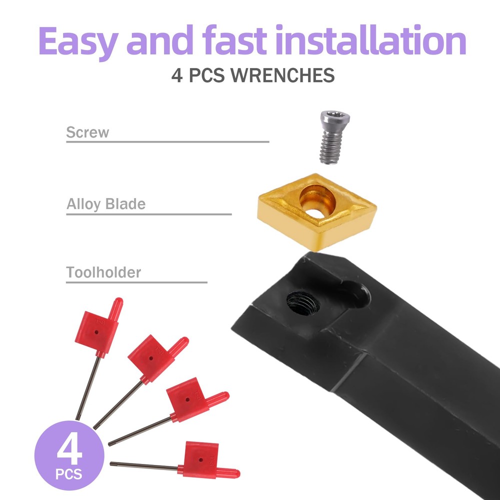 Material: The tool handle is made of high-quality 40Cr steel, which is high-strength and wear-resistant; the blade is made of carbide material, which is strong and sharp, with excellent cutting performance and chip removal effect. Package include: 4pcs 1/2" turning tool holders(S12M-SCLCR09,SCLCR1212H09,SCLCL1212H09,SCMCN1212H09),10pcs carbide insert (CCMT09T304) and 4pcs matched wrenches. High precision: Each model is designed with precision calculations and craftsmanship to provide precise cutting performance. They are typically used forturning, facing, finish turning, external grooving, and more. Wide range of uses: The inserts are made of carbide, making our turning tools suitable for a wide variety of materials including steel, stainless steel, cast iron and more. This makes the tool more versatile and able to adapt to the turning needs of different materials. Maintenance and after-sales: The surface of the tool holder is coated with anti-rust oil to ensure long life and excellent durability of the product, please do not clean it. Unsatisfied with the product for any reason, please contact us and we will respond quickly.
